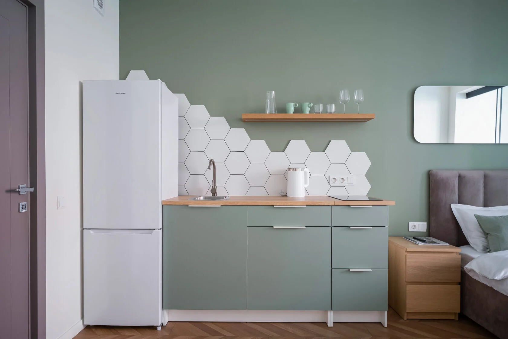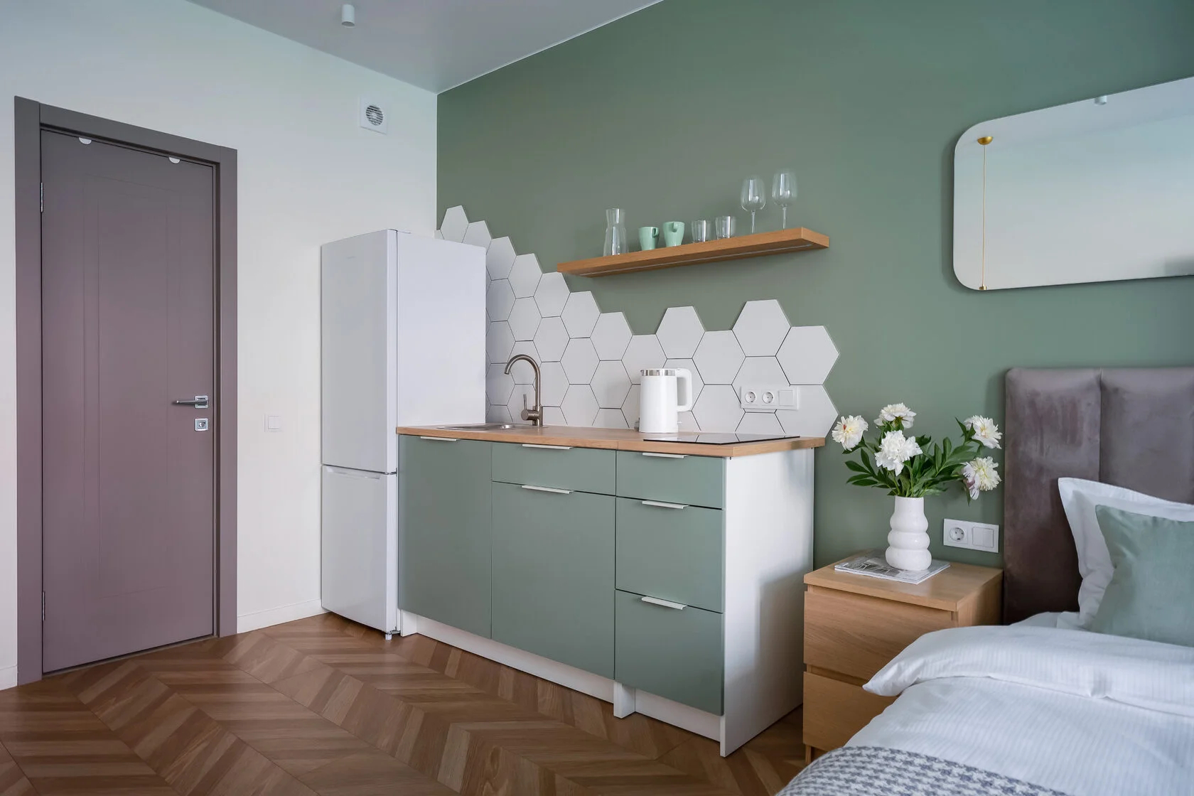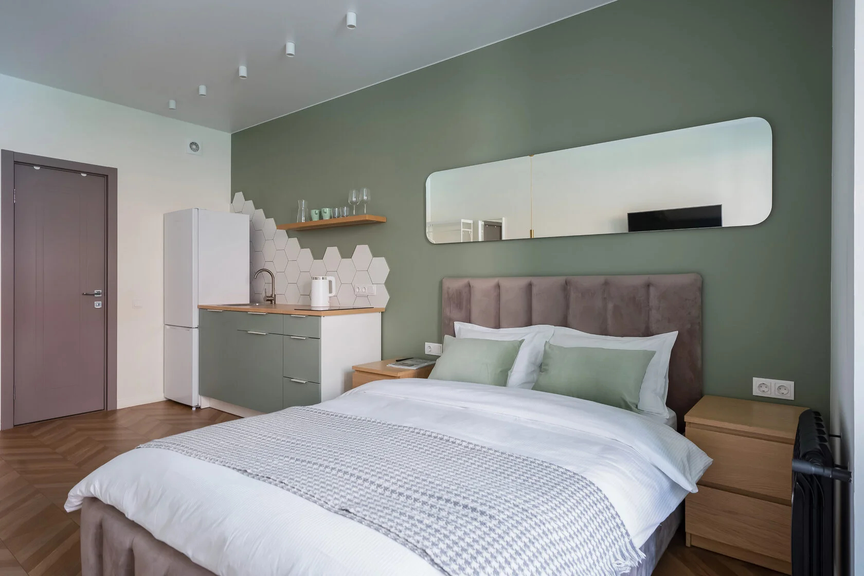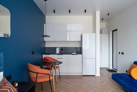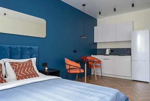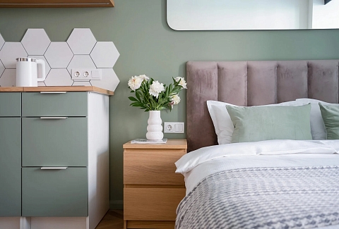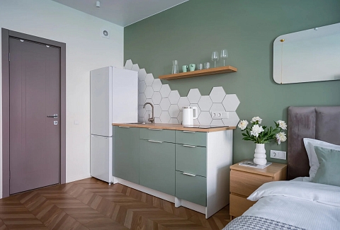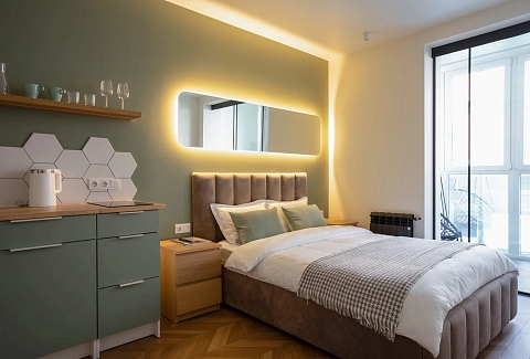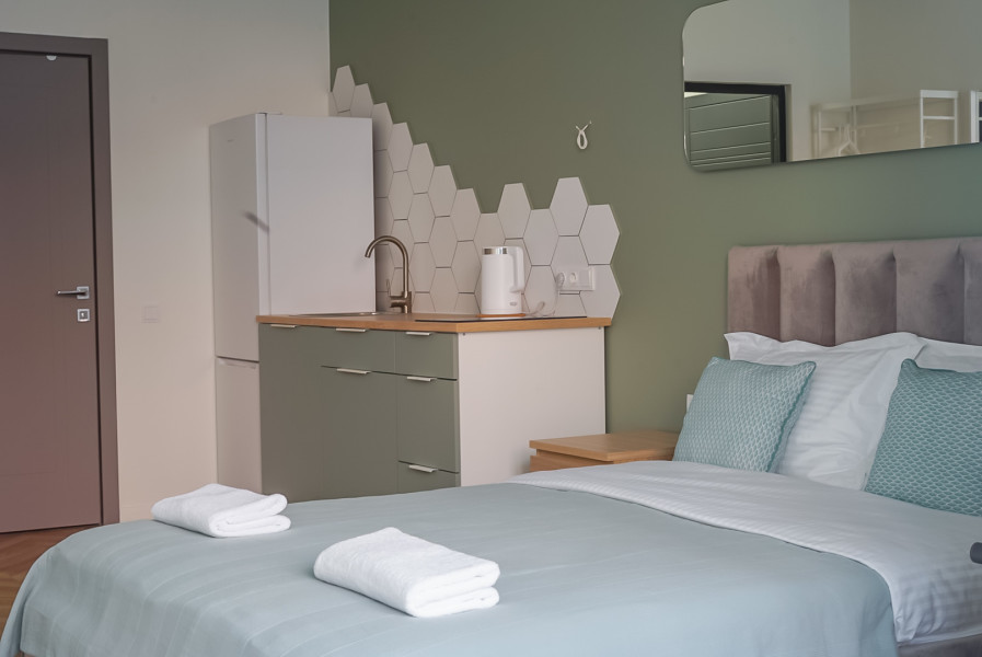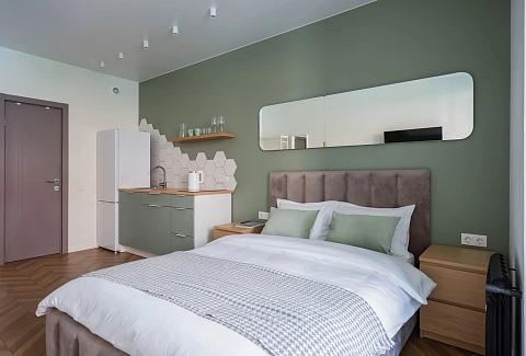 В номере: зеркало, кровать двуспальная, кухонная мебель, прикроватные тумбочки, стол, стулья, шкаф, кофемашина, микроволновая печь, набор посуды, плита электрическая, телевизор ЖК, утюг, холодильник, электрочайник
