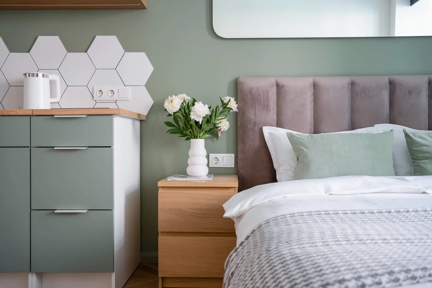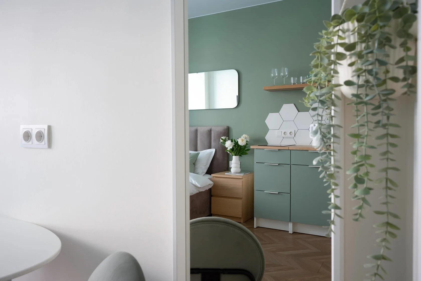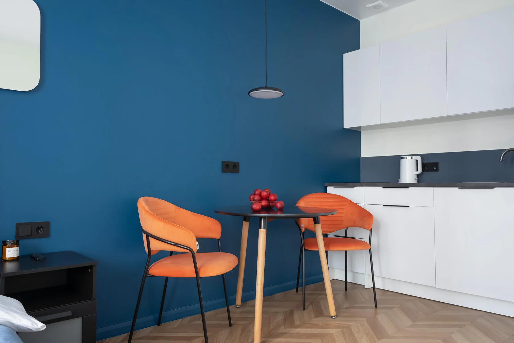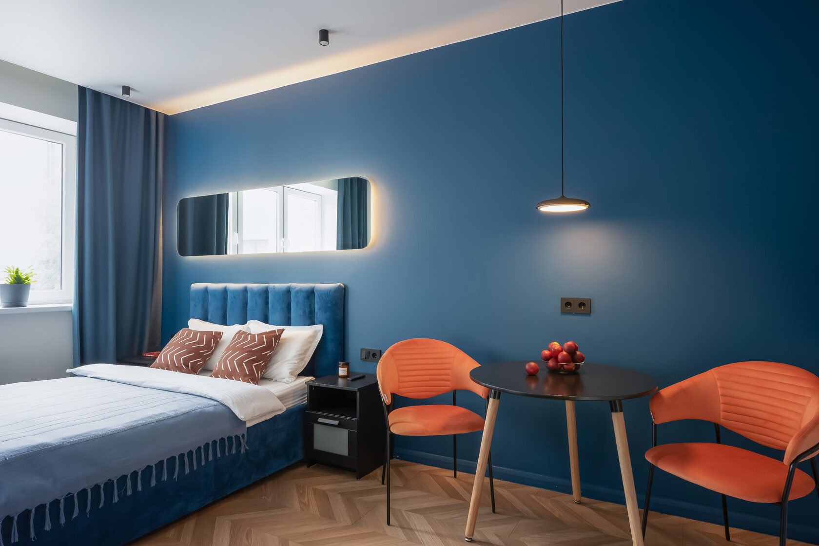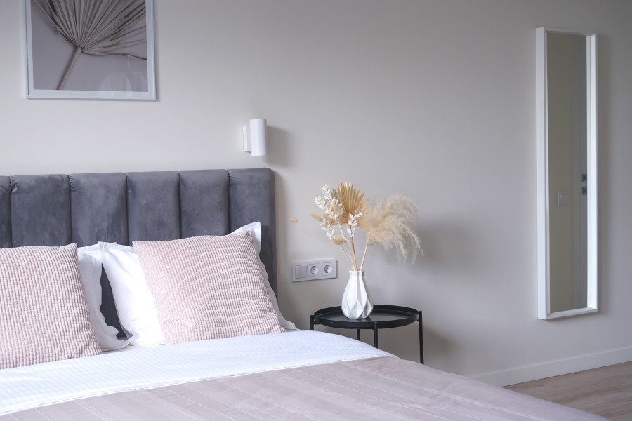 В номере: зеркало, кровать двуспальная, кухонная мебель, прикроватные тумбочки, стол, стулья, шкаф, кофемашина, микроволновая печь, набор посуды, плита электрическая, телевизор ЖК, утюг, холодильник, электрочайник