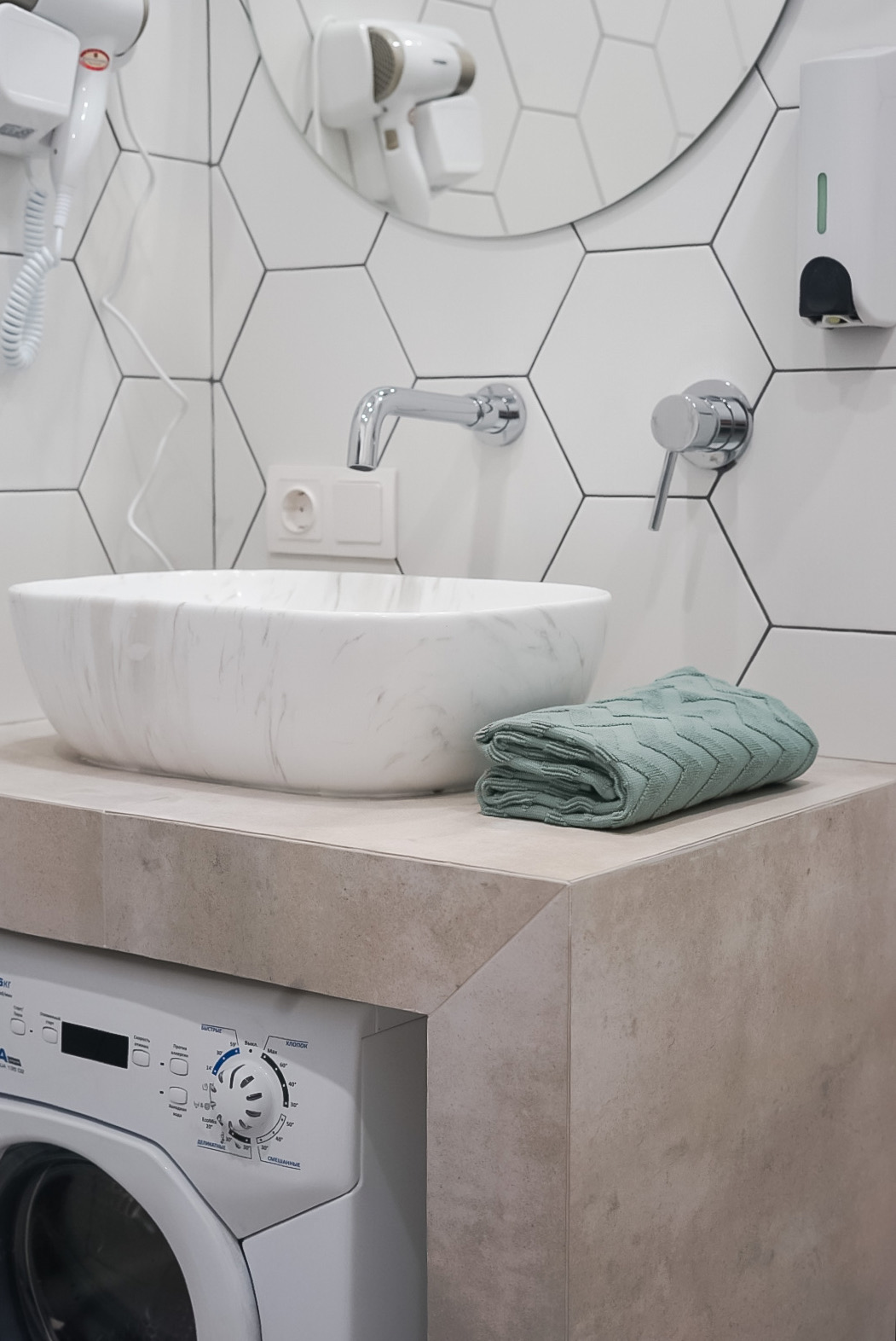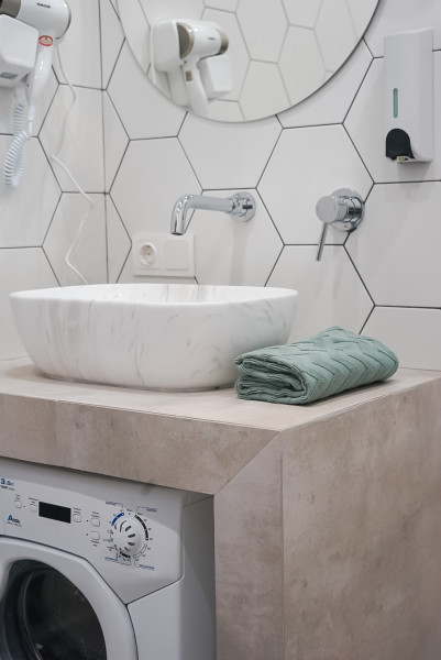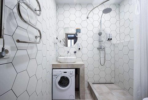 В номере: вешалка, зеркало, кровать двуспальная, кухонная мебель, прикроватные тумбочки, стол, стулья, шкаф, кофемашина, микроволновая печь, набор посуды, плита электрическая, стиральная машина, телевизор ЖК, холодильник, электрочайник