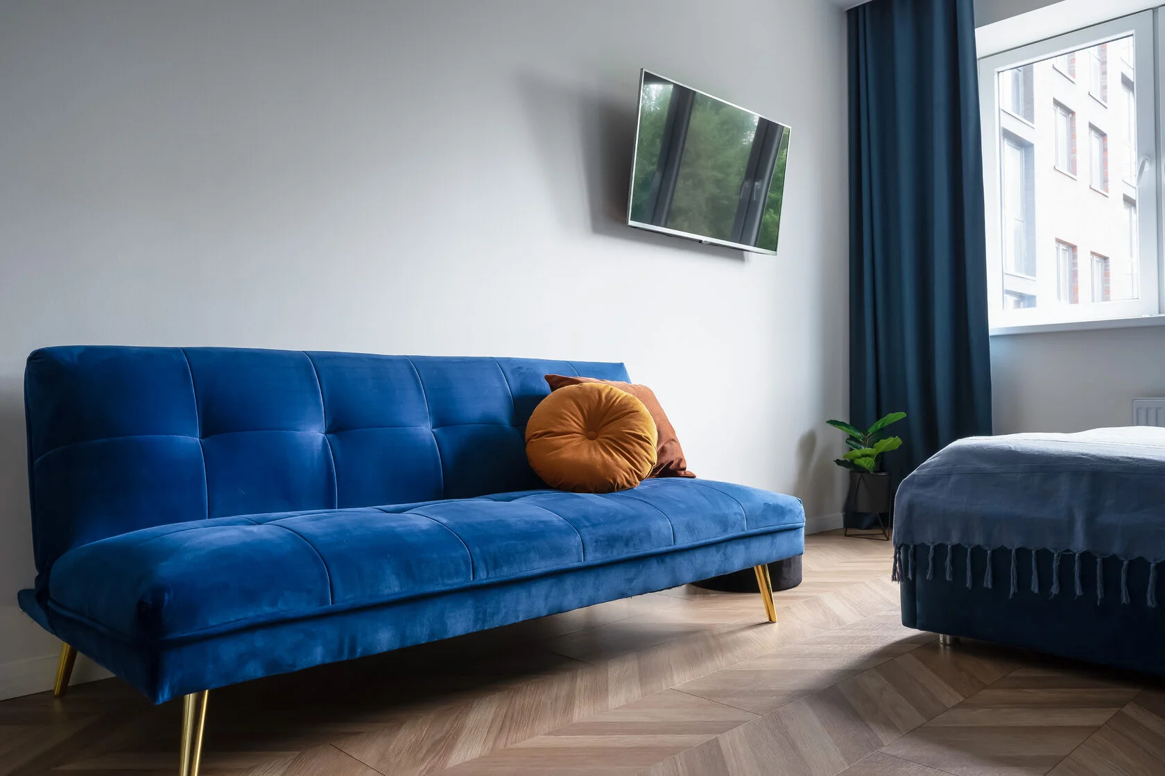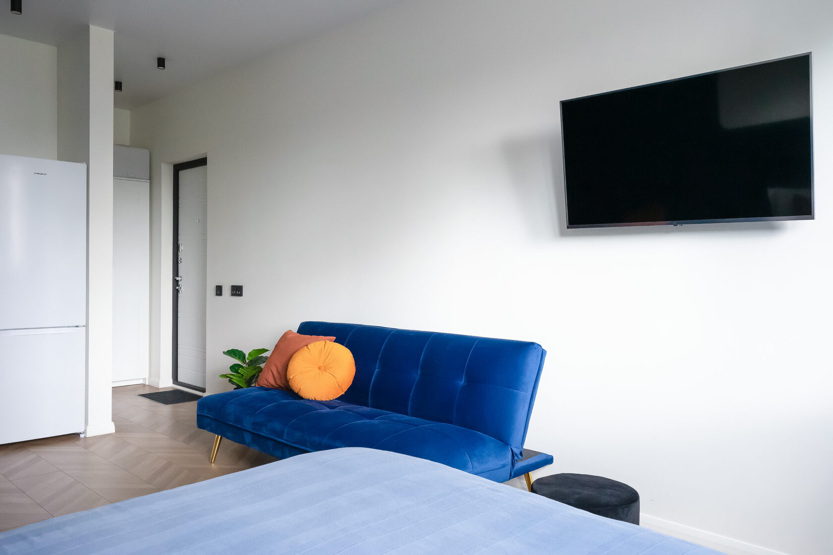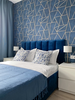 В номере: вешалка, диван раскладной, зеркало, кровать двуспальная, кухонная мебель, прикроватные тумбочки, стол, стулья, шкаф, духовой шкаф, кофемашина, микроволновая печь, набор посуды, плита электрическая, стиральная машина, телевизор ЖК, утюг, холодильник, электрочайник