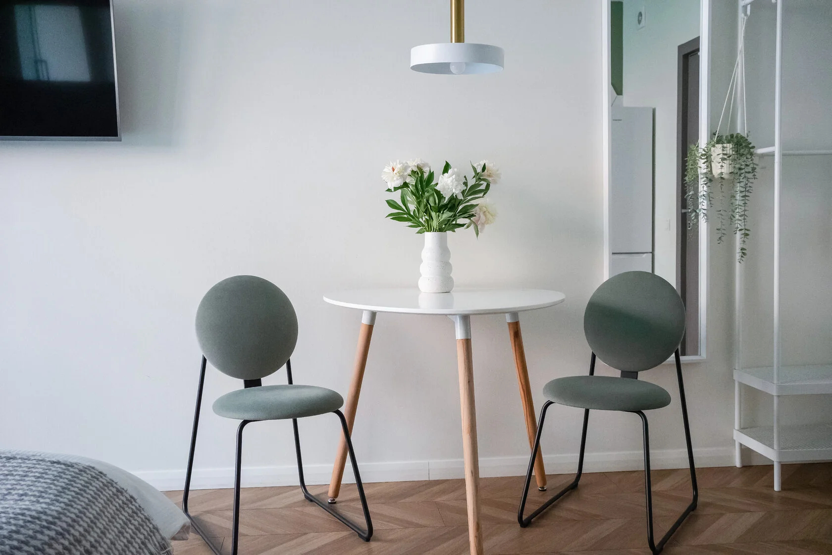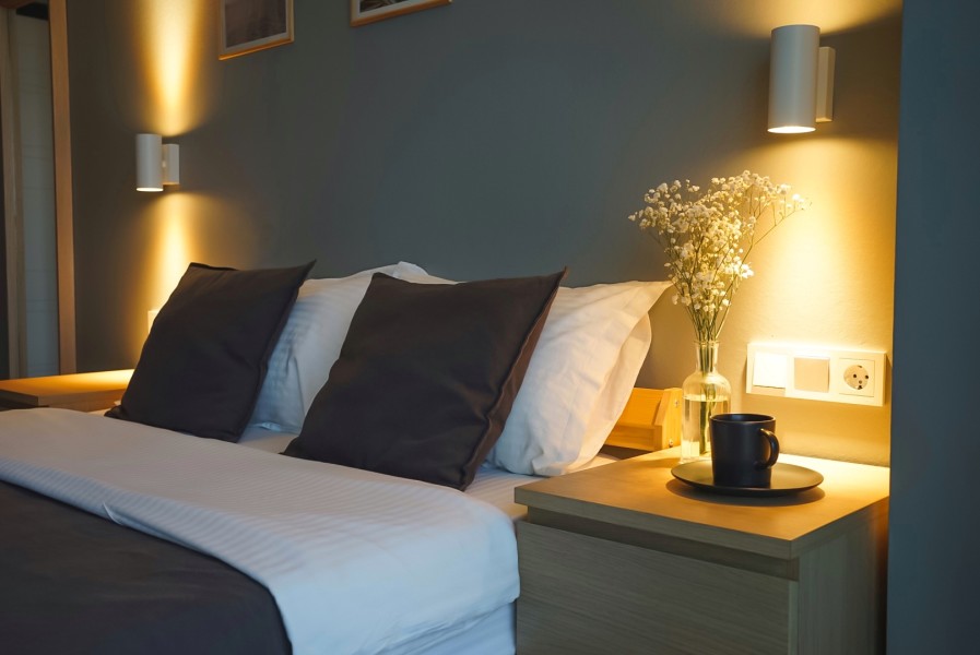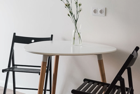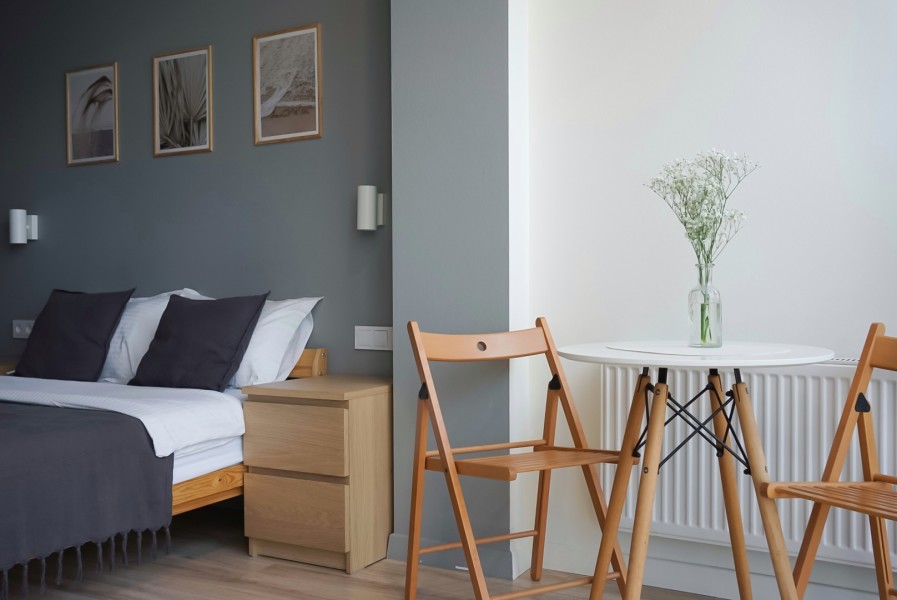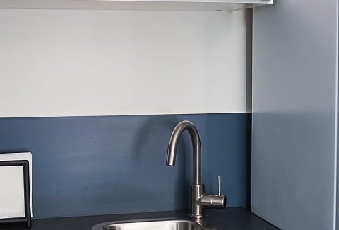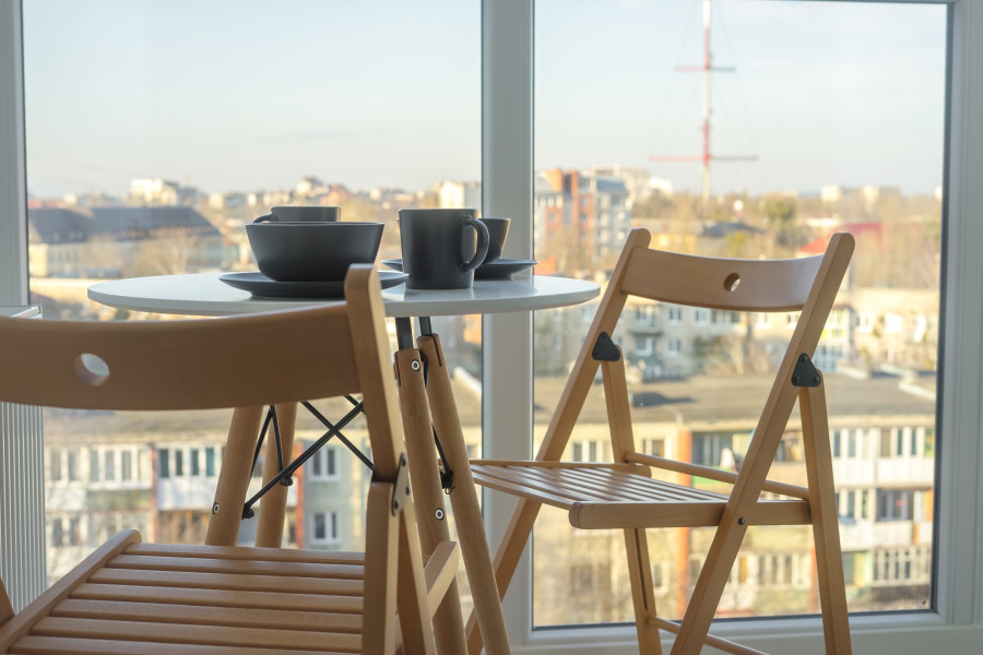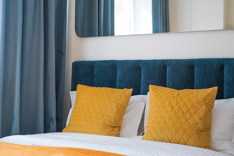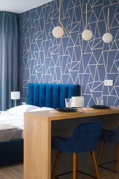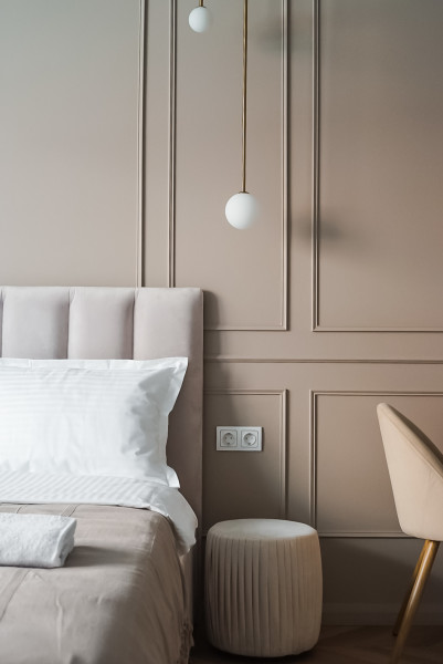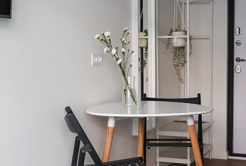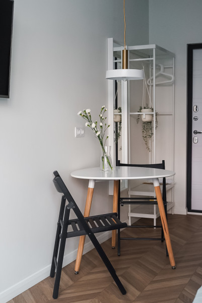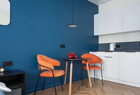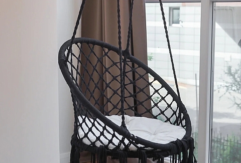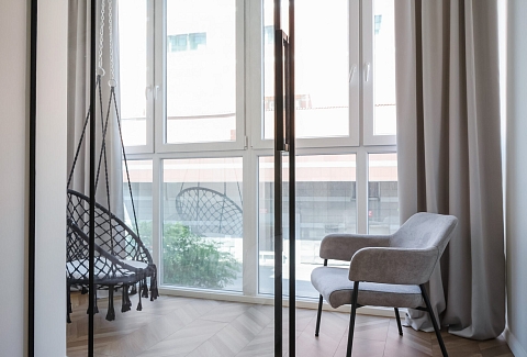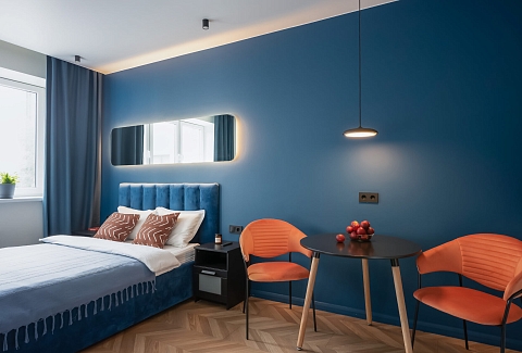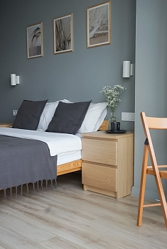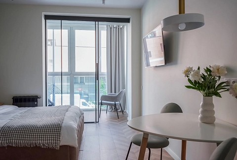 В номере: вешалка, зеркало, кровать двуспальная, прикроватные тумбочки, стол, стулья, шкаф, кофемашина, микроволновая печь, набор посуды, плита электрическая, стиральная машина, телевизор ЖК, утюг, холодильник, электрочайник