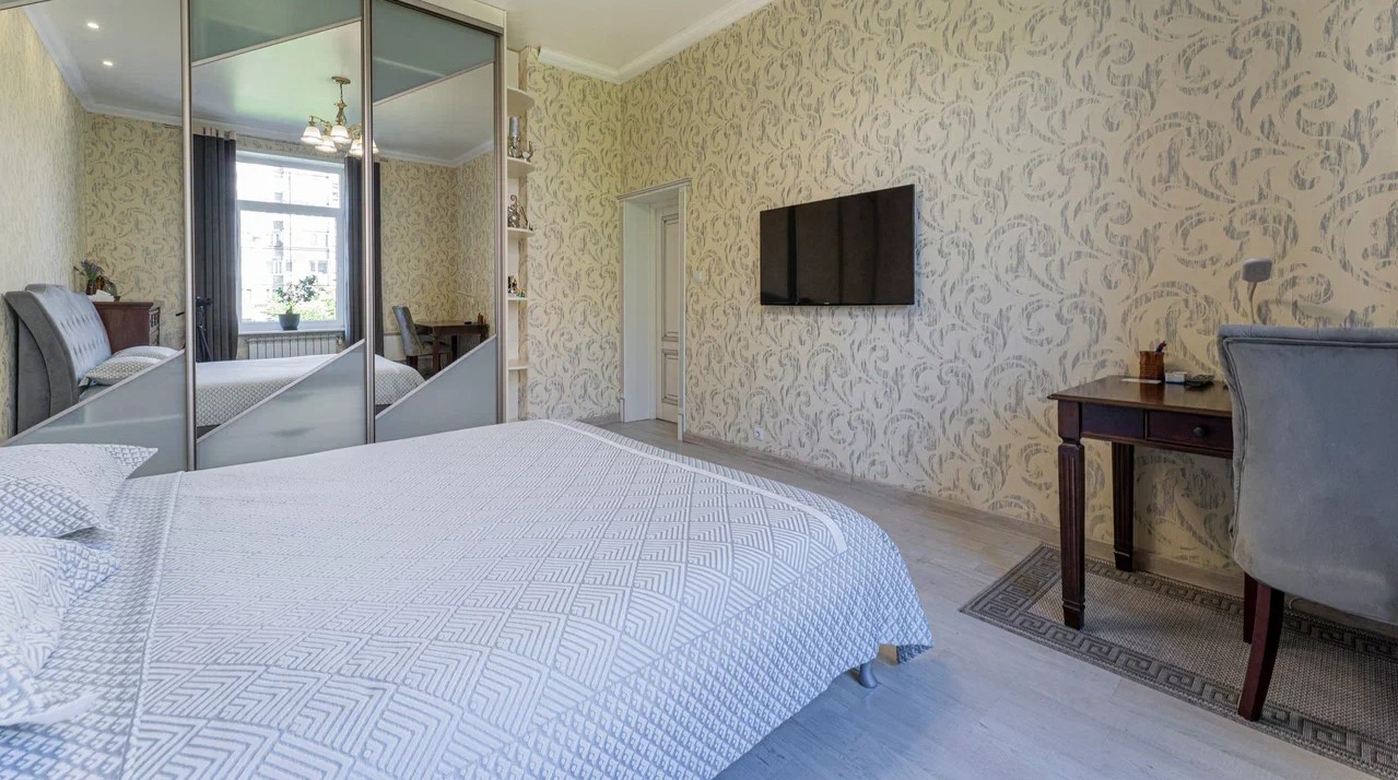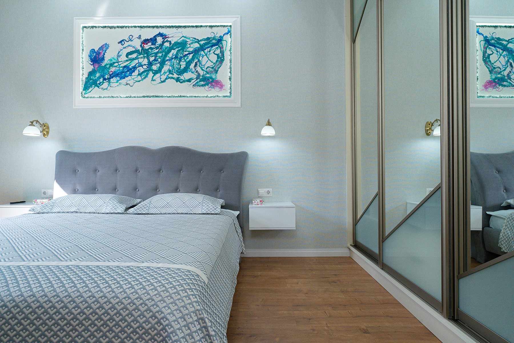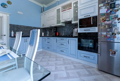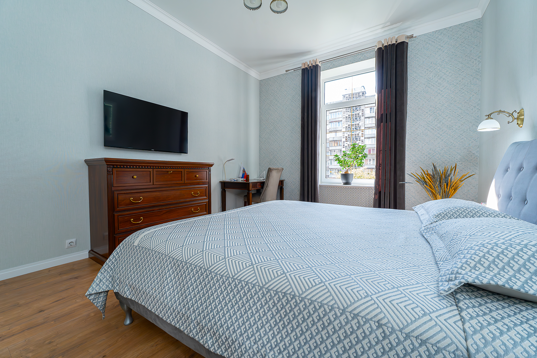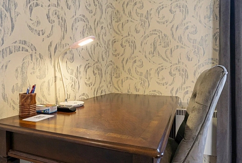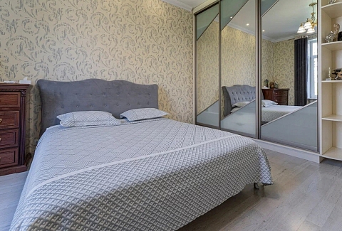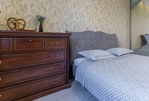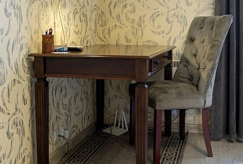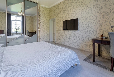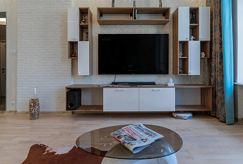 В номере: вешалка, зеркало, кровать двуспальная, прикроватные тумбочки, стол, стулья, шкаф, гладильная доска, кофемашина, микроволновая печь, музыкальный центр, набор посуды, плита электрическая, посудомоечная машина, стиральная машина, телевизор, утюг, холодильник, чайный набор посуды, электрочайник