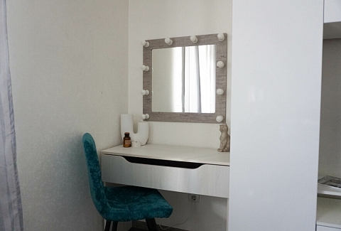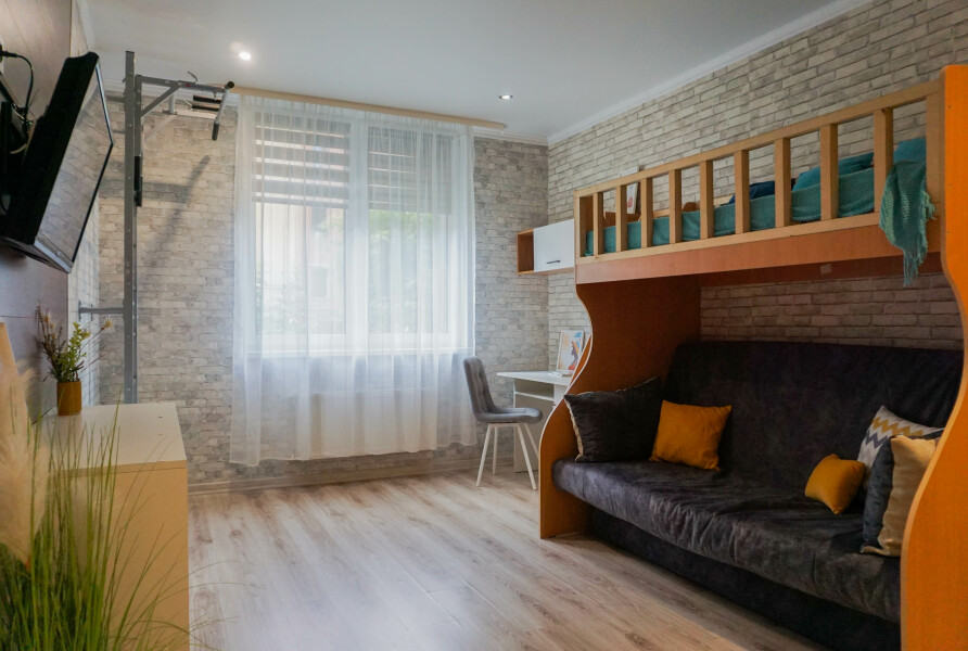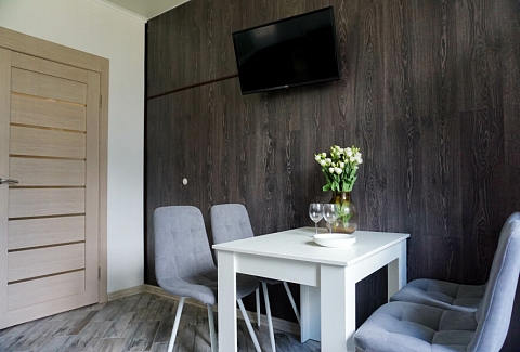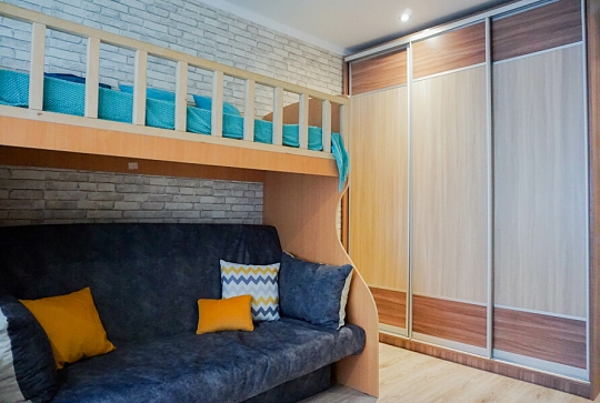 В номере: вешалка, диван, зеркало, кровать двуспальная, кровать двухъярусная, стол, стулья, шкаф, гладильная доска, духовой шкаф, кондиционер, микроволновая печь, набор посуды, плита электрическая, стиральная машина, сушилка для белья, телевизор ЖК, утюг, холодильник, чайный набор посуды, электрочайник