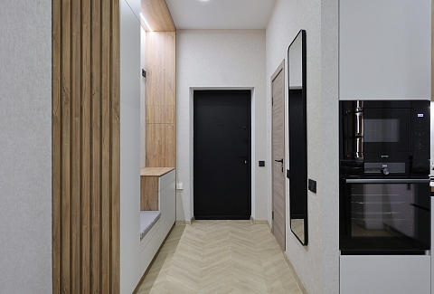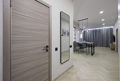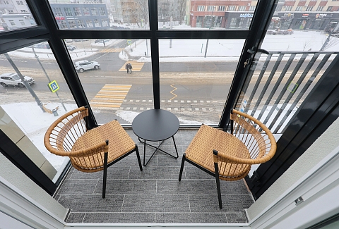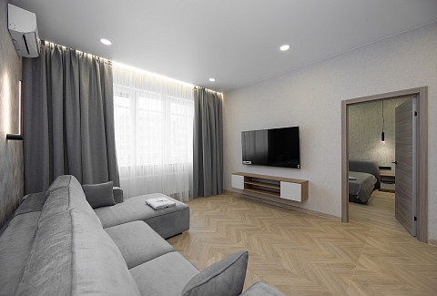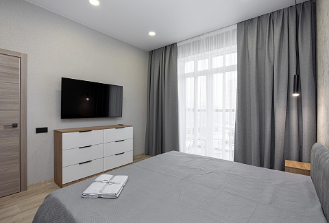 В номере: диван, зеркало, кровать двуспальная, стол, стулья, шкаф, гладильная доска, духовой шкаф, кондиционер, микроволновая печь, набор посуды, плита, стиральная машина, сушилка для белья, телевизор ЖК, утюг, холодильник, чайный набор посуды, электрочайник