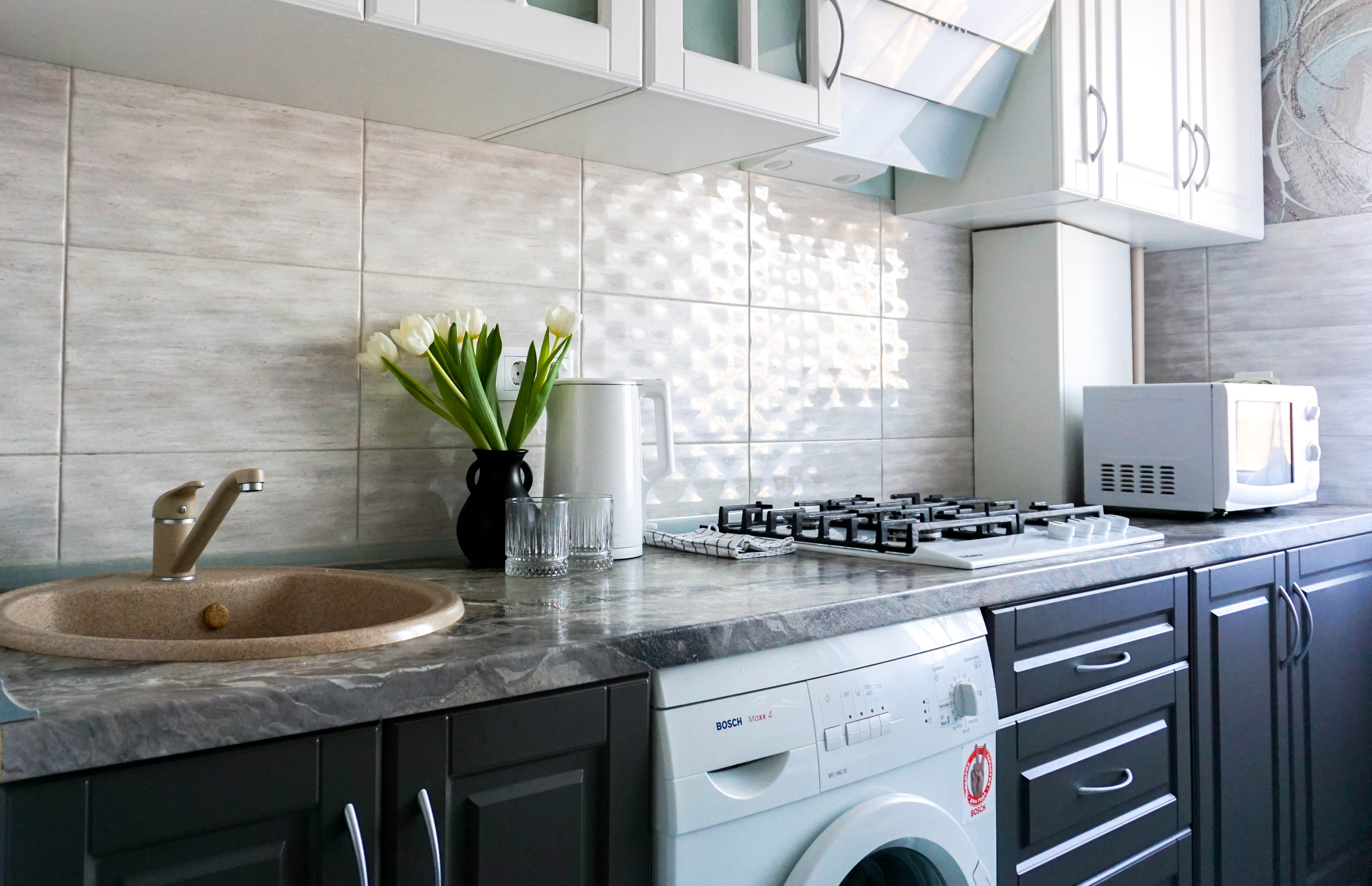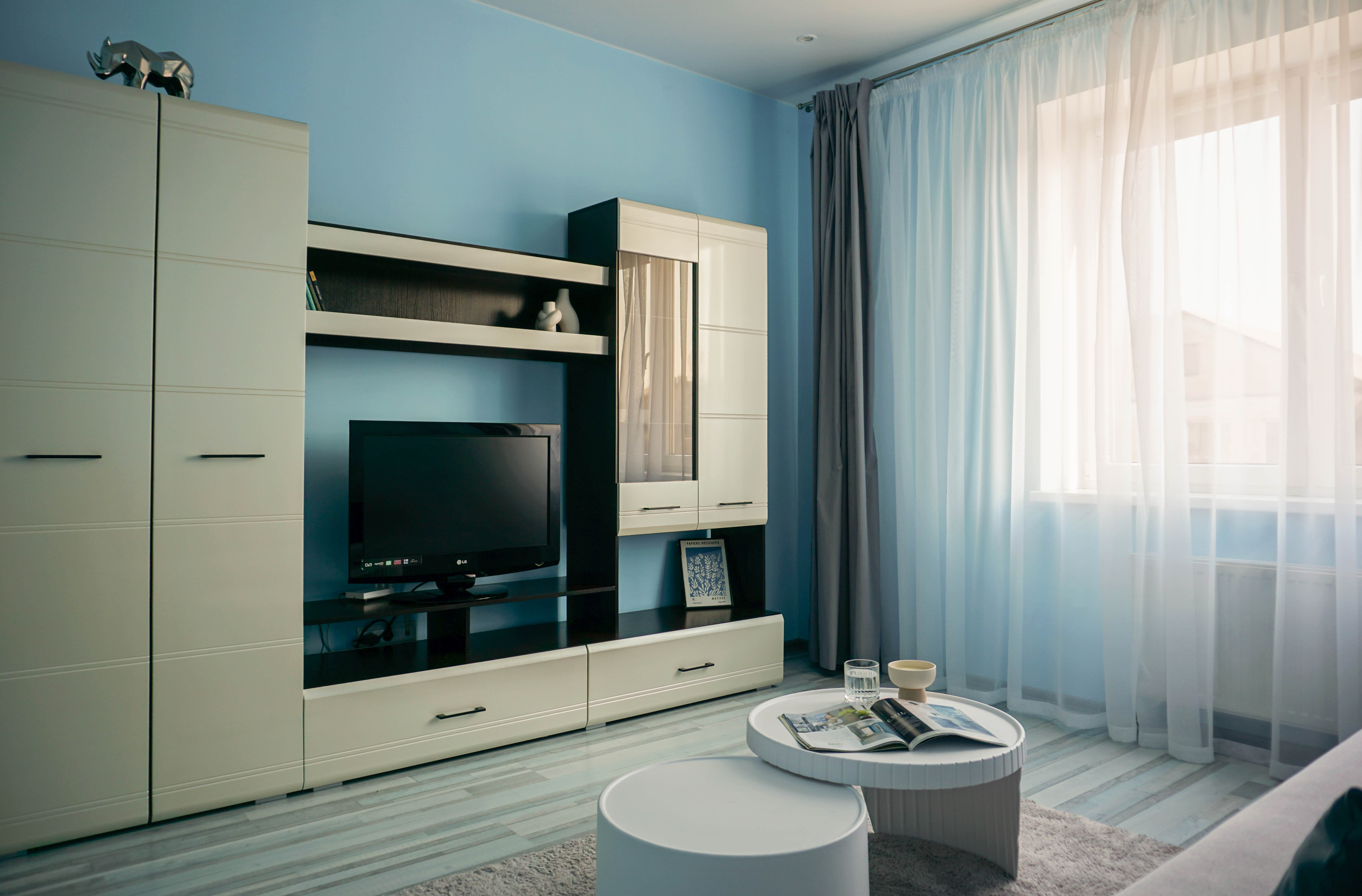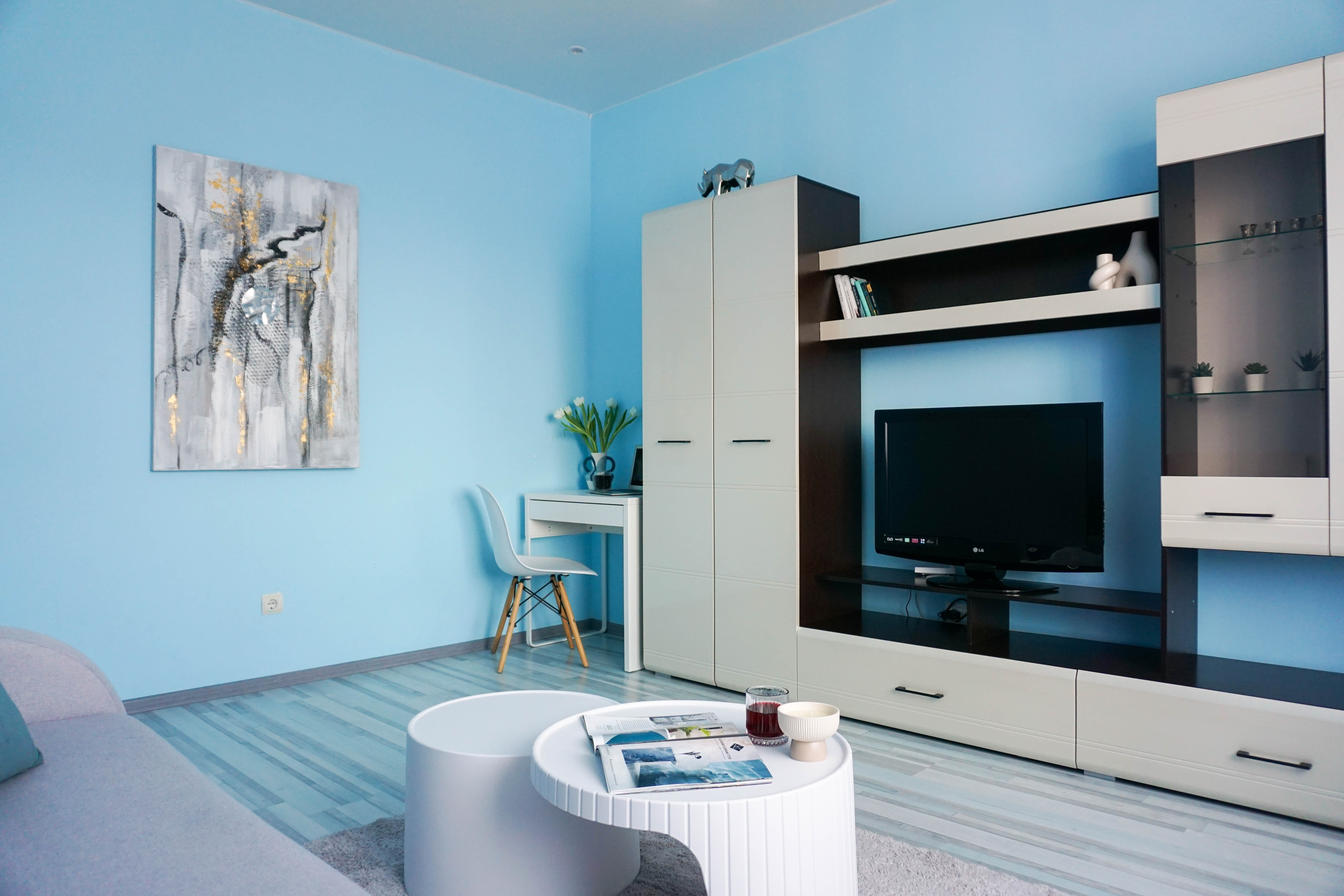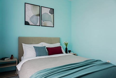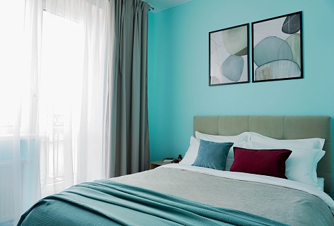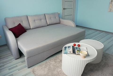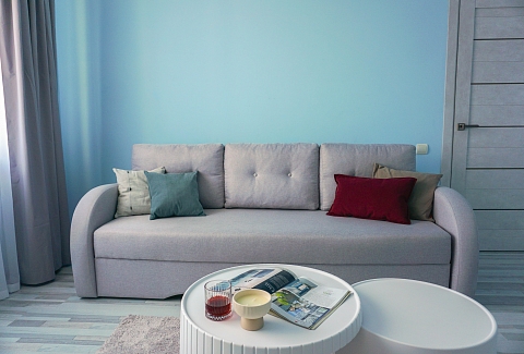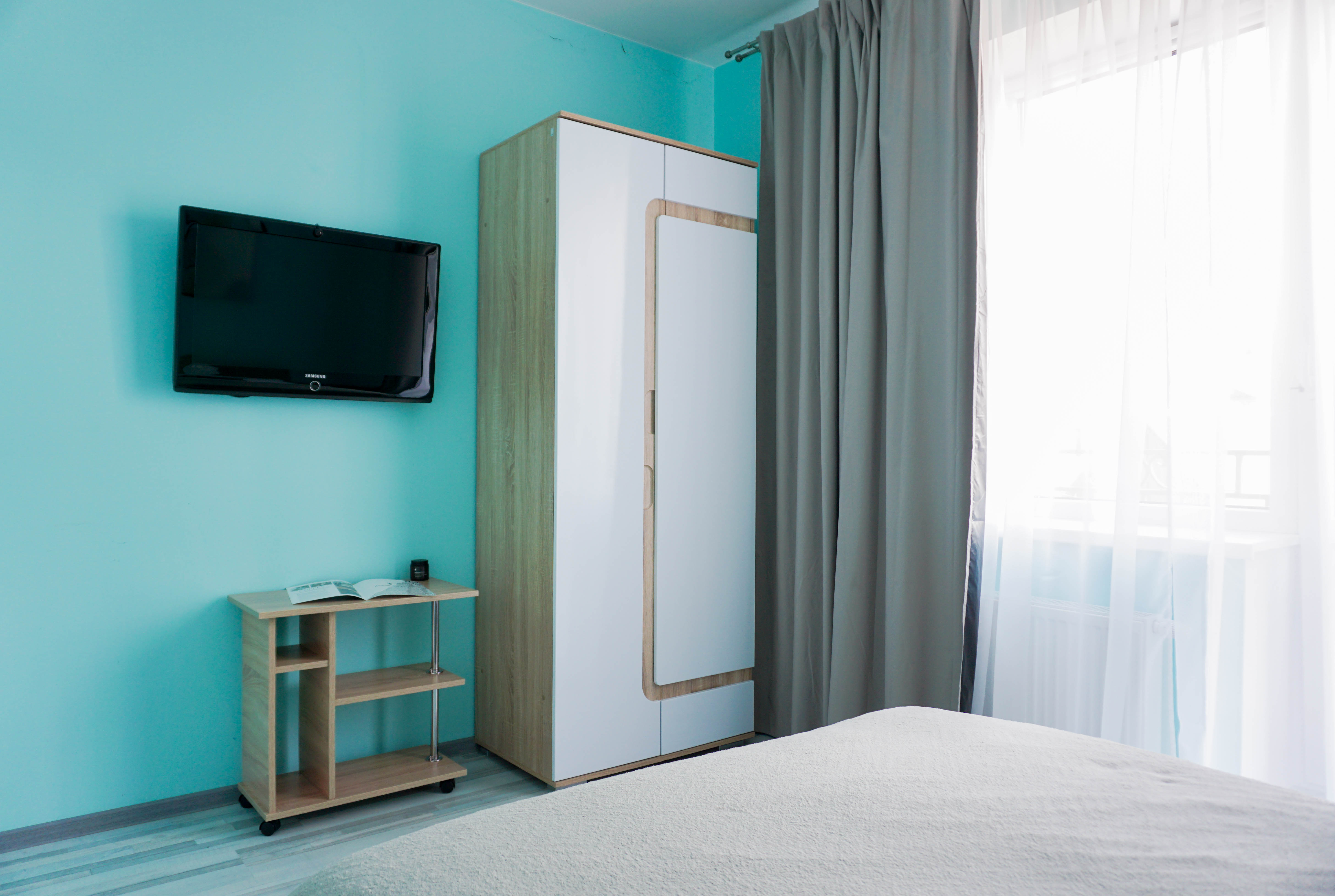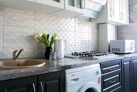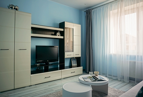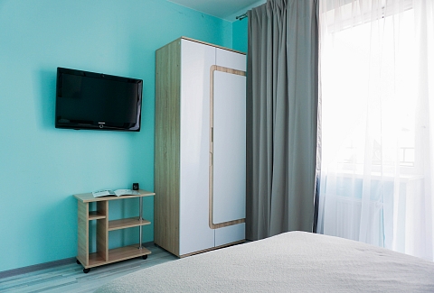 В номере: вешалка, диван раскладной, зеркало, кровать двуспальная, кровать полутороспальная, стол, стулья, шкаф, гладильная доска, духовой шкаф, микроволновая печь, набор посуды, плита электрическая, стиральная машина, сушилка для белья, телевизор ЖК, утюг, холодильник, чайный набор посуды, электрочайник