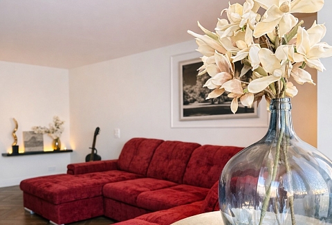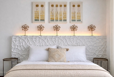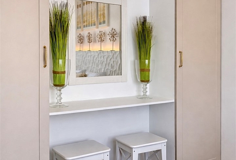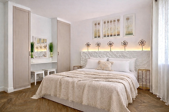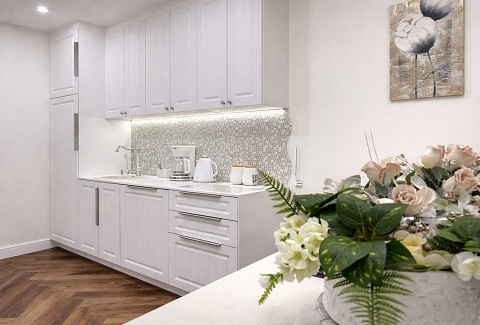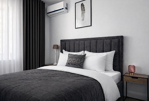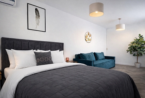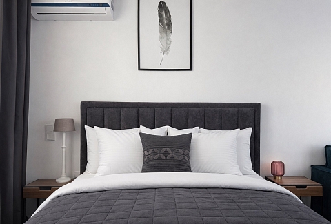 В номере: вешалка, диван, зеркало, кровать двуспальная, прикроватные тумбочки, стол, стулья, шкаф, гладильная доска, духовой шкаф, кондиционер, микроволновая печь, набор посуды, плита электрическая, стиральная машина, сушилка для белья, телевизор ЖК, утюг, холодильник, чайный набор посуды, электрочайник