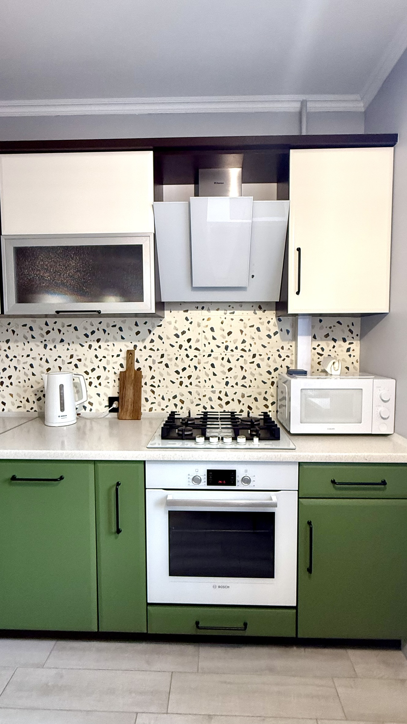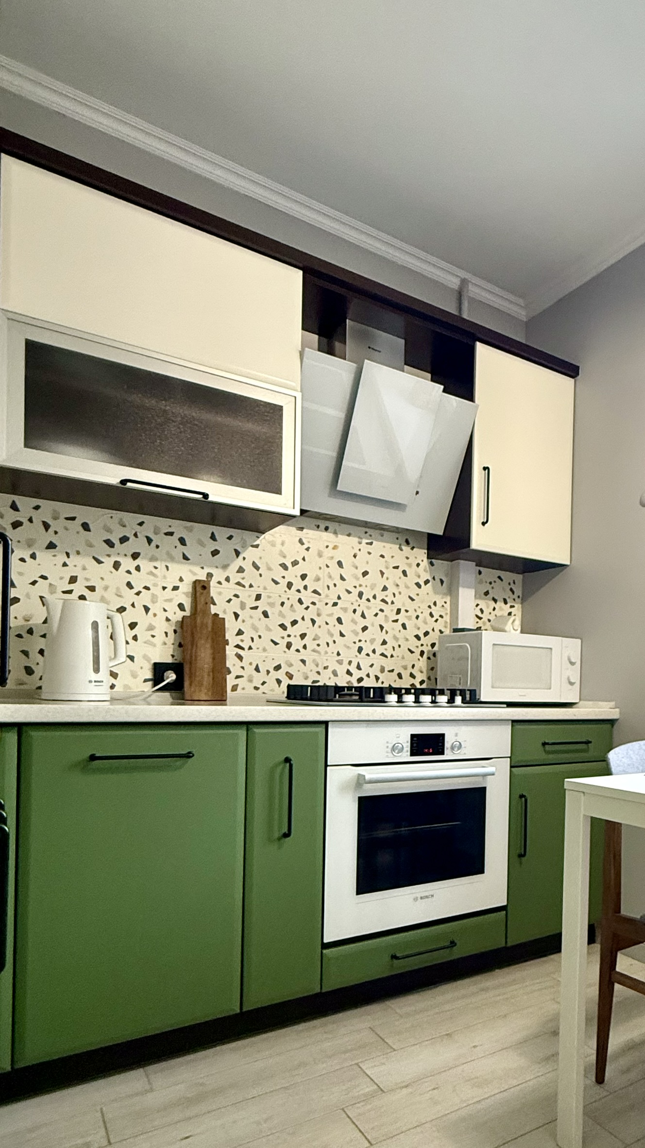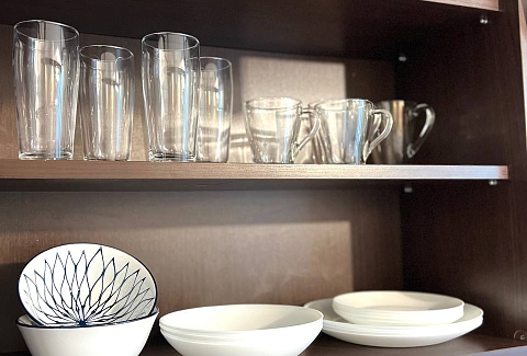 В номере: диван, зеркало, кровать двуспальная, прикроватные тумбочки, стол, стулья, шкаф, гладильная доска, духовой шкаф, кондиционер, микроволновая печь, набор посуды, плита газовая, стиральная машина, сушилка для белья, телевизор ЖК, утюг, холодильник, чайный набор посуды, электрочайник