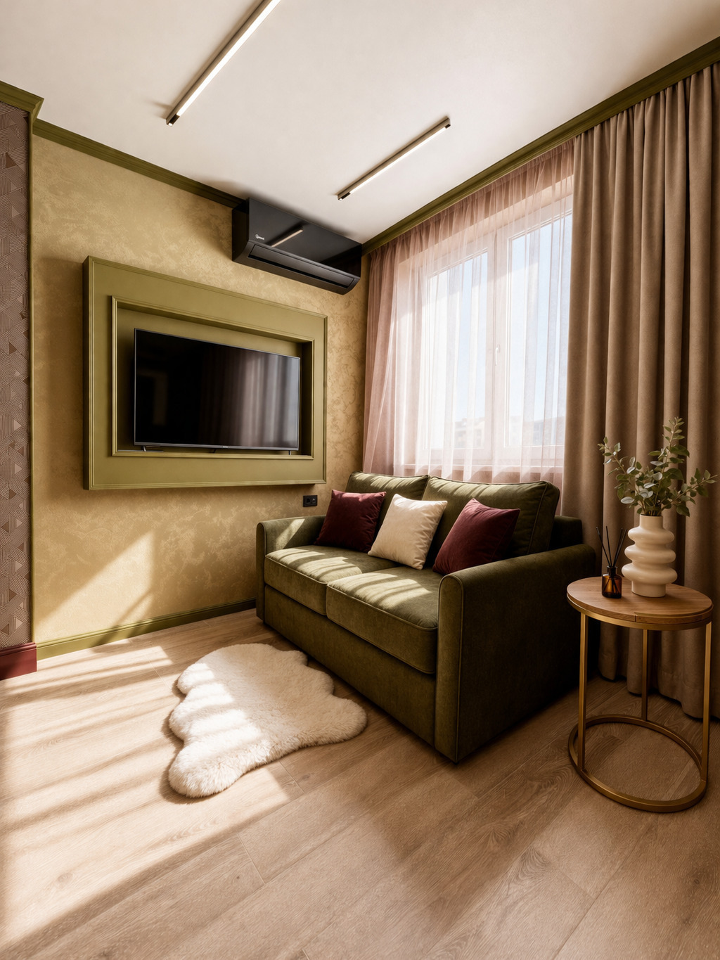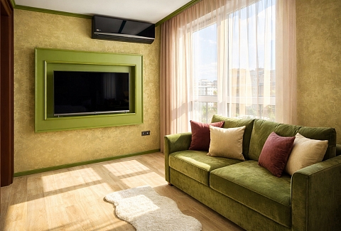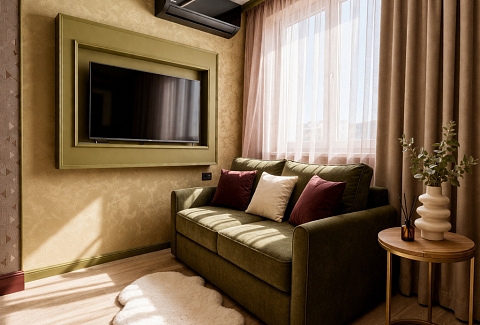 В номере: вешалка, диван, зеркало, кровать двуспальная, стол, стулья, шкаф, кондиционер, микроволновая печь, набор посуды, плита, посудомоечная машина, стиральная машина, телевизор, утюг, холодильник, чайный набор посуды, электрочайник