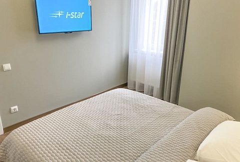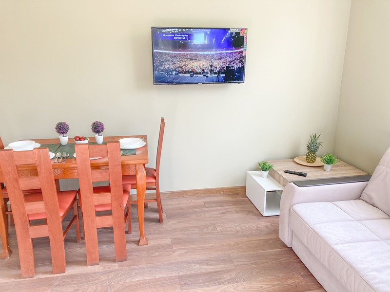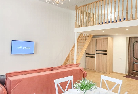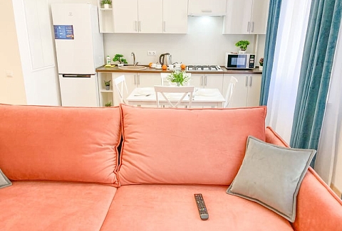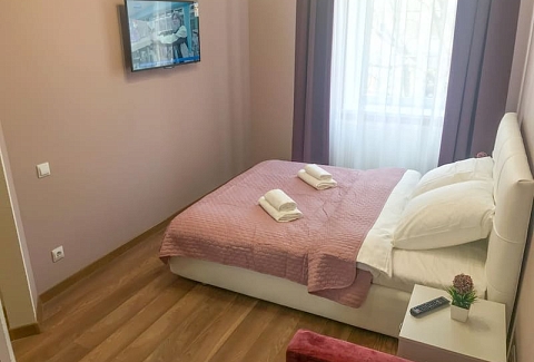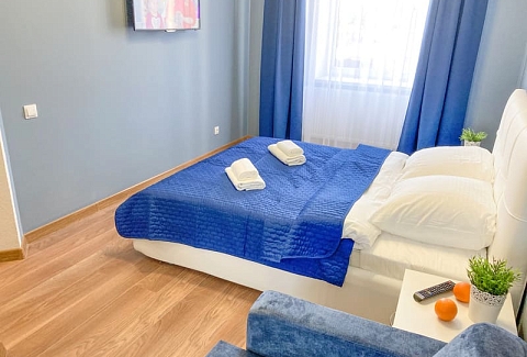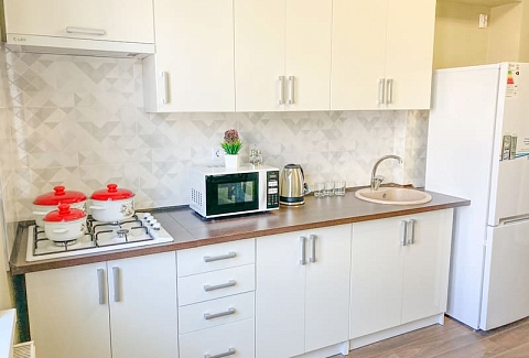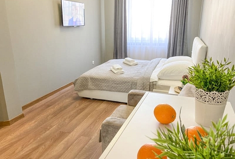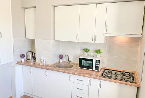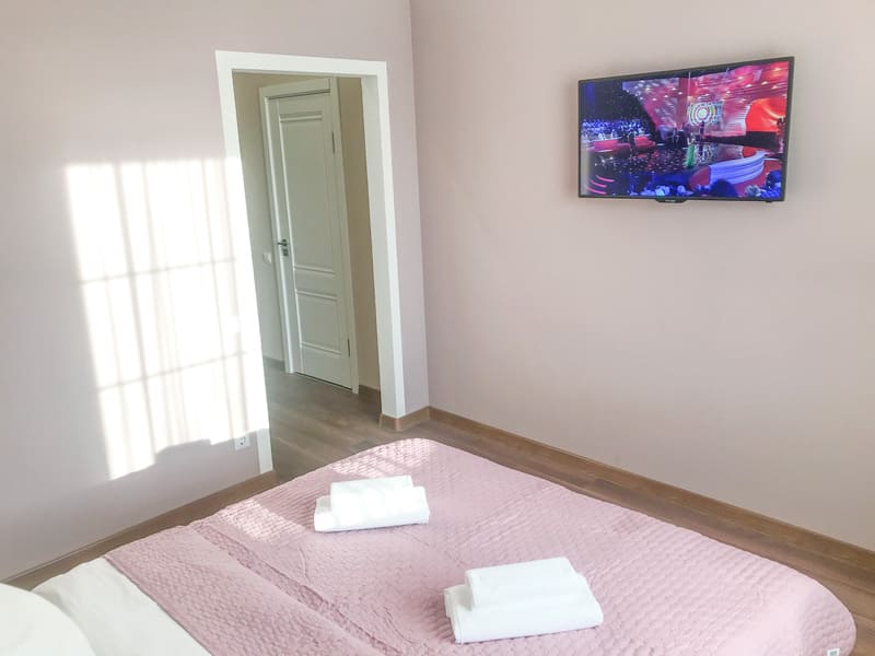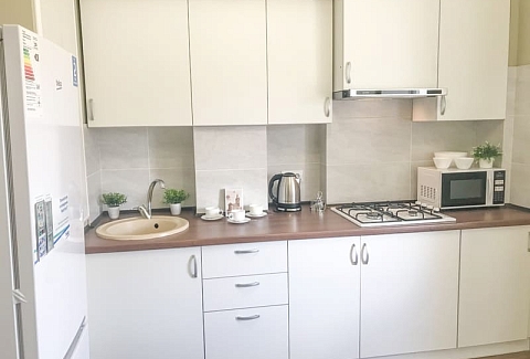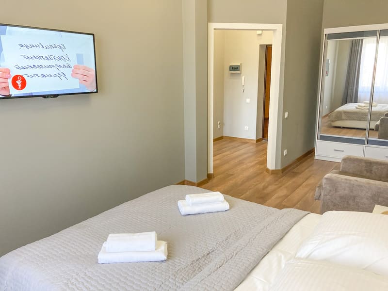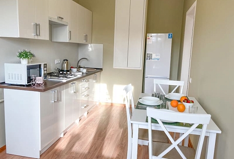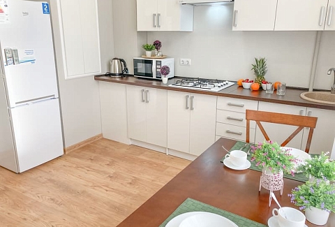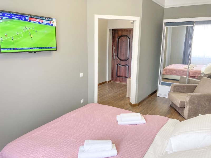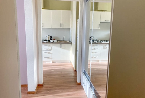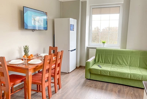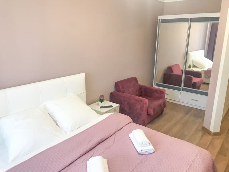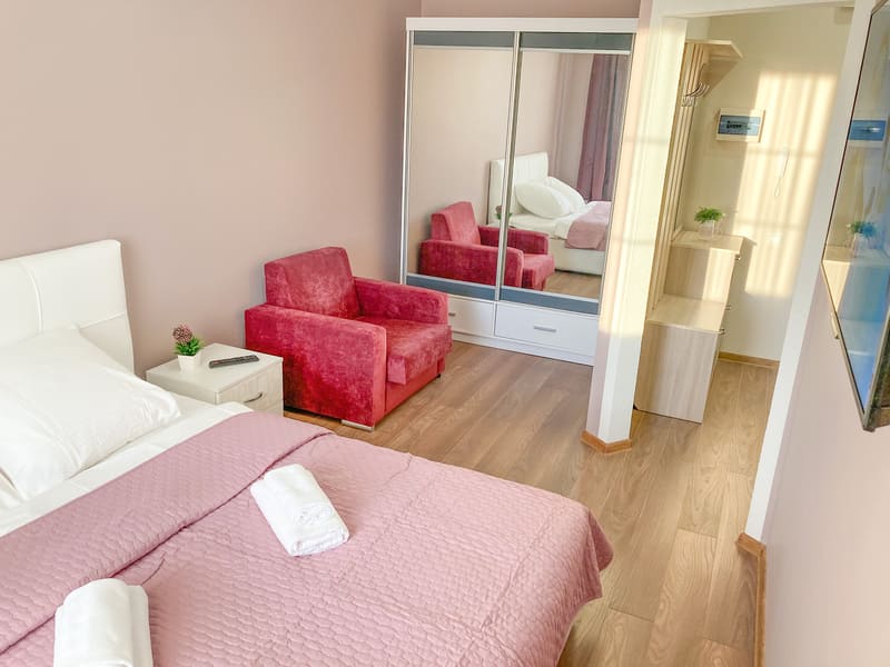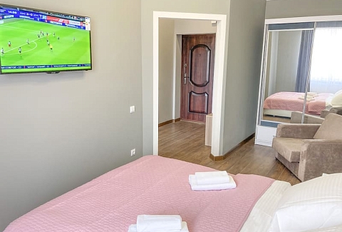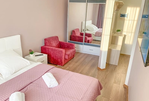 В номере: вешалка, диван раскладной, зеркало, кровать двуспальная, кухонная мебель, стол, стулья, шкаф, гладильная доска, микроволновая печь, набор посуды, плита газовая, сплит-система, телевизор ЖК, утюг, холодильник, электрочайник