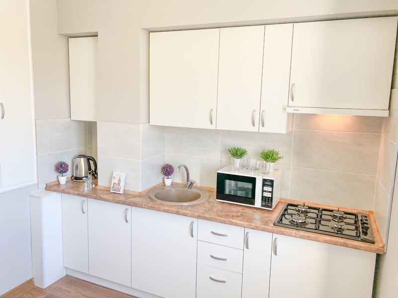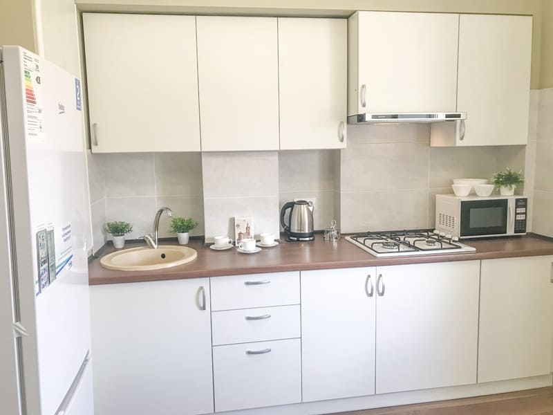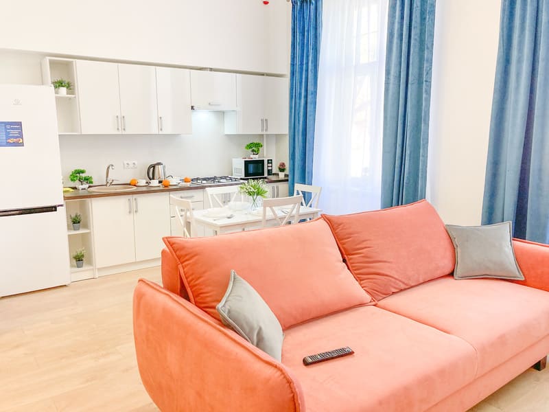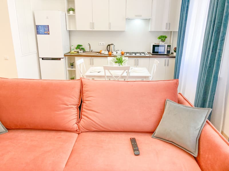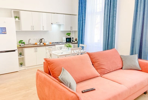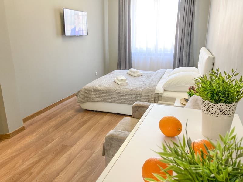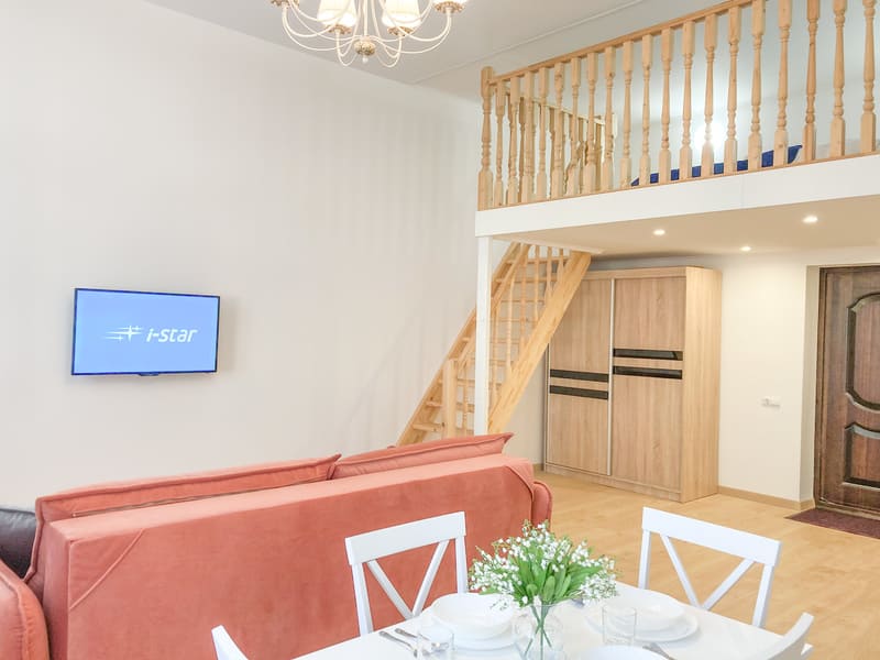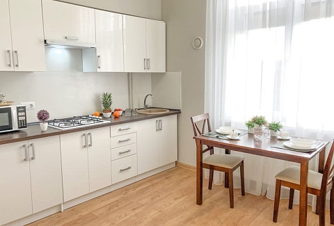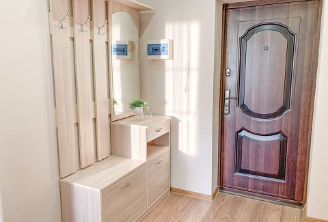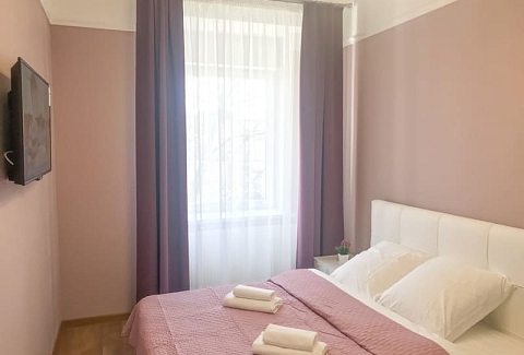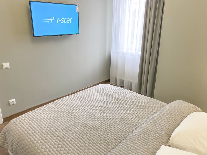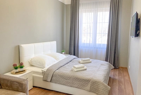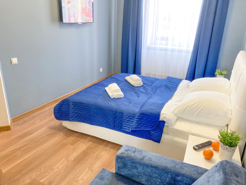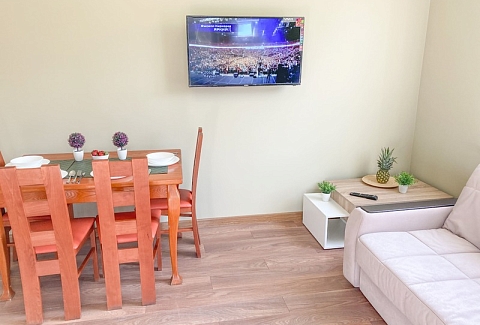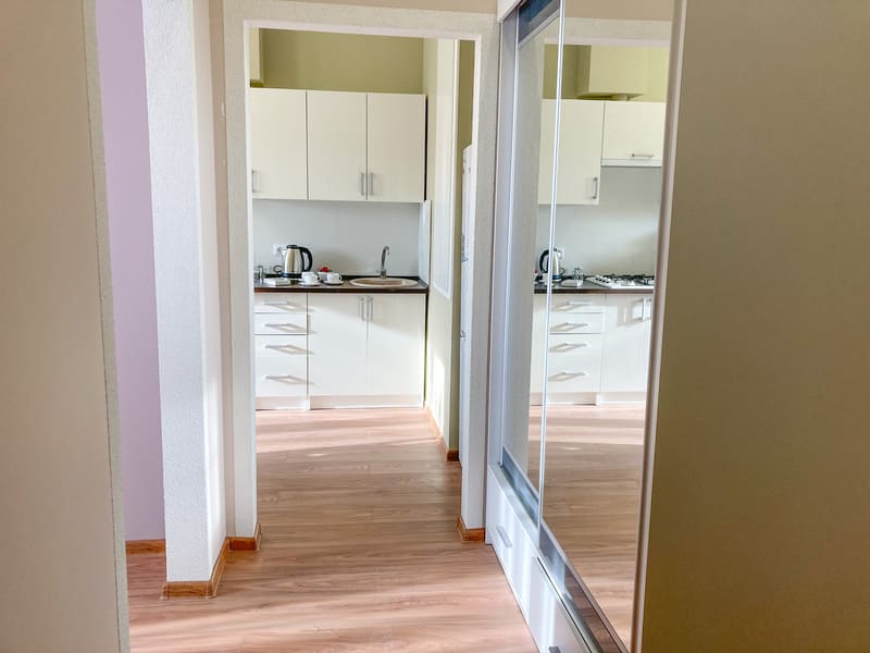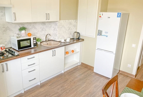 В номере: вешалка, диван раскладной, зеркало, кровать двуспальная, кухонная мебель, стол, стулья, шкаф, гладильная доска, микроволновая печь, набор посуды, плита газовая, сплит-система, телевизор ЖК, утюг, холодильник, электрочайник