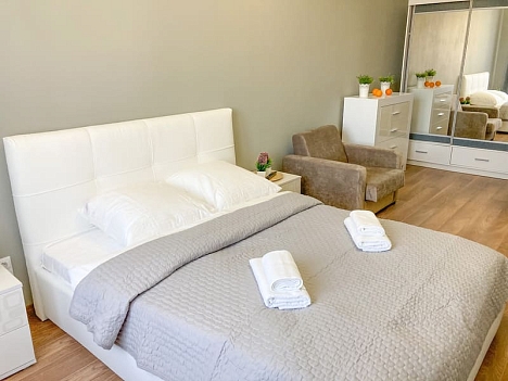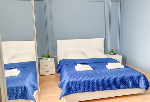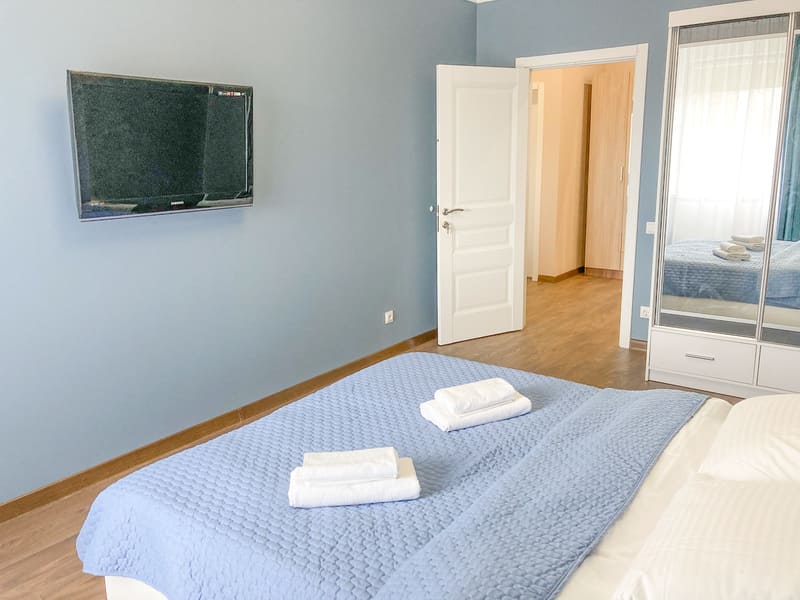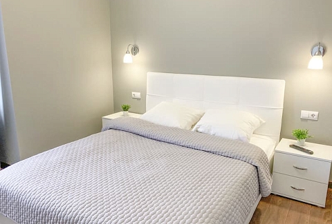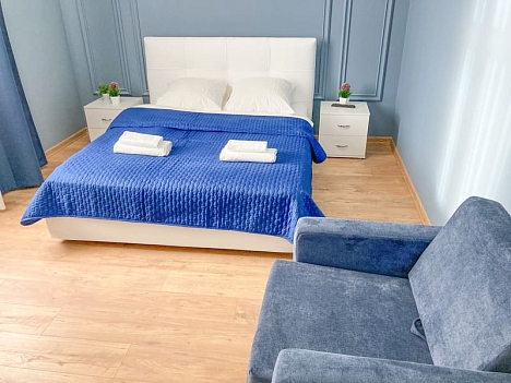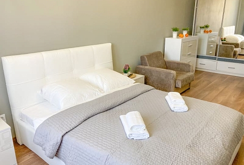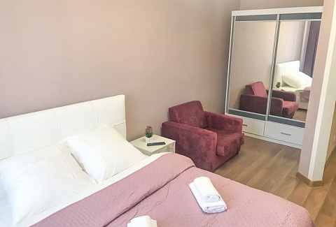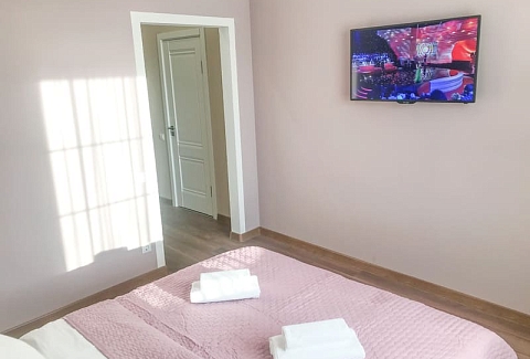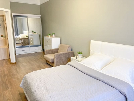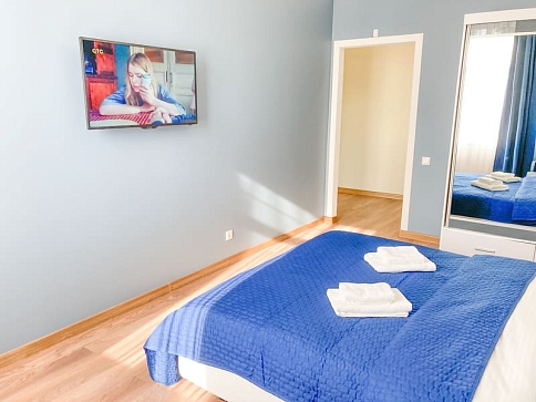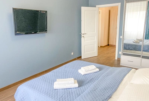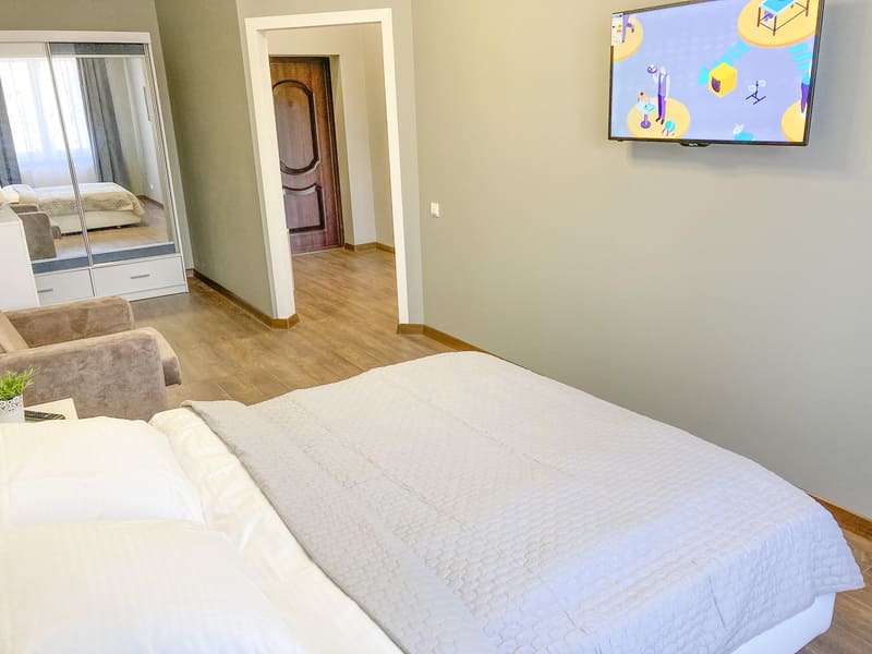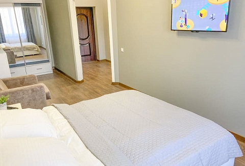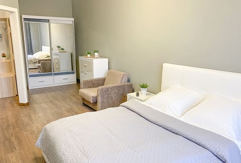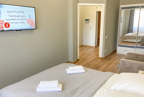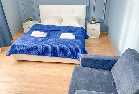 В номере: вешалка, зеркало, кресло-кровать, кровать двуспальная, кухонная мебель, прикроватные тумбочки, стол, стулья, шкаф, гладильная доска, микроволновая печь, набор посуды, плита газовая, сплит-система, телевизор ЖК, утюг, холодильник, электрочайник