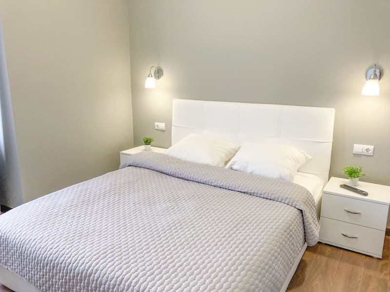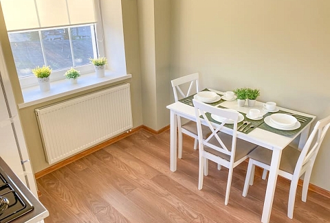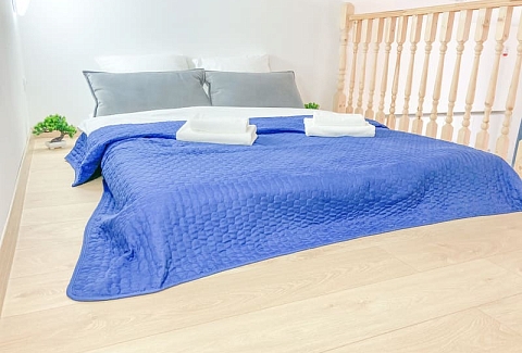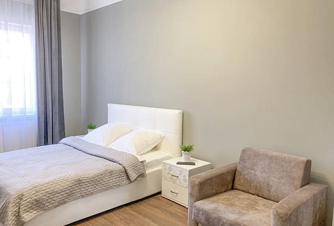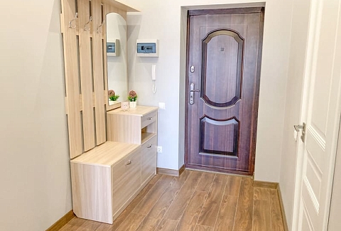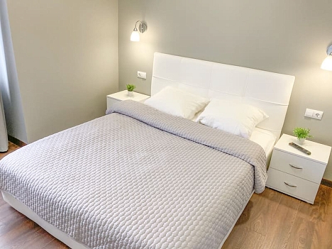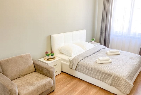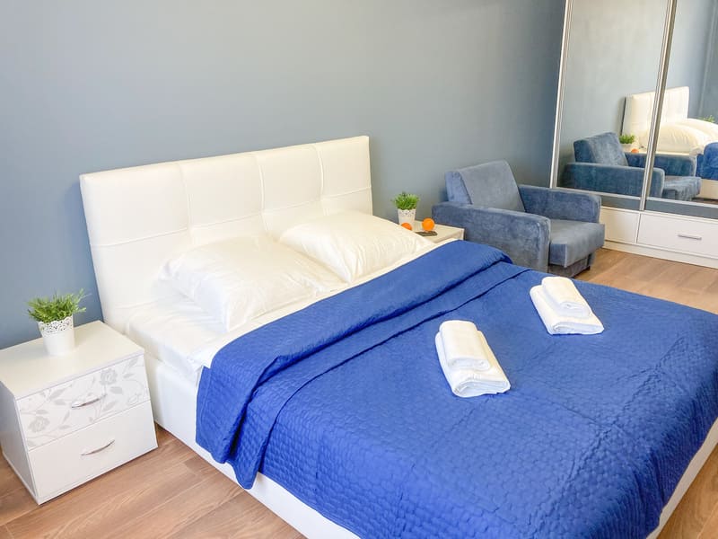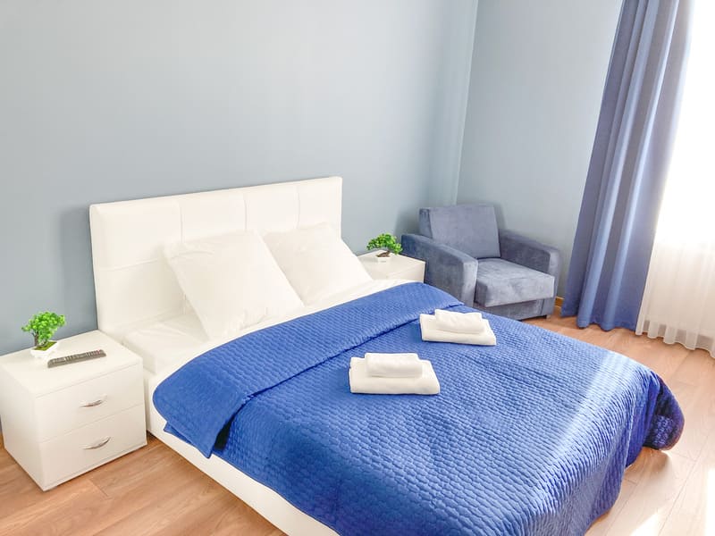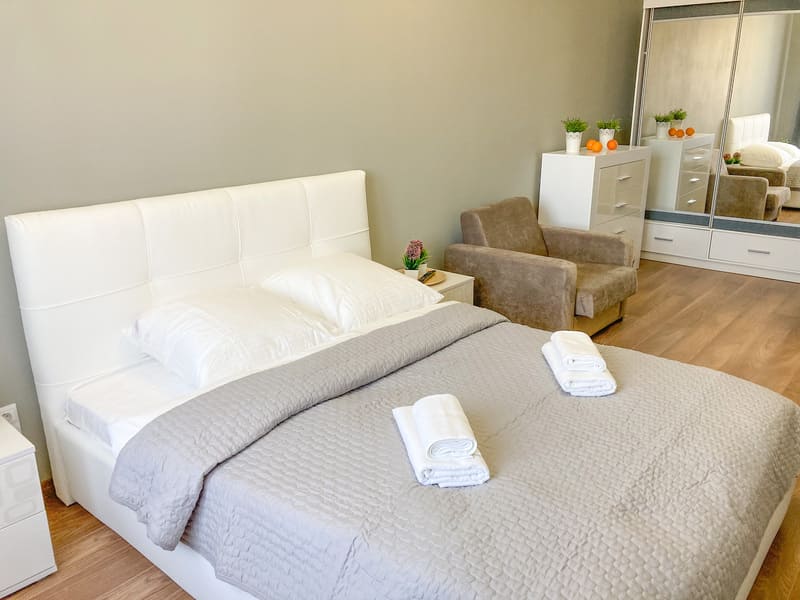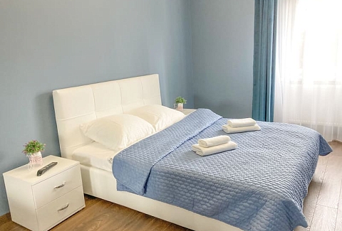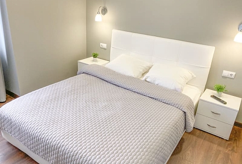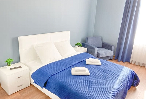 В номере: вешалка, зеркало, кресло-кровать, кровать двуспальная, кухонная мебель, прикроватные тумбочки, стол, стулья, шкаф, гладильная доска, микроволновая печь, набор посуды, плита газовая, сплит-система, телевизор ЖК, утюг, холодильник, электрочайник