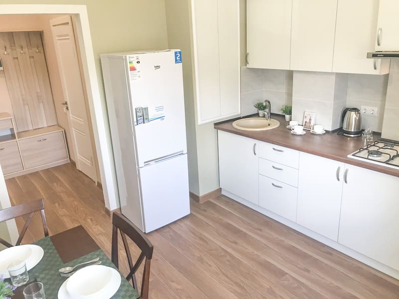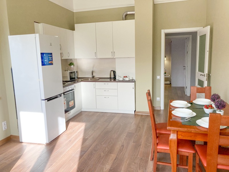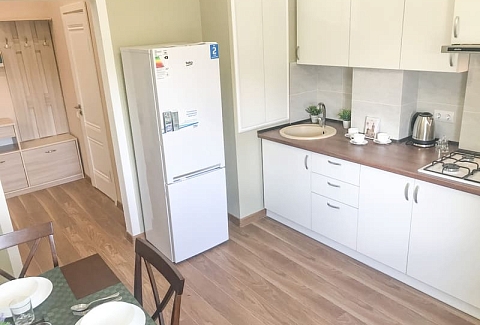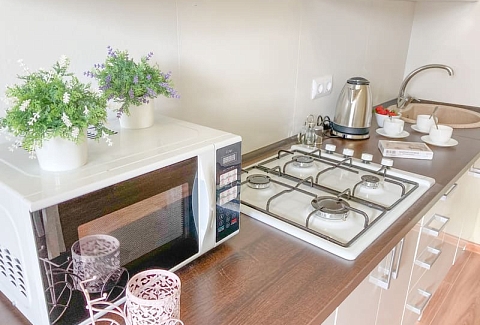В номере: вешалка, кресло-кровать, кровать двуспальная, кухонная мебель, прикроватные тумбочки, стол, стулья, шкаф, гладильная доска, микроволновая печь, набор посуды, плита газовая, сплит-система, телевизор ЖК, холодильник, электрочайник
