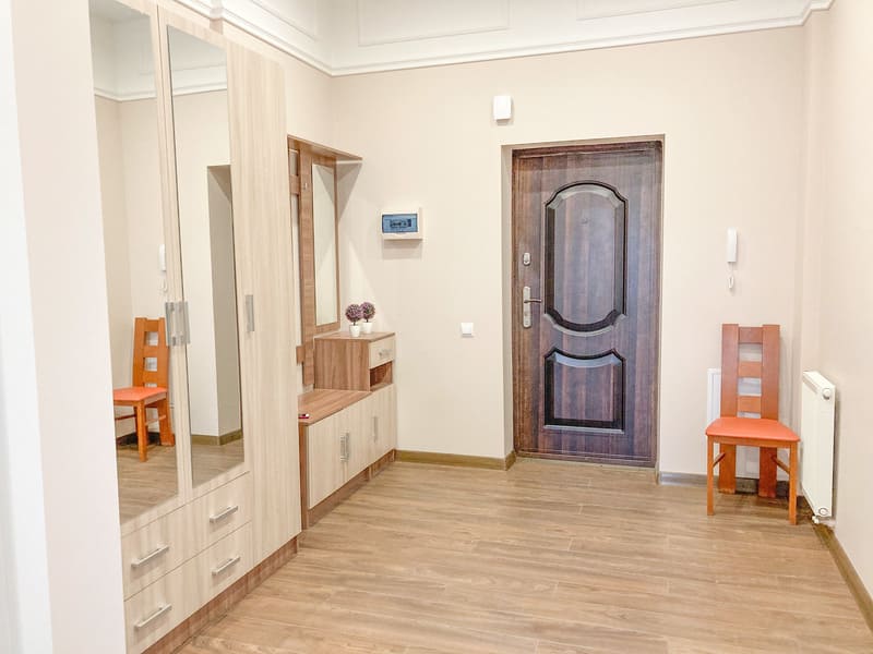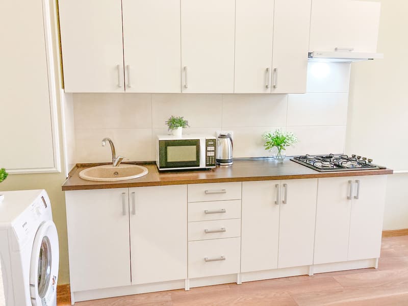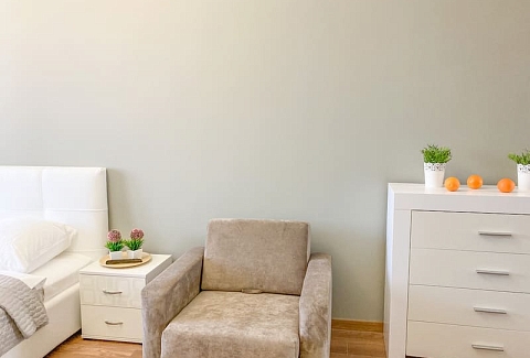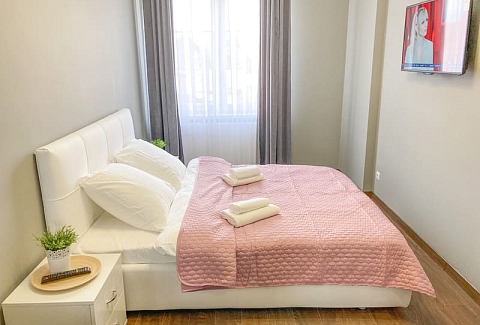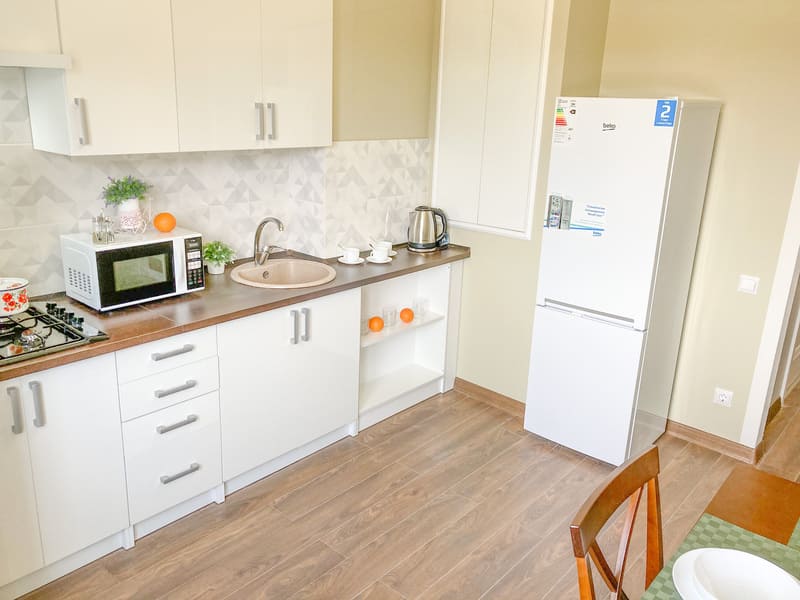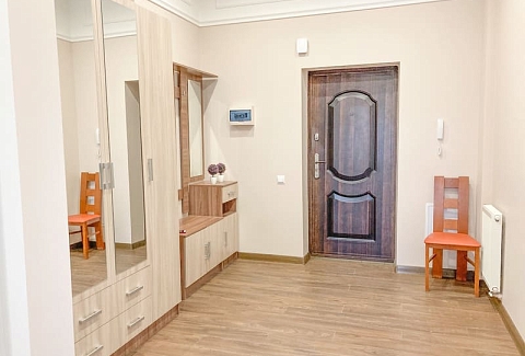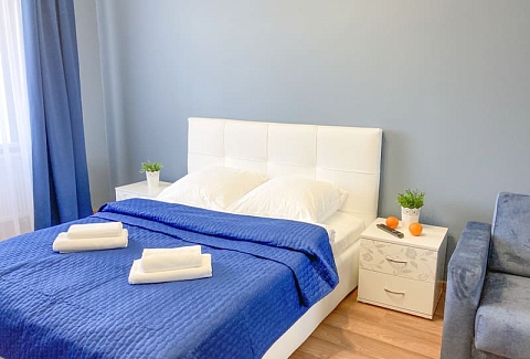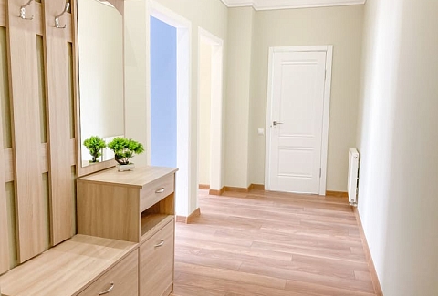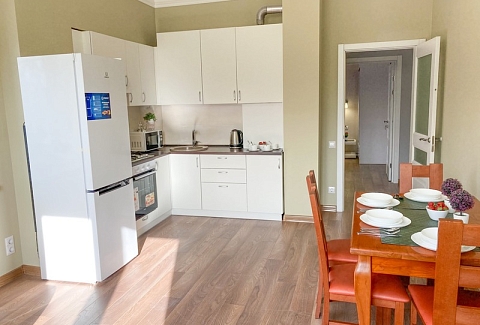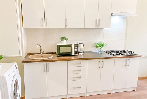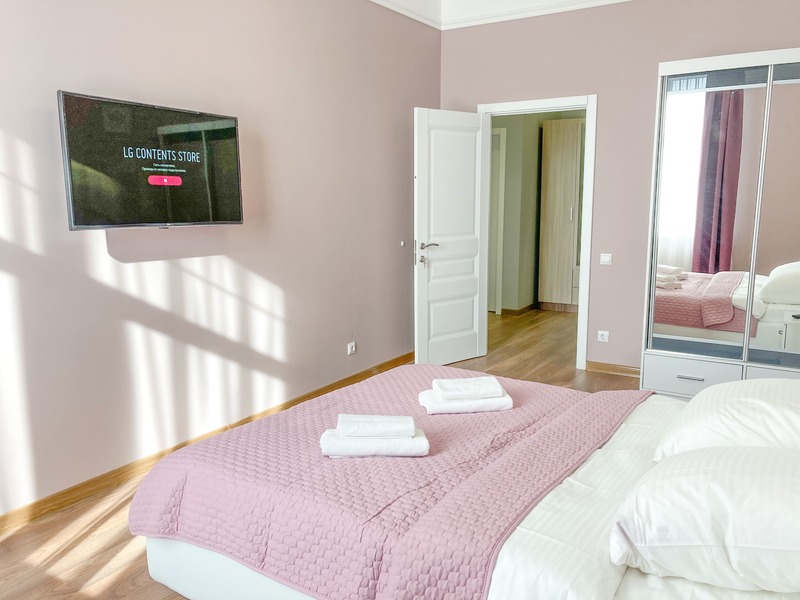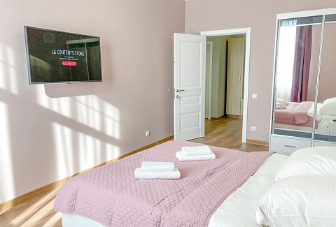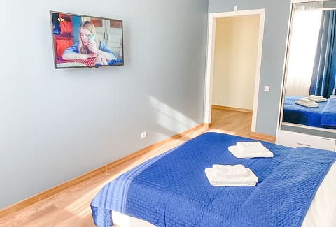 В номере: вешалка, зеркало, кресло-кровать, кровать двуспальная, кухонная мебель, прикроватные тумбочки, стол, стулья, шкаф, гладильная доска, микроволновая печь, набор посуды, сплит-система, стиральная машина, телевизор ЖК, утюг, холодильник, электрочайник