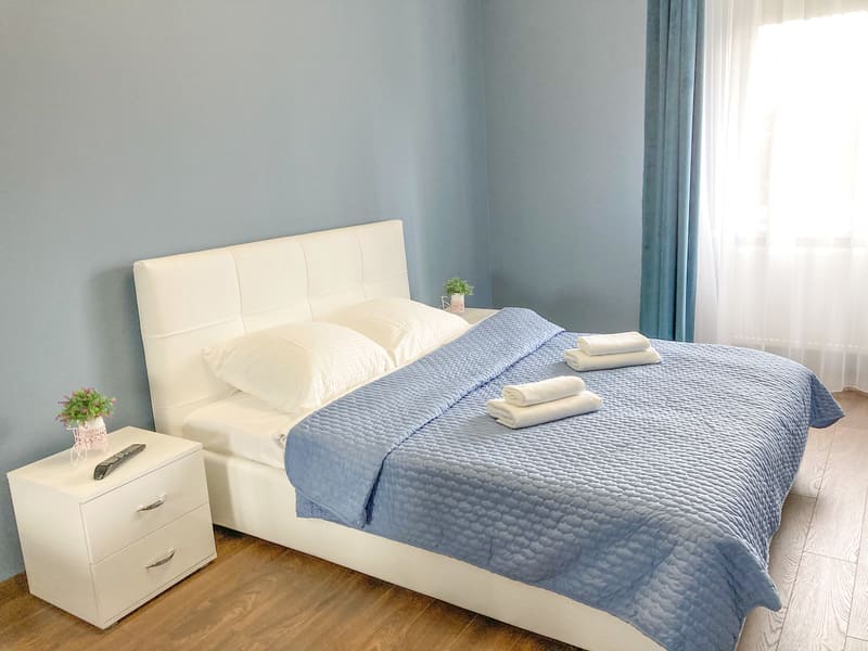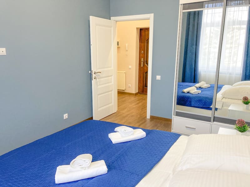 В номере: вешалка, диван раскладной, зеркало, кровать двуспальная, кухонная мебель, прикроватные тумбочки, стол, стулья, шкаф, гладильная доска, микроволновая печь, набор посуды, плита газовая, сплит-система, телевизор ЖК, утюг, холодильник, электрочайник