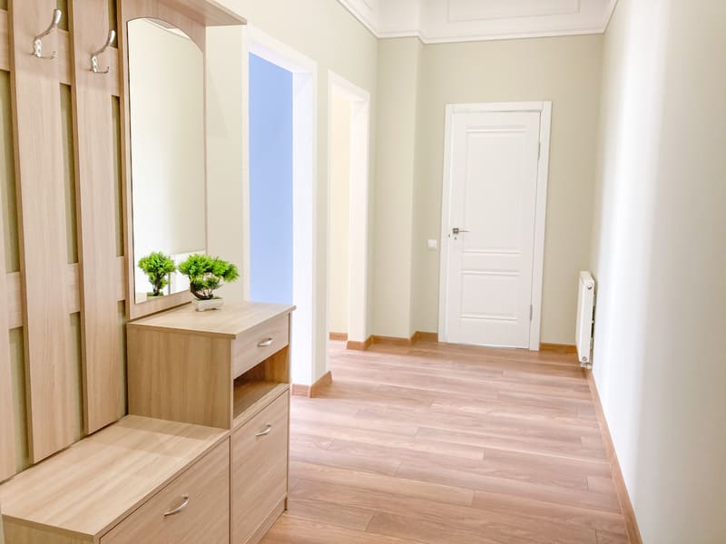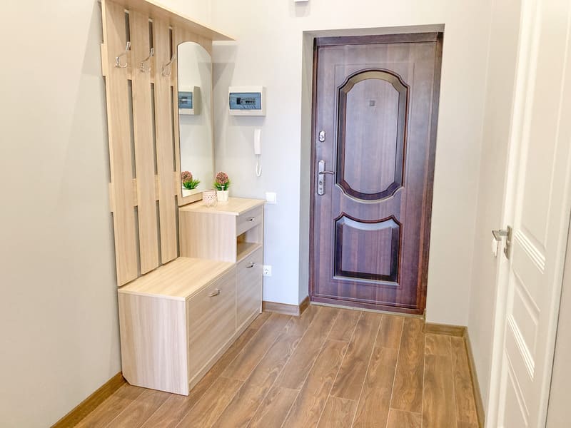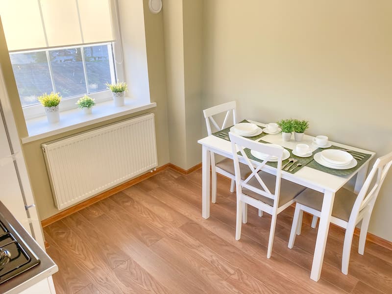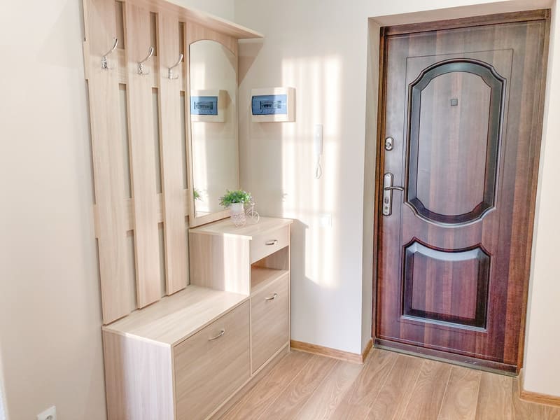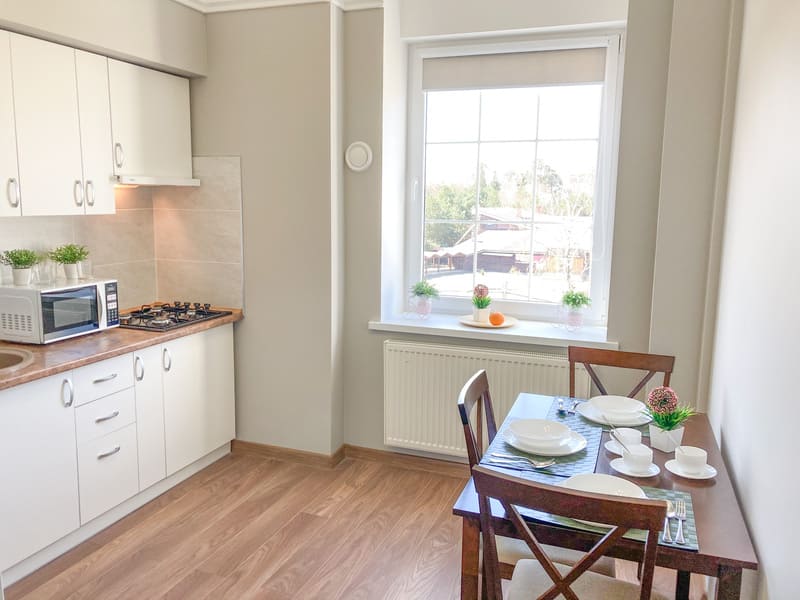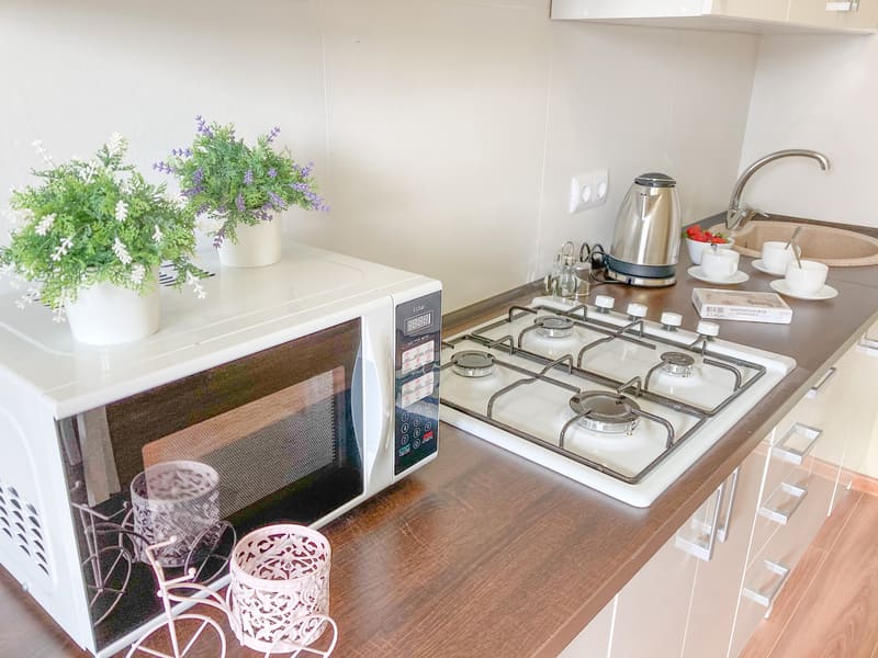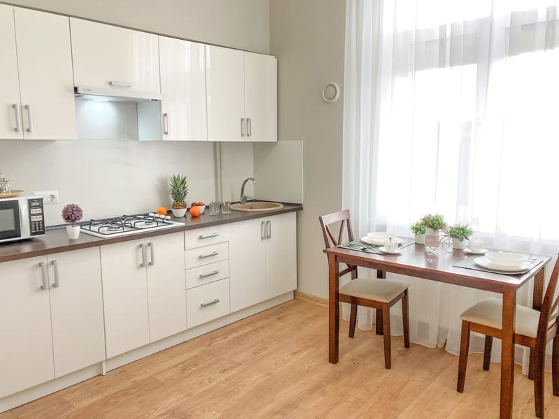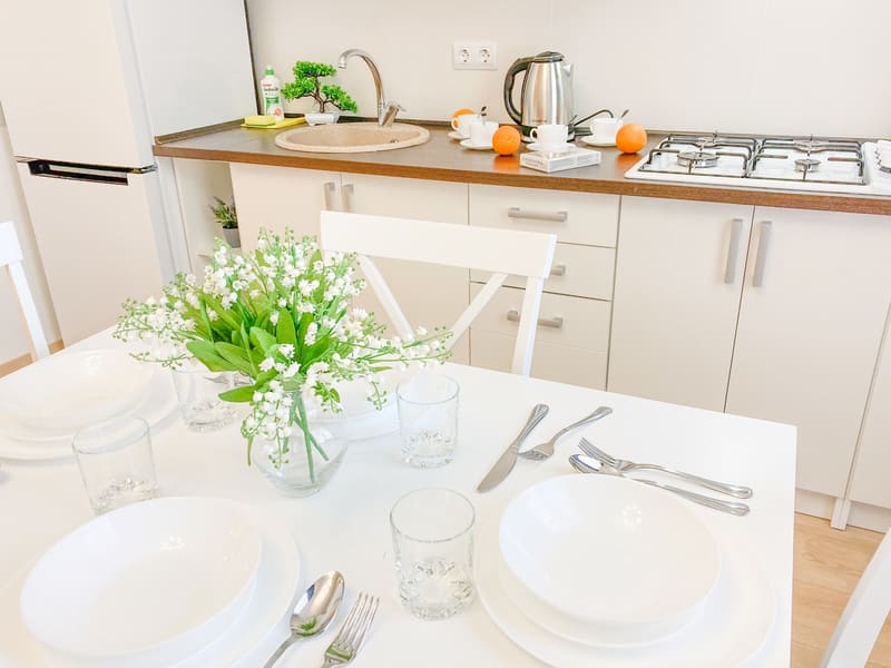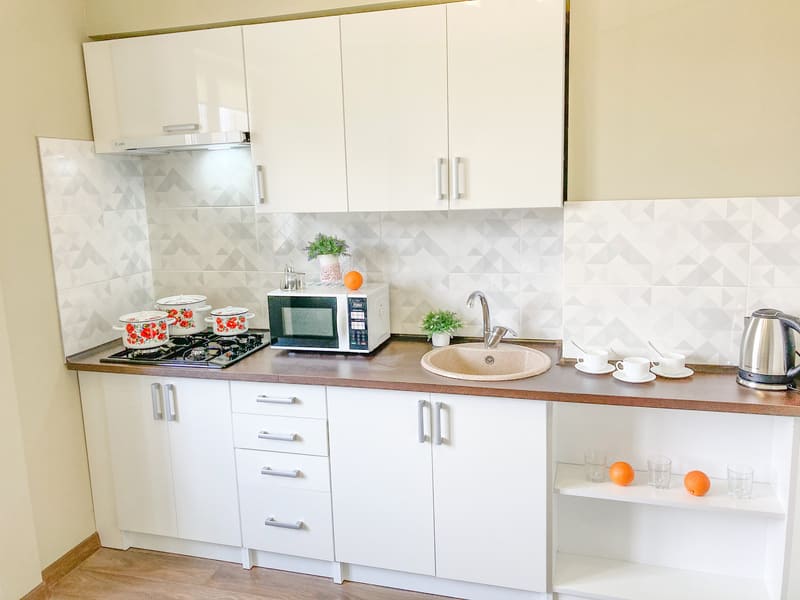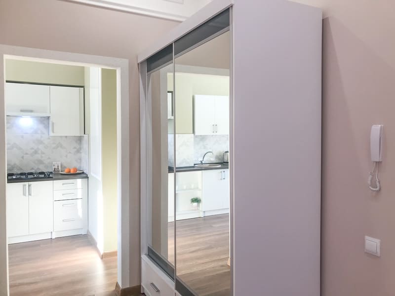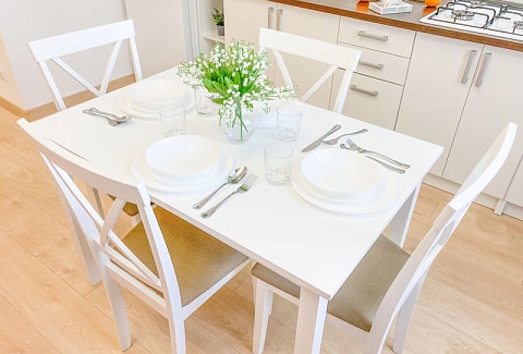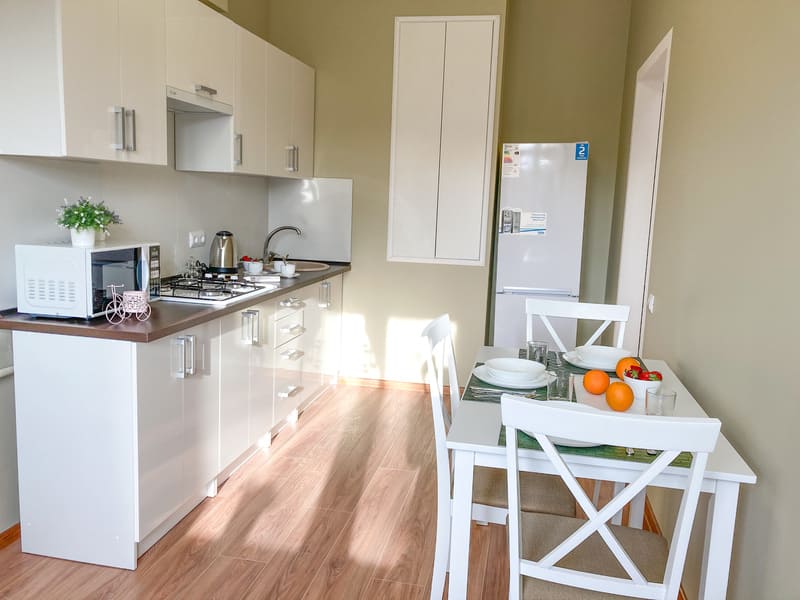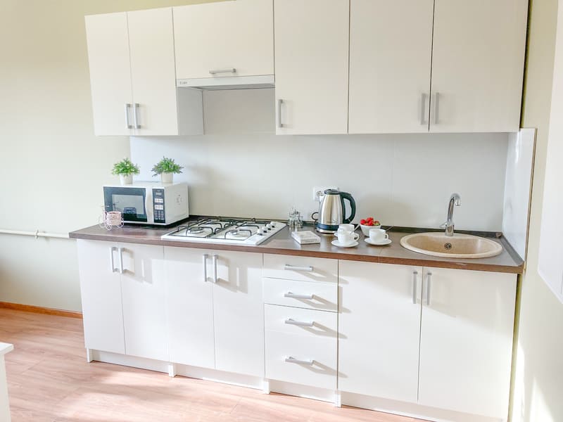 В номере: вешалка, зеркало, комод, кресло-кровать, кровать двуспальная, кухонная мебель, прикроватные тумбочки, стол, стулья, шкаф, гладильная доска, микроволновая печь, набор посуды, плита газовая, сплит-система, телевизор ЖК, утюг, холодильник, электрочайник