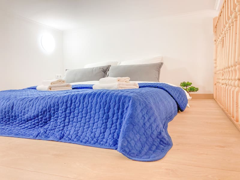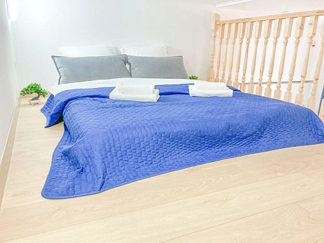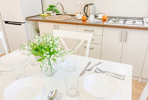 В номере: вешалка, диван раскладной, зеркало, кровать двуспальная, кухонная мебель, прикроватные тумбочки, стол, стулья, шкаф, гладильная доска, микроволновая печь, набор посуды, плита газовая, сплит-система, стиральная машина, телевизор ЖК, холодильник, электрочайник