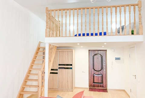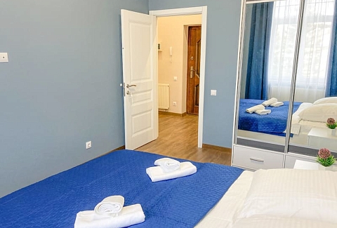 В номере: вешалка, диван раскладной, зеркало, кровать двуспальная, кухонная мебель, прикроватные тумбочки, стол, стулья, шкаф, гладильная доска, микроволновая печь, набор посуды, плита газовая, сплит-система, стиральная машина, телевизор ЖК, утюг, холодильник, электрочайник