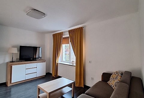 В номере: диван, зеркало, стол, стулья, шкаф, гладильная доска, микроволновая печь, набор посуды, плита, стиральная машина, телевизор, холодильник, чайный набор посуды, электрочайник