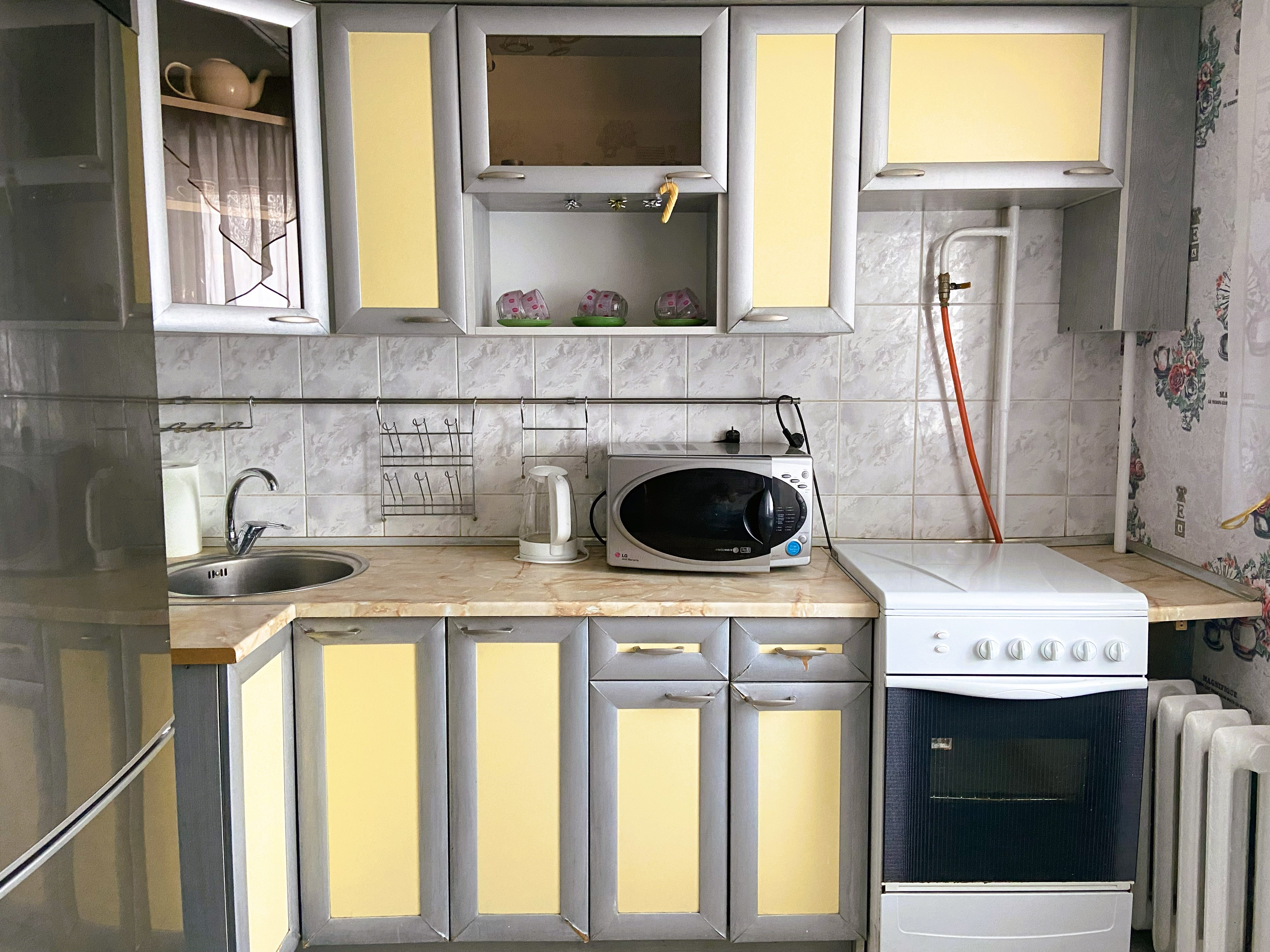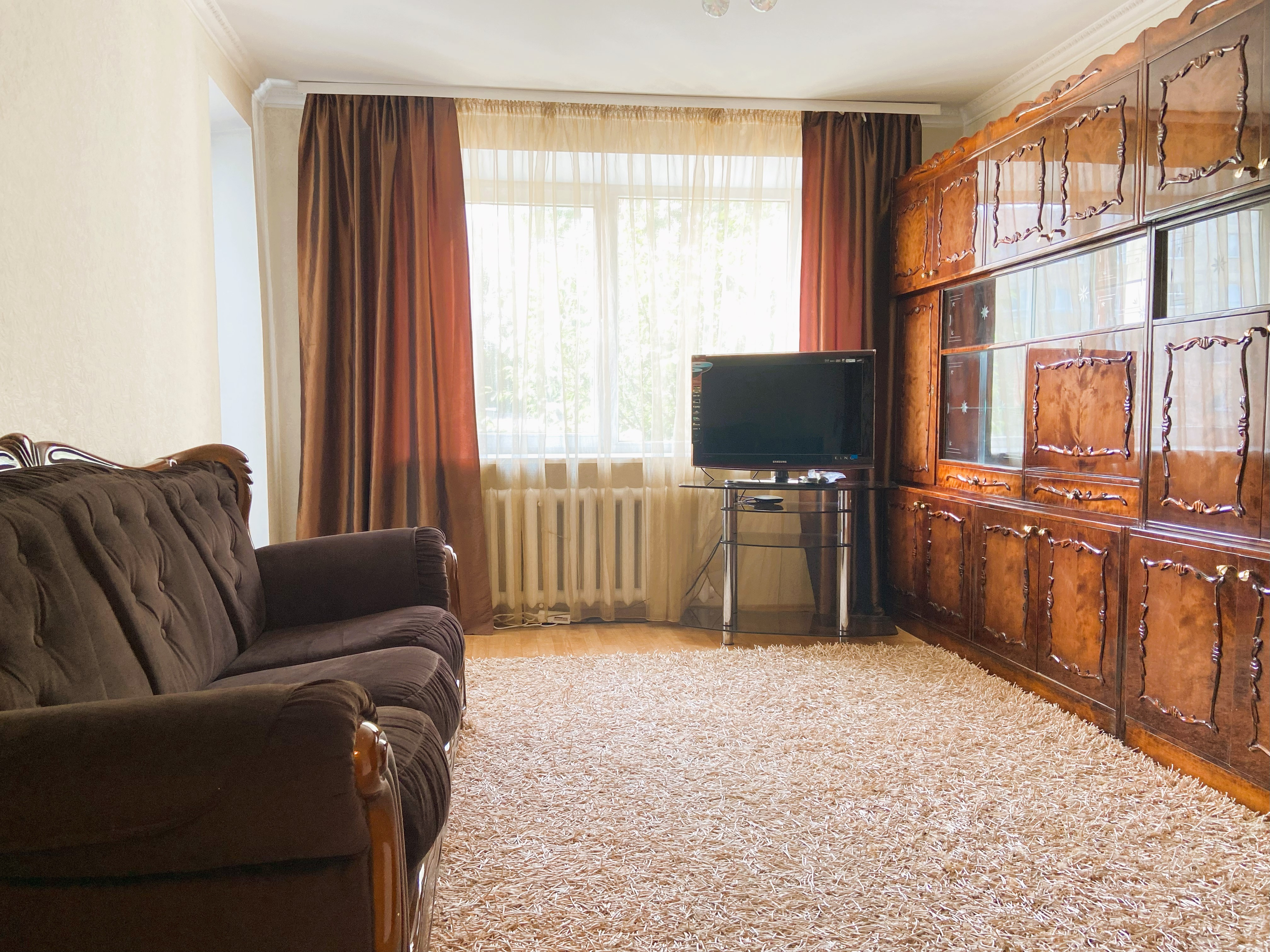 В номере: диван, зеркало, стол, стулья, шкаф, гладильная доска, кондиционер, микроволновая печь, набор посуды, плита газовая, стиральная машина, сушилка для белья, телевизор ЖК, утюг, холодильник, чайный набор посуды, электрочайник