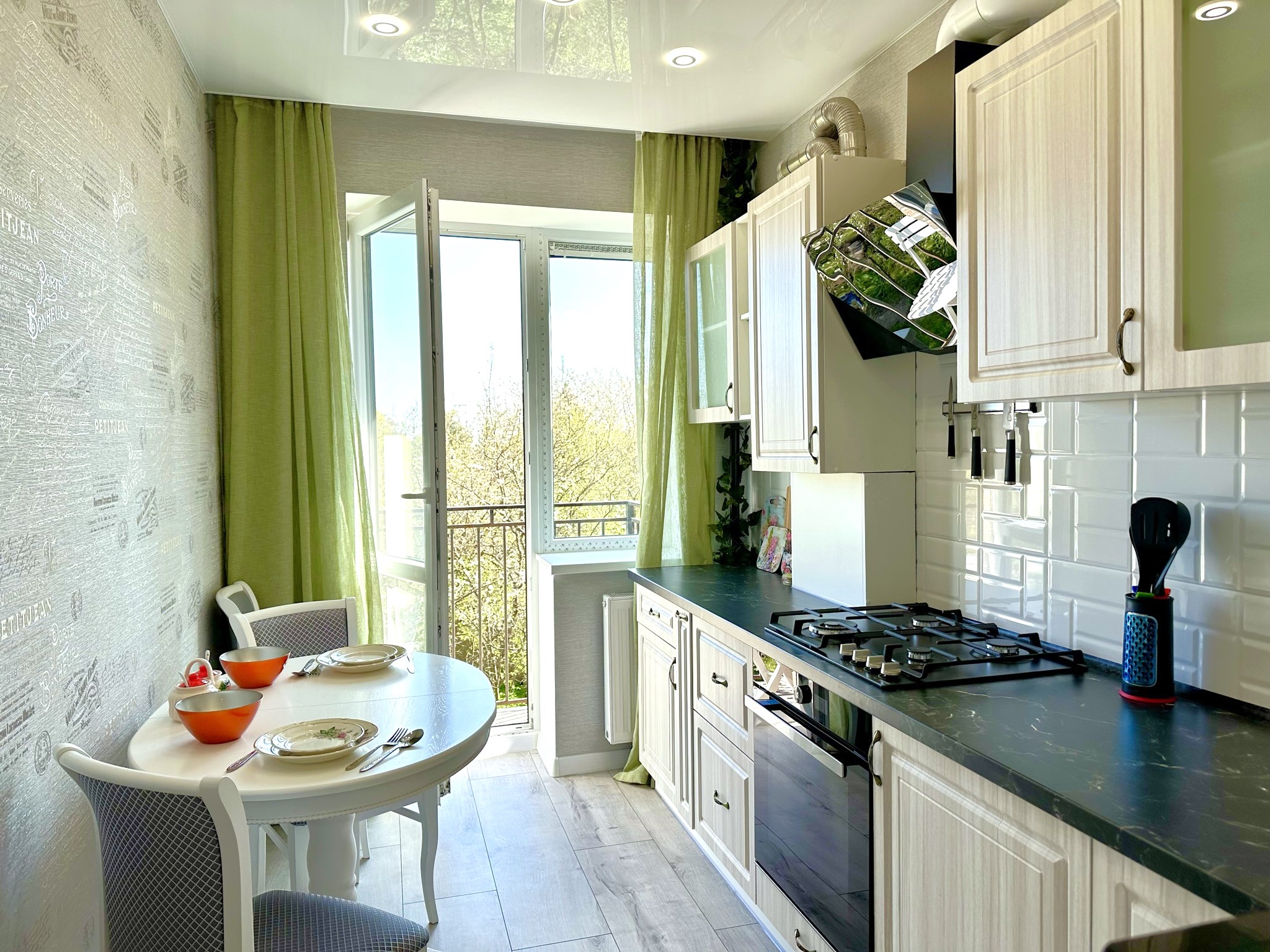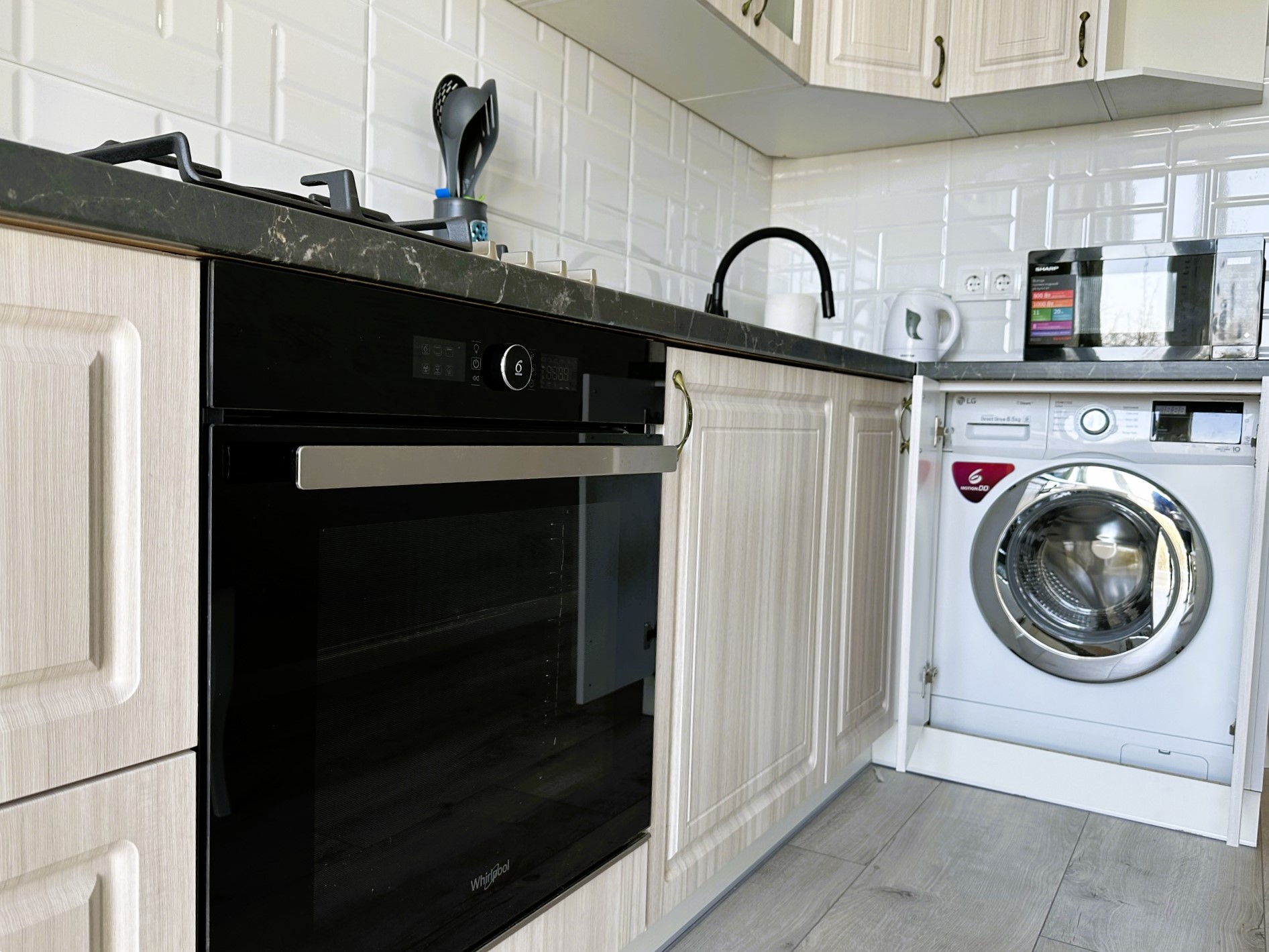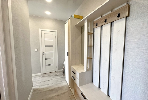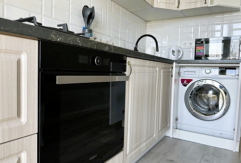 В номере: зеркало, кровать двуспальная, прикроватные тумбочки, стол, стулья, шкаф, гладильная доска, кондиционер, микроволновая печь, набор посуды, плита электрическая, стиральная машина, сушилка для белья, телевизор ЖК, утюг, холодильник, чайный набор посуды, электрочайник