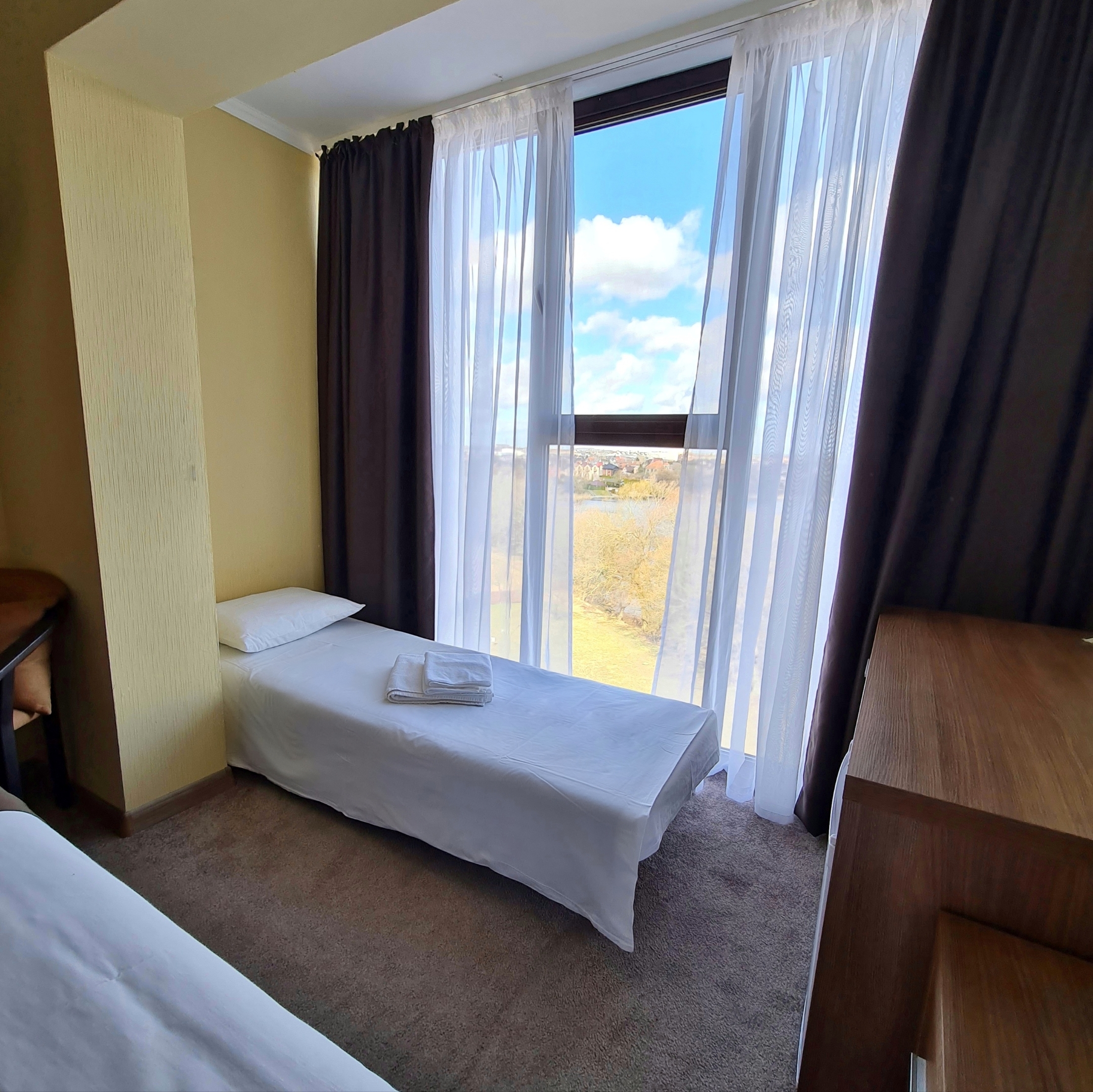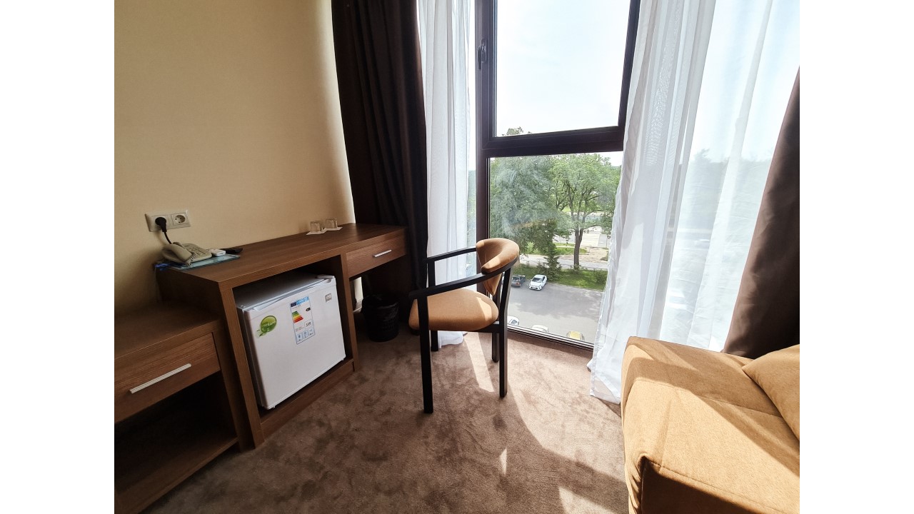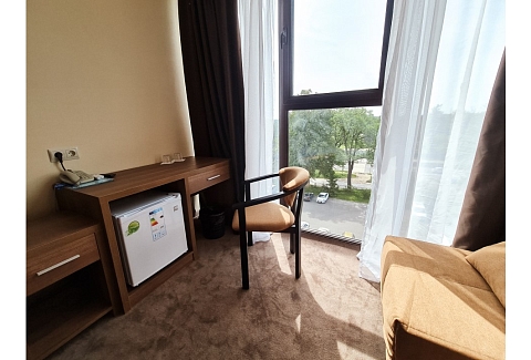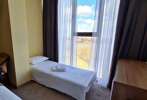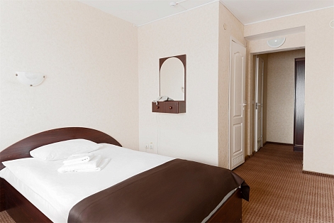 В номере: вешалка, зеркало, кровать односпальная, набор мягкой мебели, прикроватная тумбочка, стол, шкаф, мини-холодильник, телевизор, телефон
