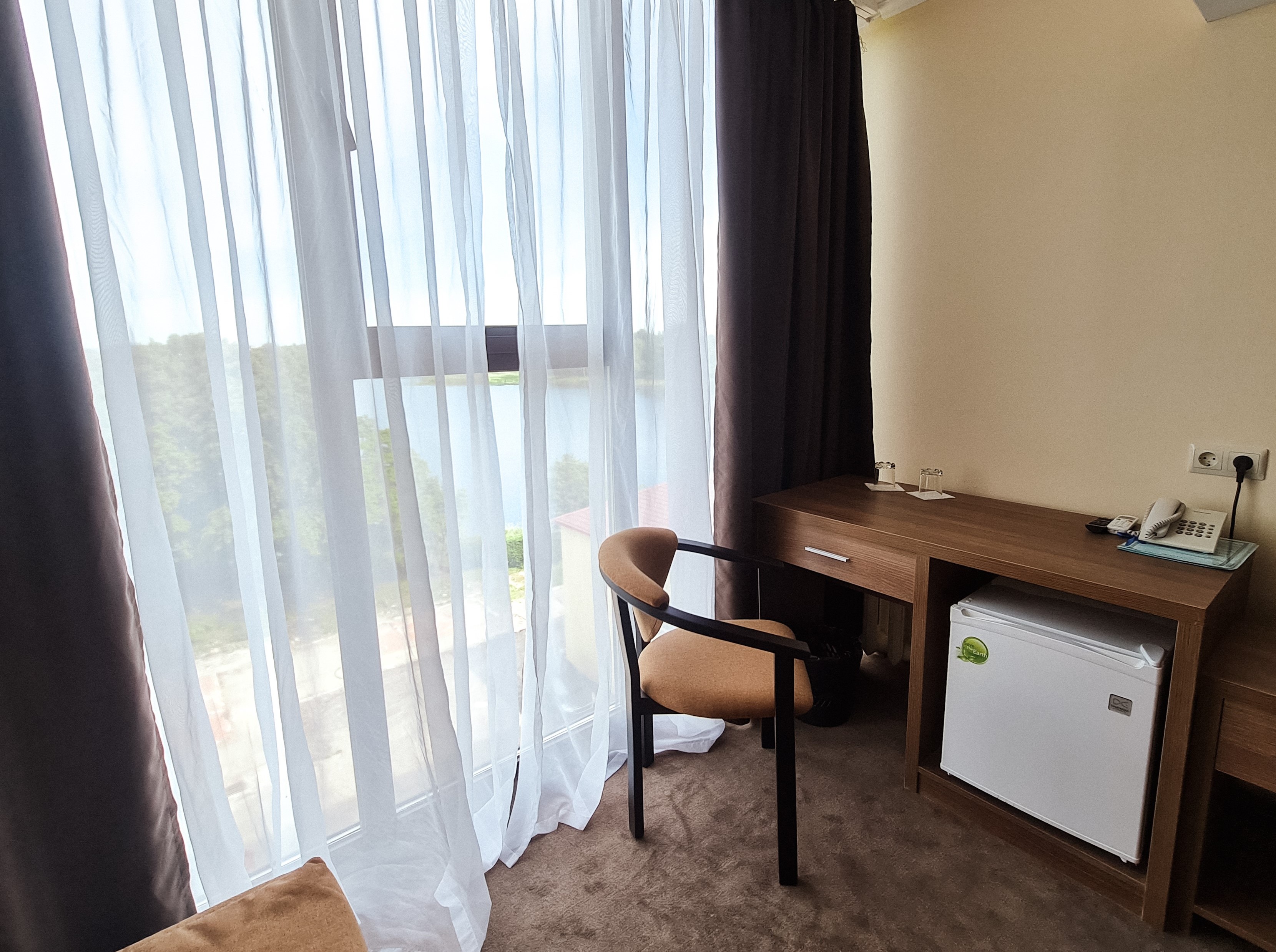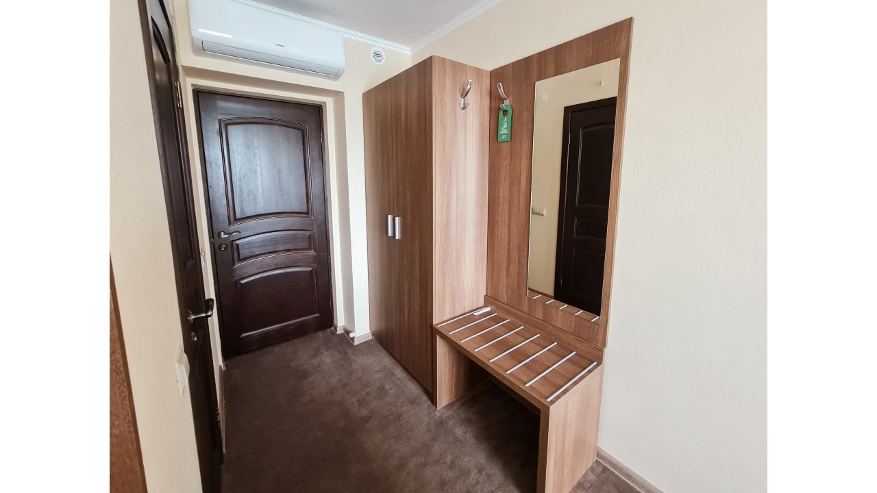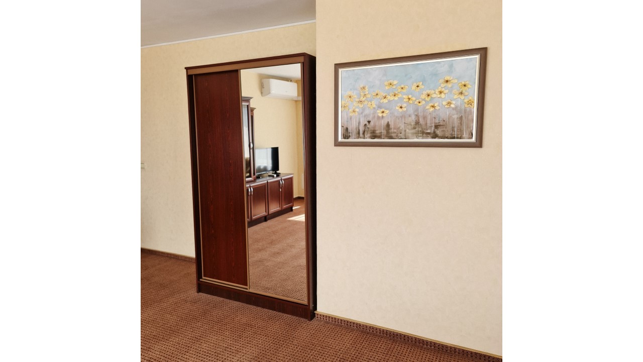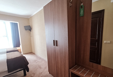 В номере: вешалка, зеркало, кровать двуспальная, набор мягкой мебели, стол, шкаф, мини-холодильник, телевизор, телефон