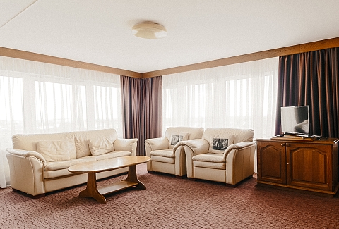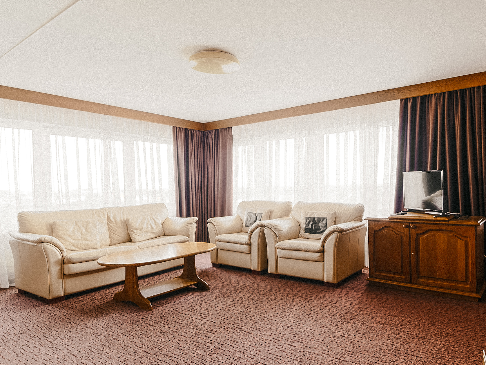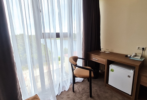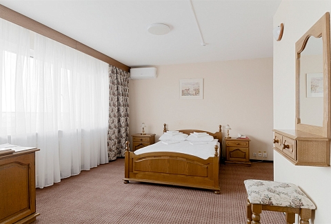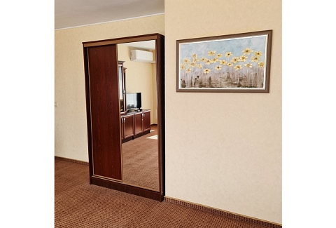 В номере: зеркало, кровать двуспальная, набор мягкой мебели, стол, столик журнальный, шкаф, кондиционер, мини-холодильник, телевизор, телефон