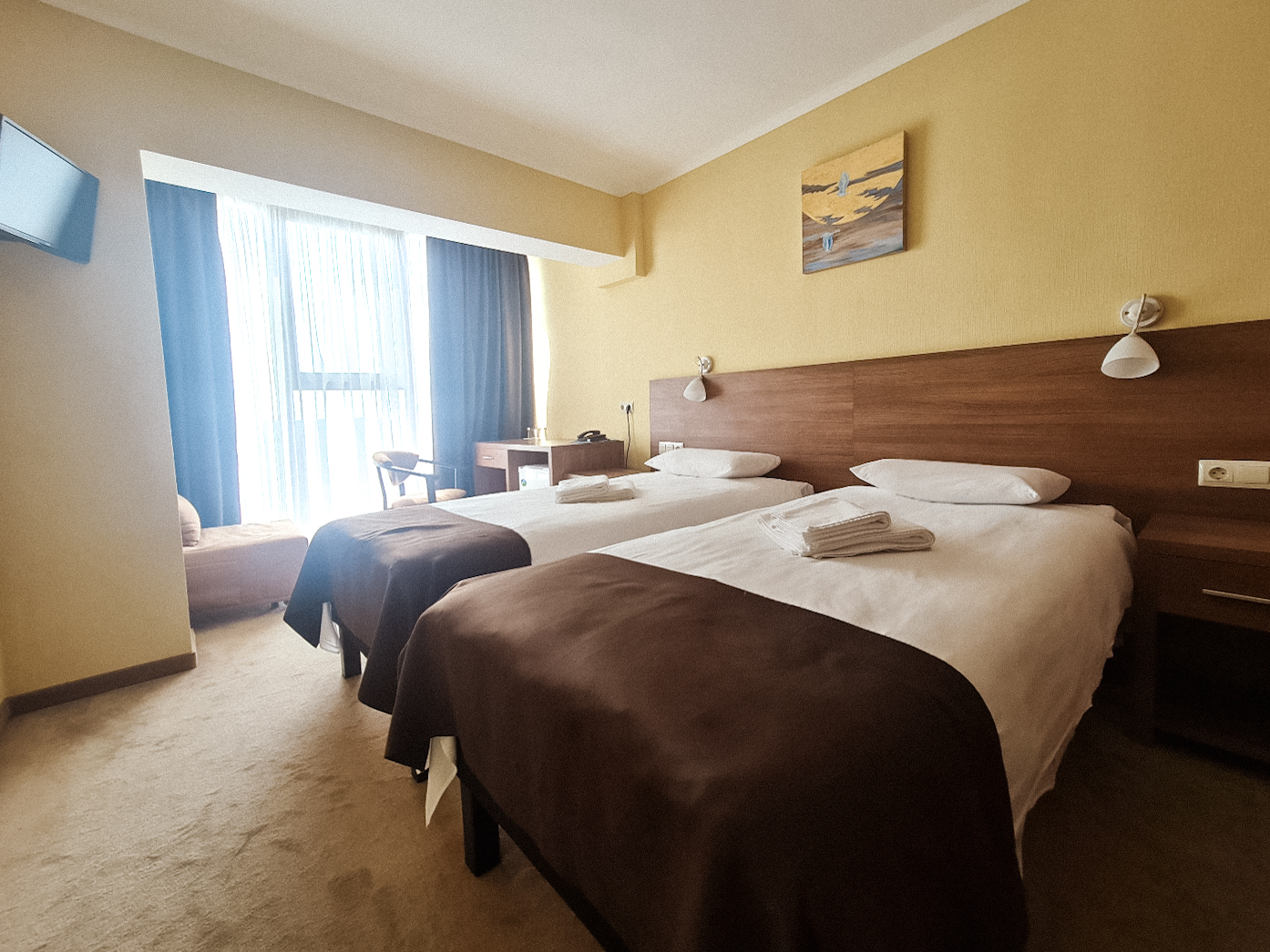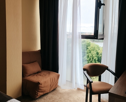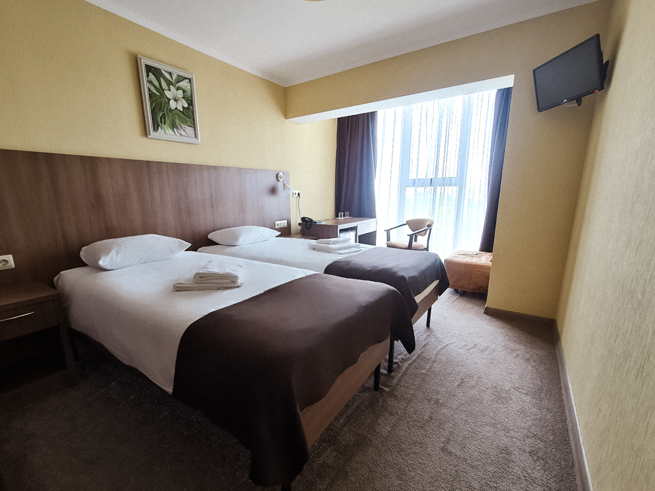 В номере: вешалка, зеркало, кресло-кровать, кровати односпальные /одна двуспальная кровать, прикроватные тумбочки, стол, стулья, шкаф, мини-холодильник, телевизор, телефон