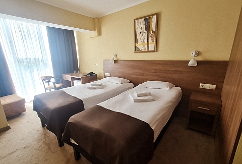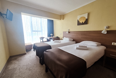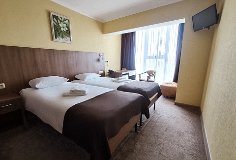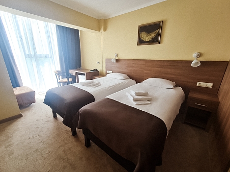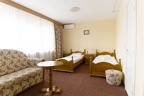 В номере: вешалка, диван раскладной, зеркало, кровати односпальные, набор мягкой мебели, прикроватные тумбочки, шкаф, кондиционер, мини-холодильник, телевизор, телефон