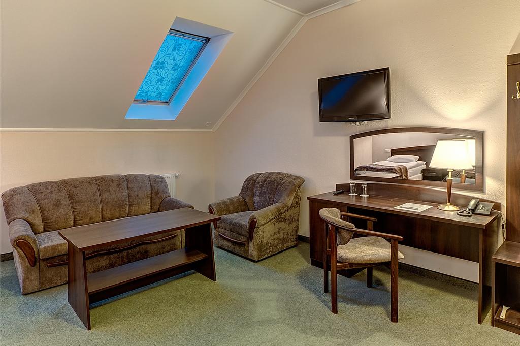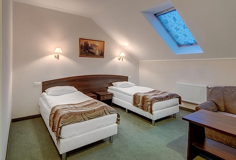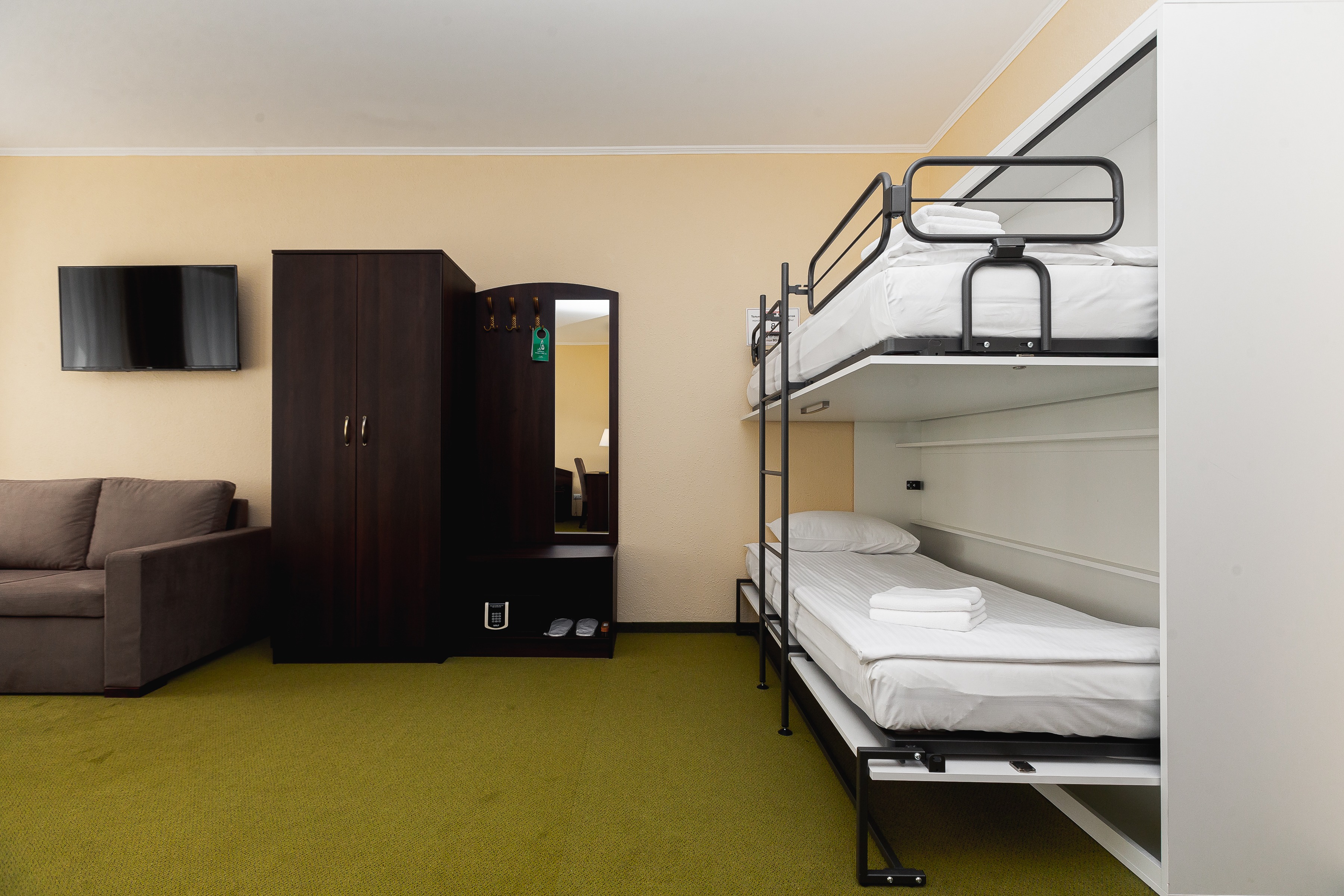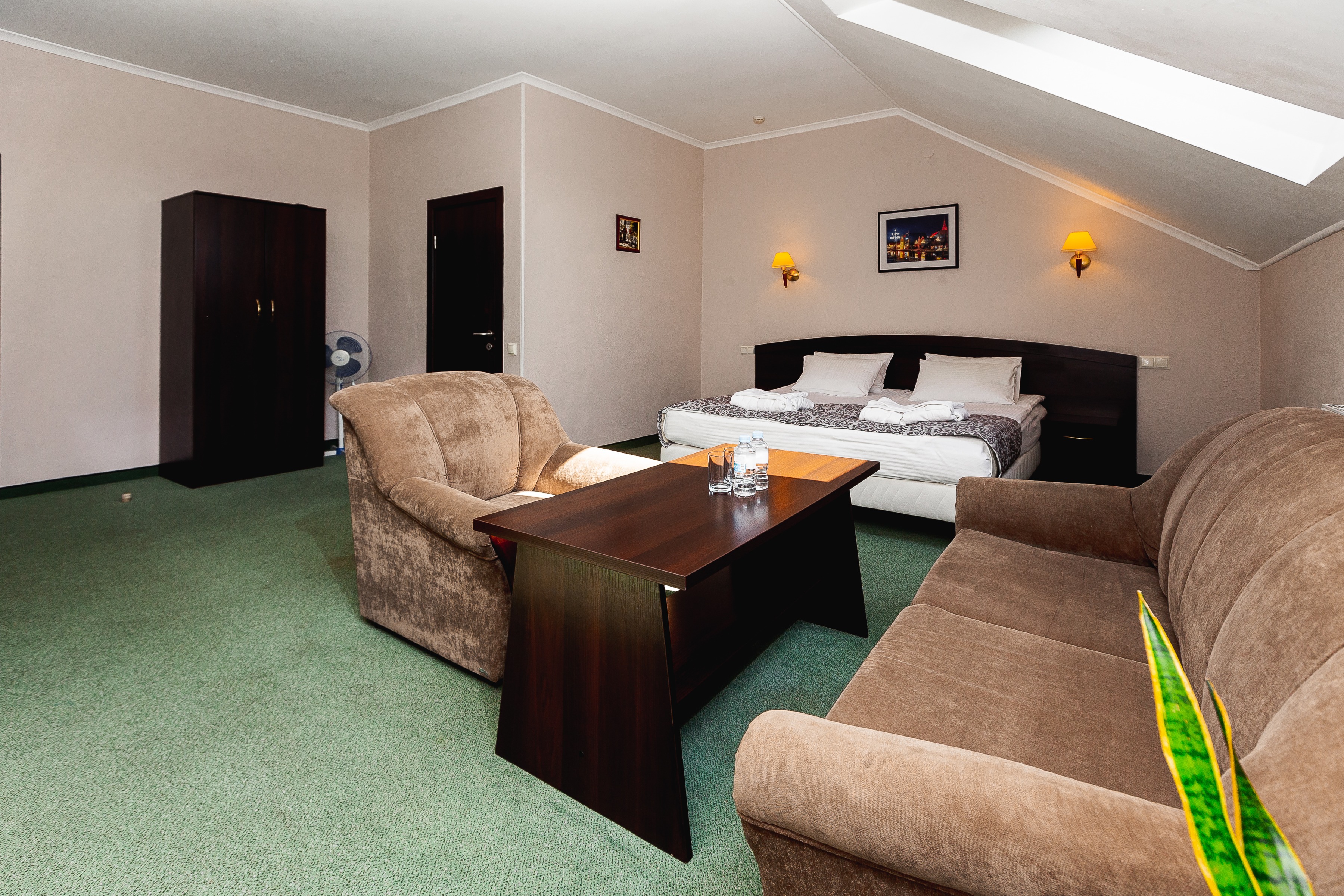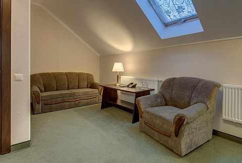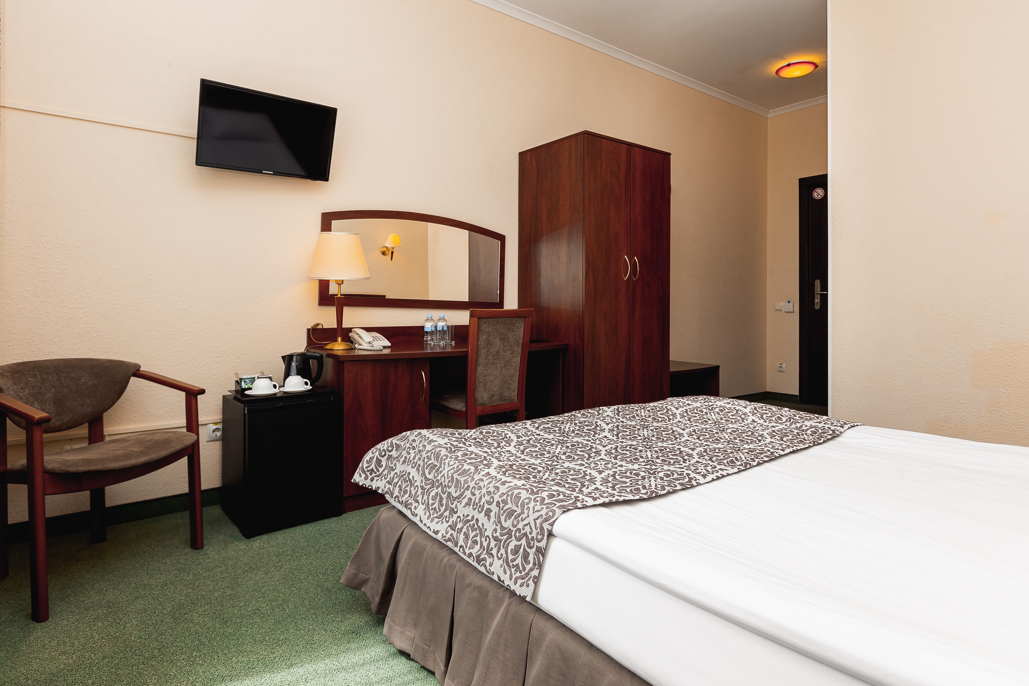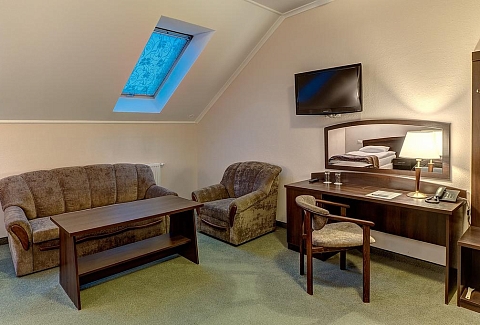 В номере: вешалка, диван, зеркало, ковровое покрытие, кресло, кровати односпальные /одна двуспальная кровать, прикроватные тумбочки, стол, стул, сейф, телевизор, телефон, холодильник, чайный набор посуды, электрочайник