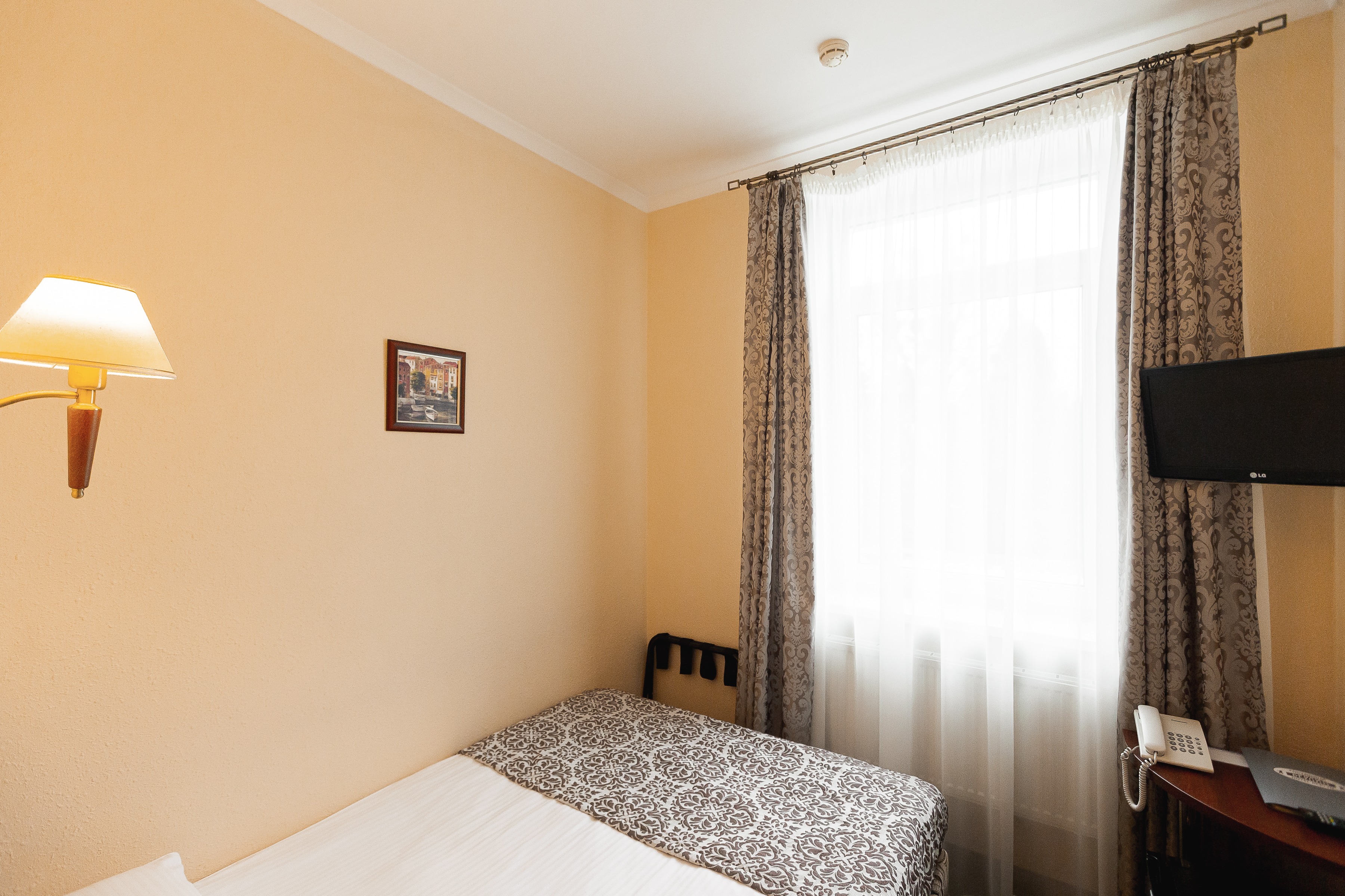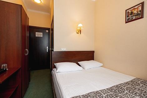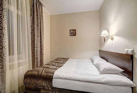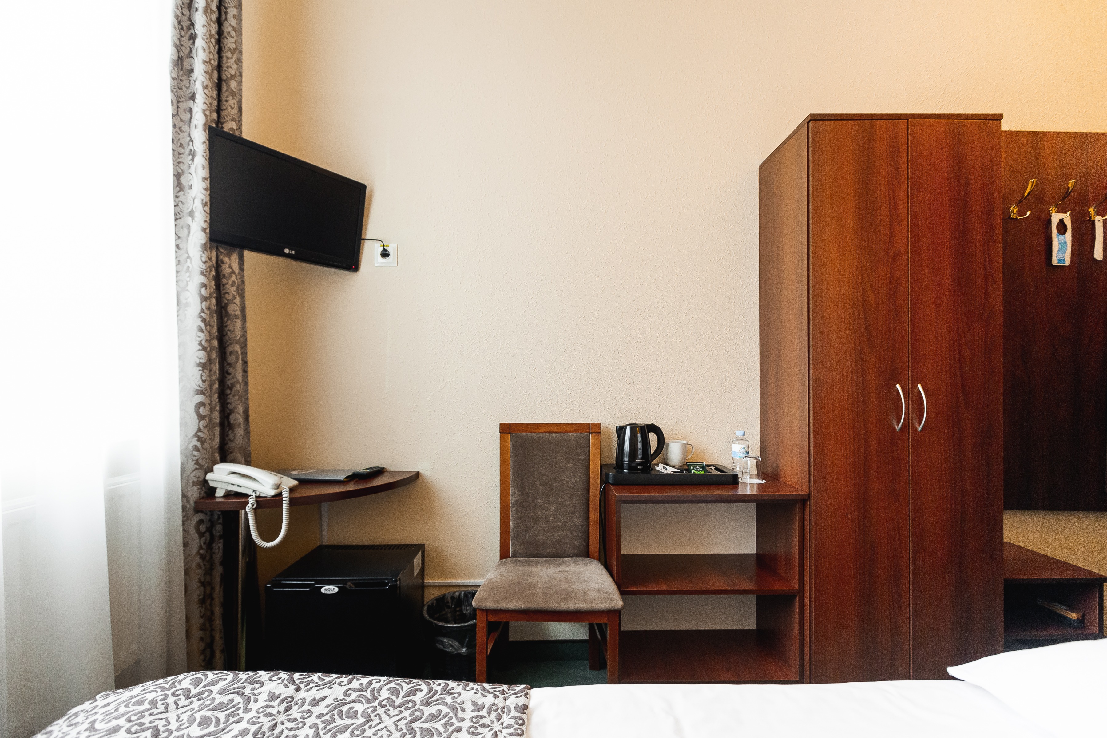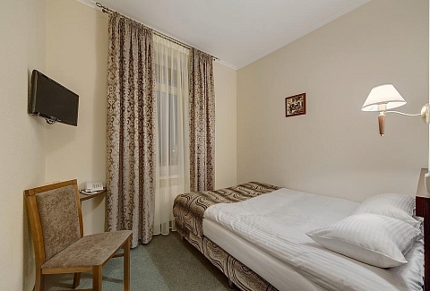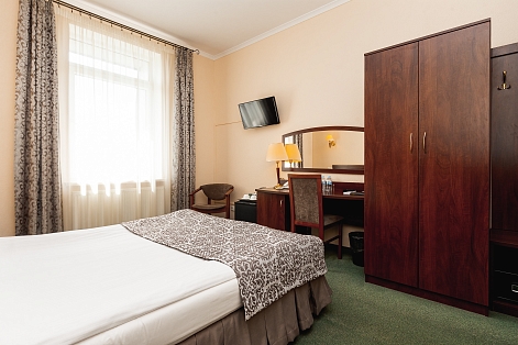 В номере: вешалка, зеркало, кровать полутороспальная, прикроватные тумбочки, стул, телевизор, телефон, холодильник, чайный набор посуды