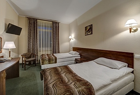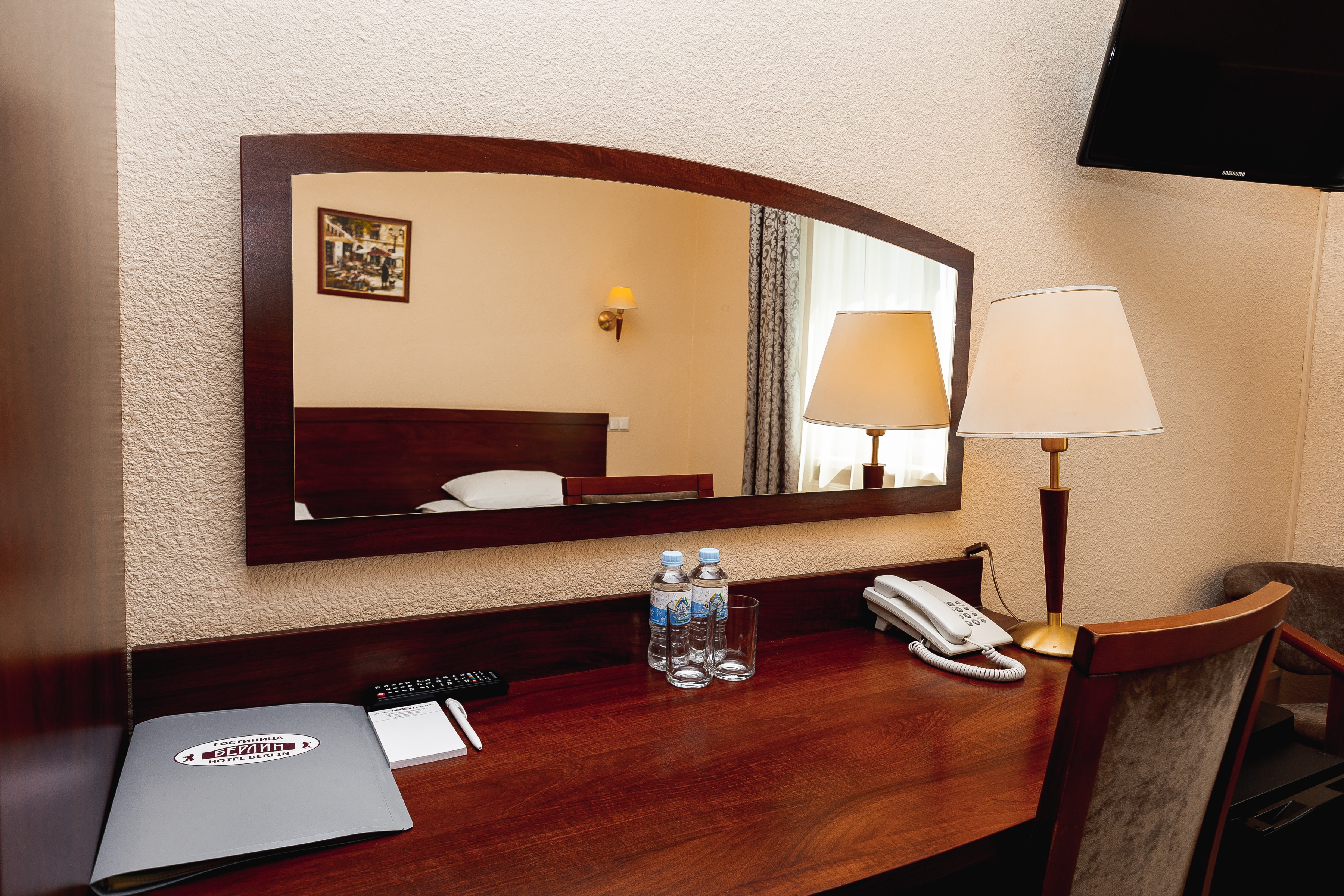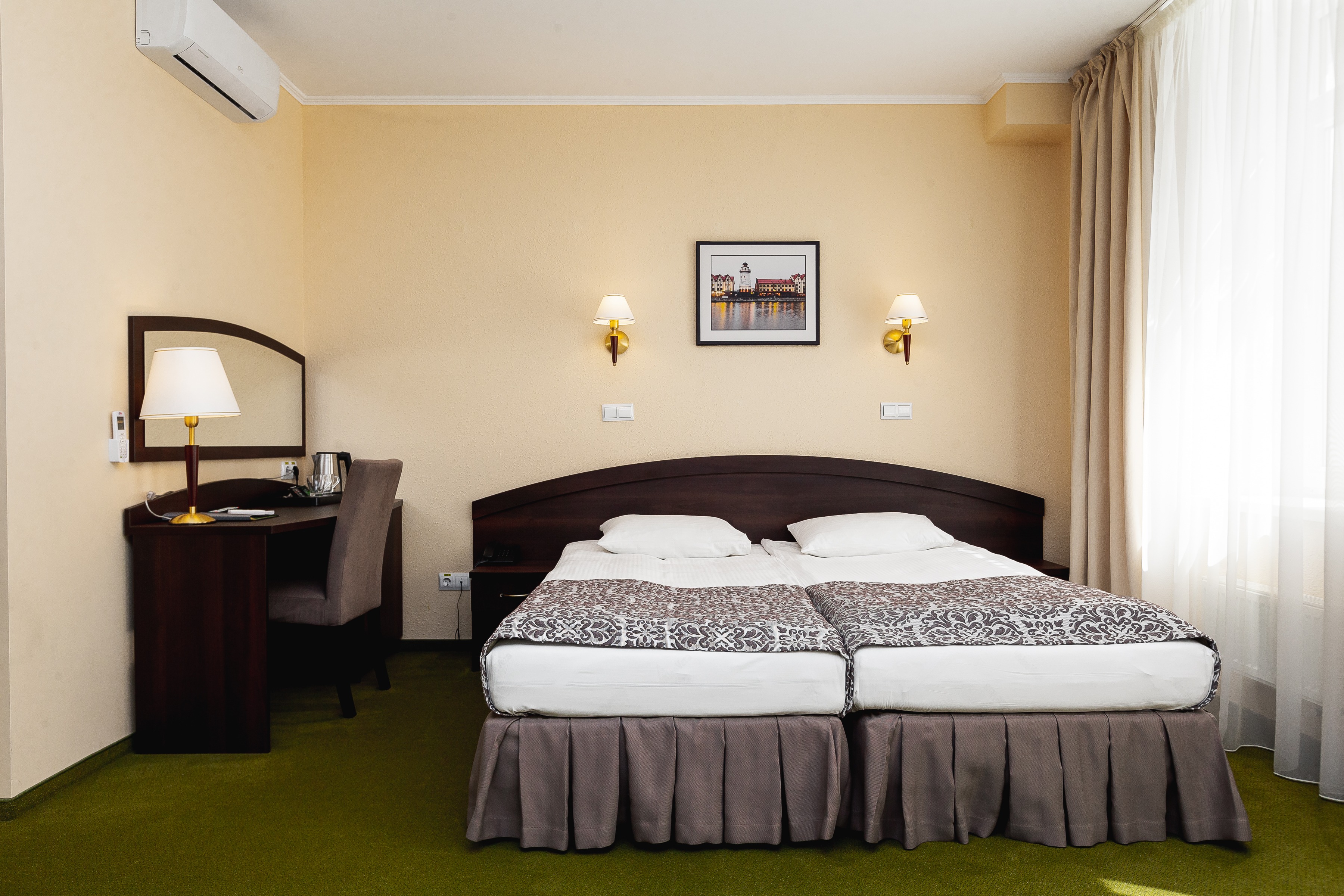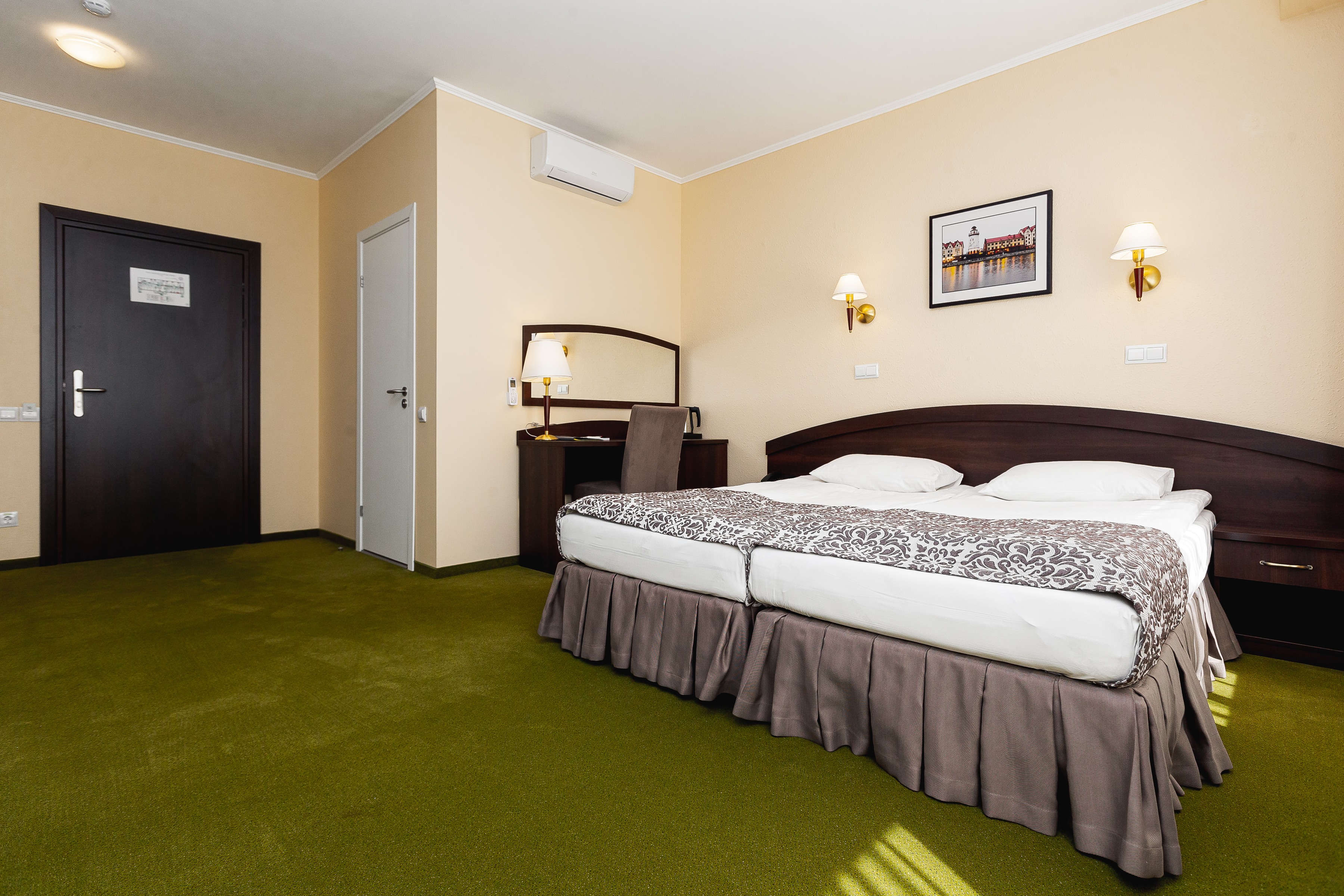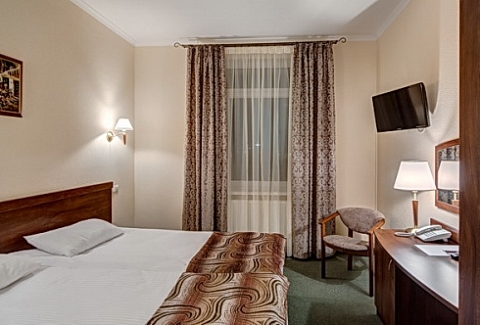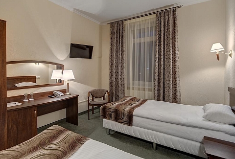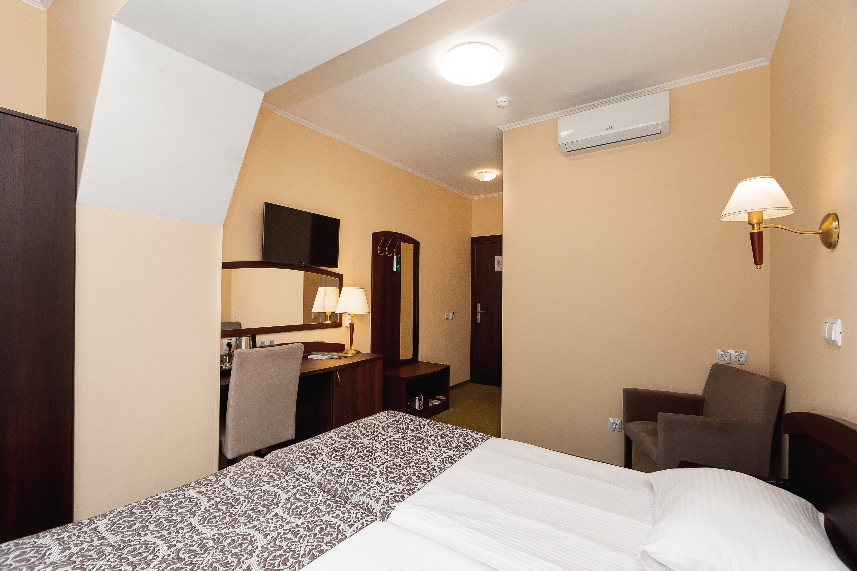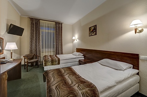 В номере: зеркало, кровати односпальные /одна двуспальная кровать, прикроватные тумбочки, стол, стул, сейф, телевизор, телефон, холодильник, чайный набор посуды, электрочайник