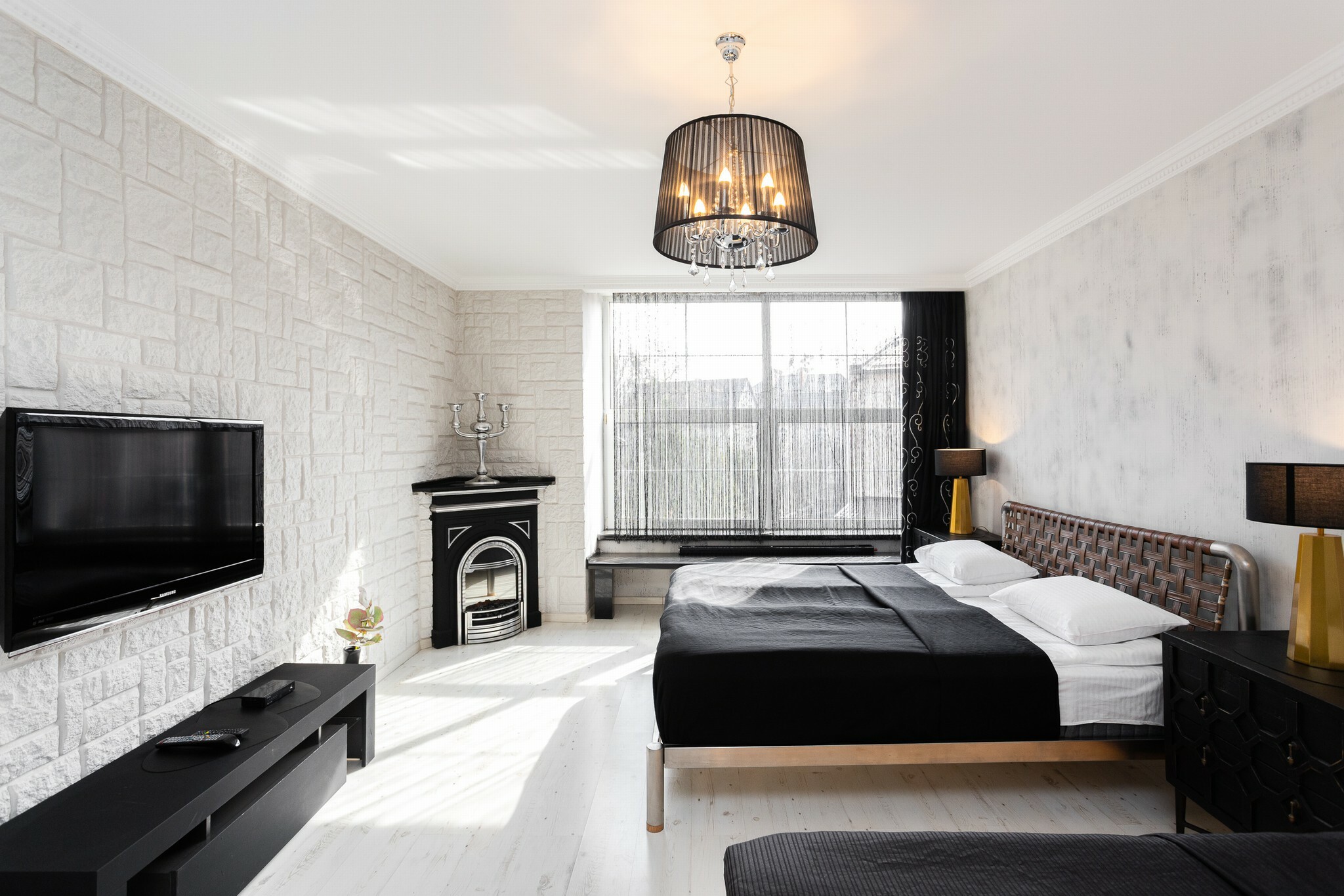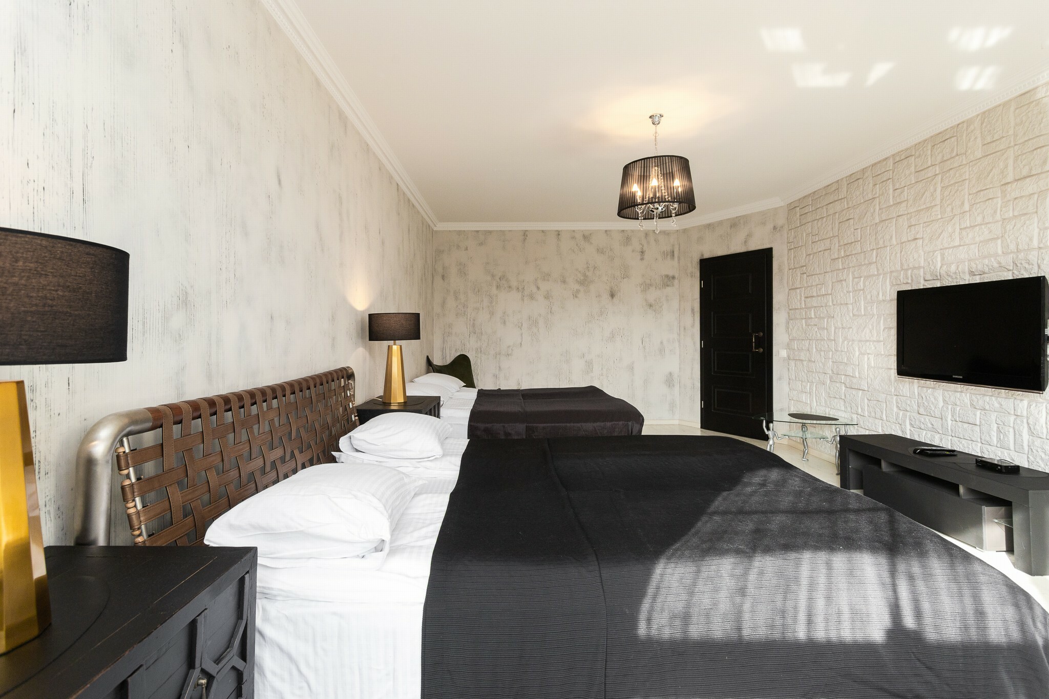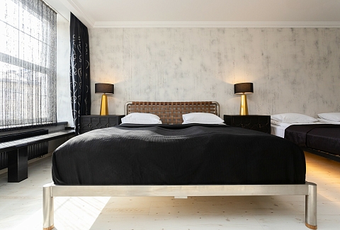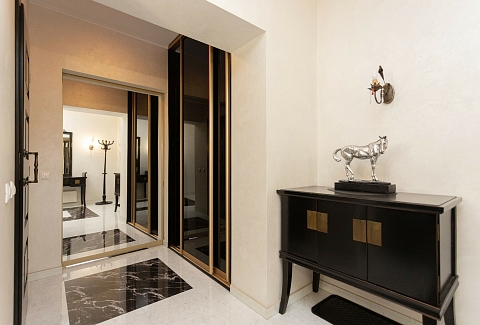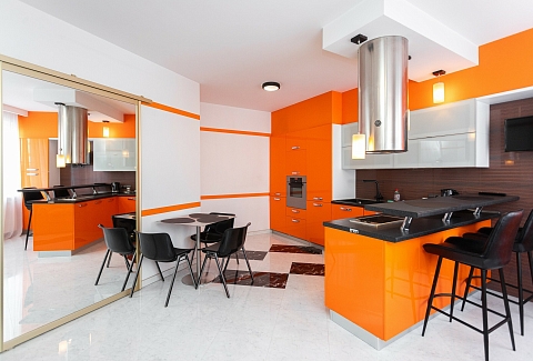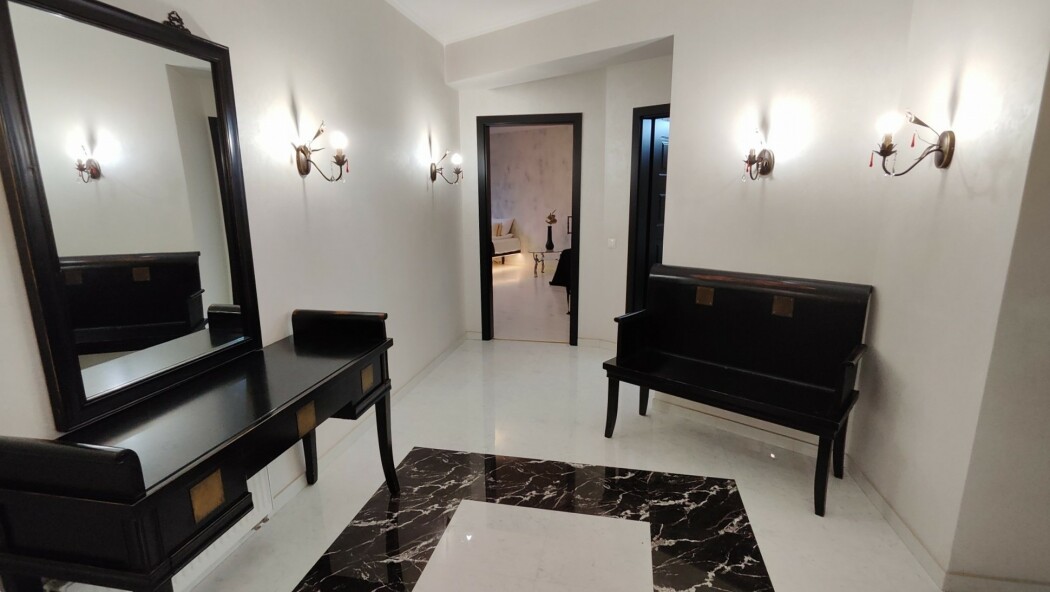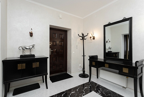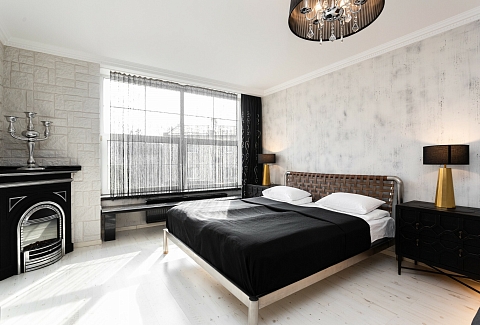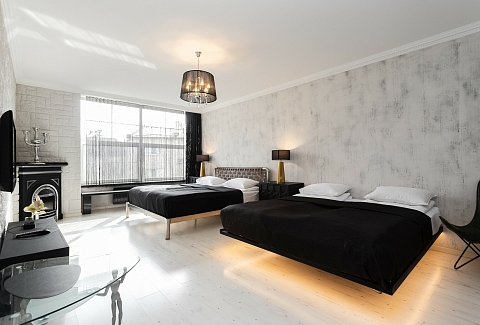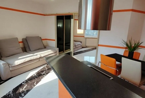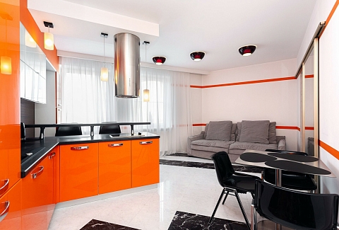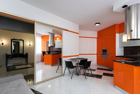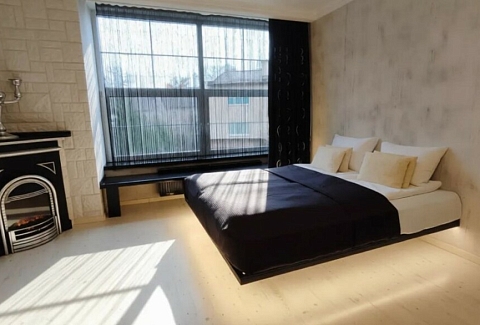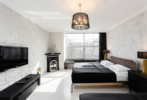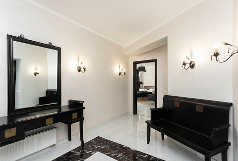 В номере: вешалка, диван, зеркало, кровать двуспальная, стол, стулья, шкаф, гладильная доска, духовой шкаф, кондиционер, микроволновая печь, набор посуды, плита электрическая, стиральная машина, сушилка для белья, телевизор ЖК, утюг, холодильник, чайный набор посуды, электрочайник