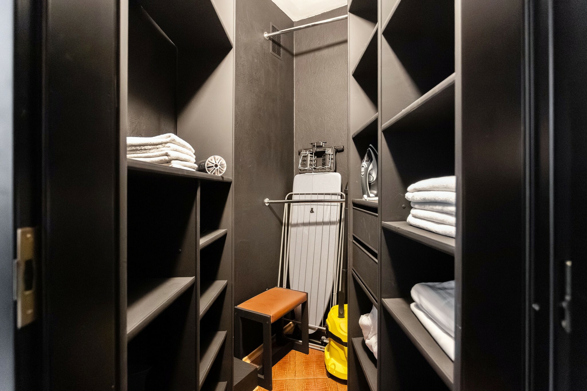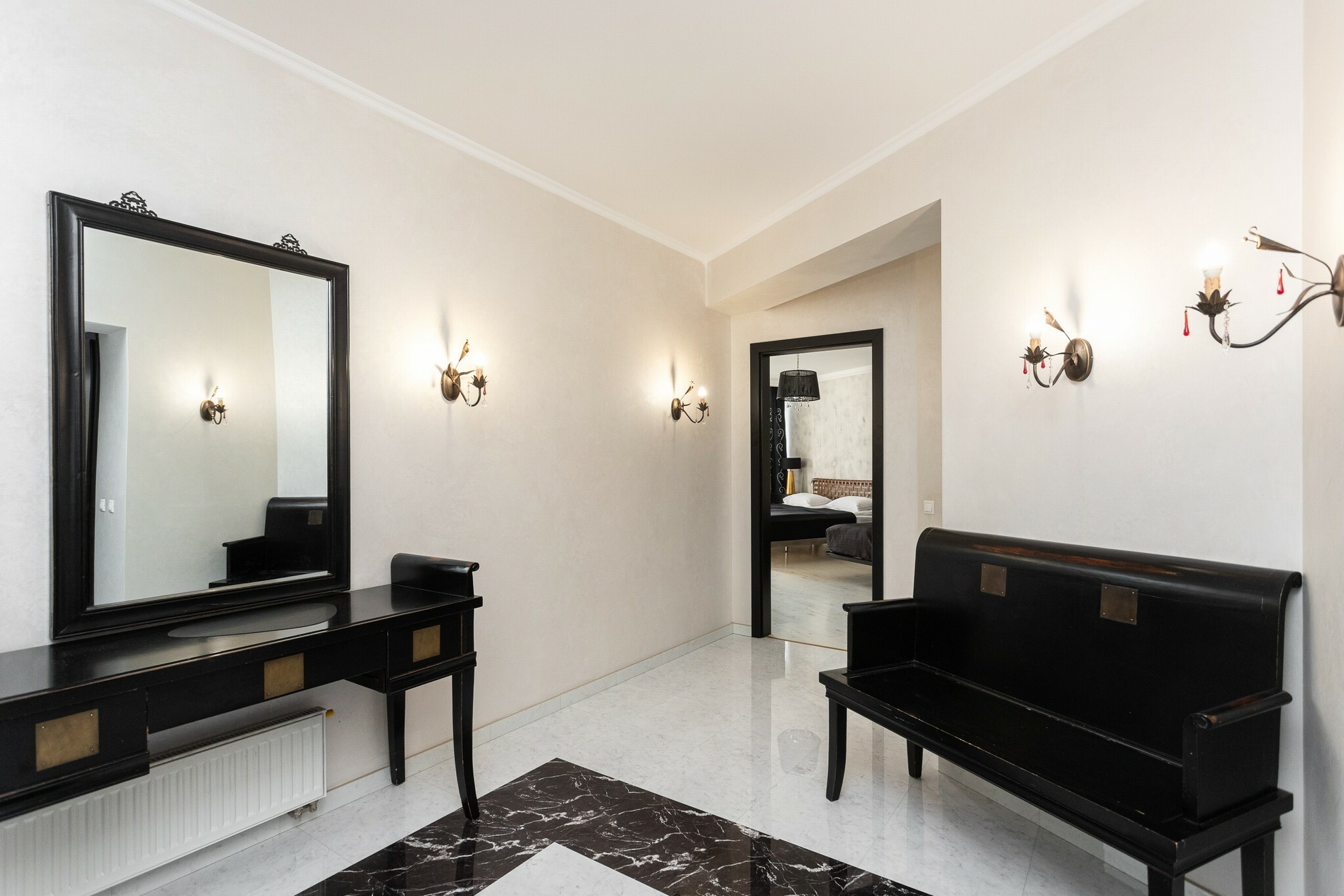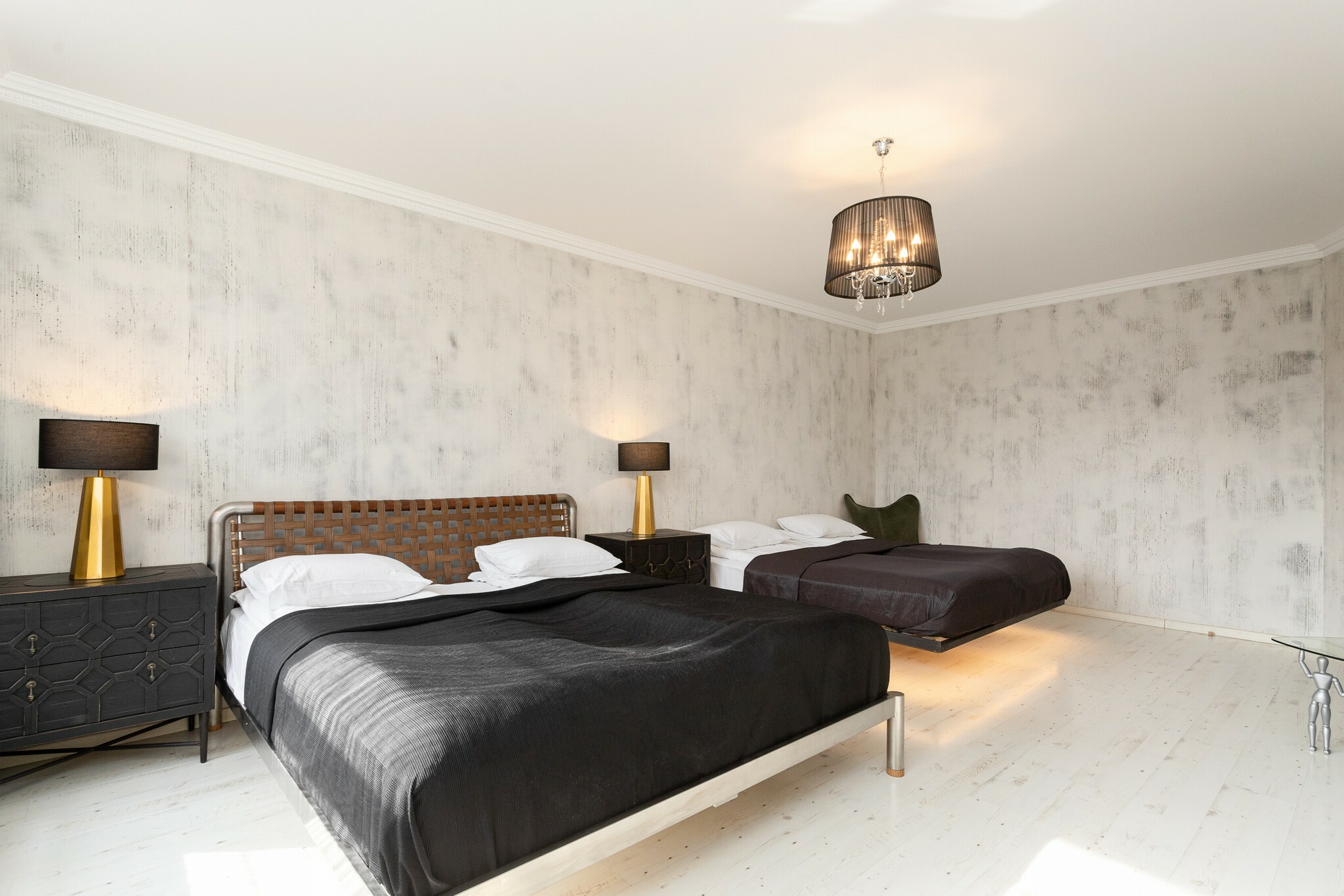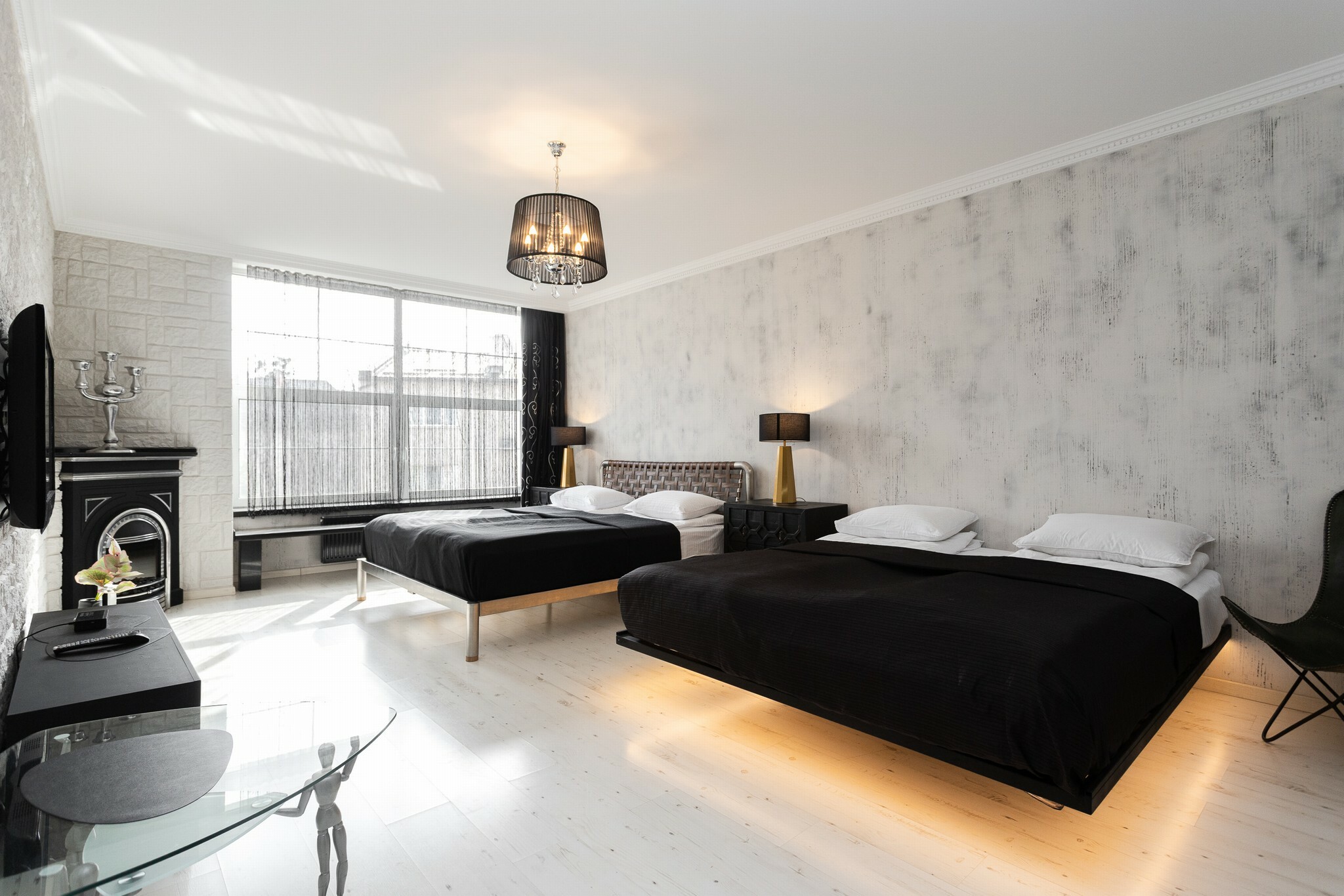 В номере: вешалка, диван, зеркало, кровать двуспальная, стол, стулья, шкаф, гладильная доска, духовой шкаф, кондиционер, микроволновая печь, набор посуды, плита электрическая, стиральная машина, сушилка для белья, телевизор ЖК, утюг, холодильник, чайный набор посуды, электрочайник