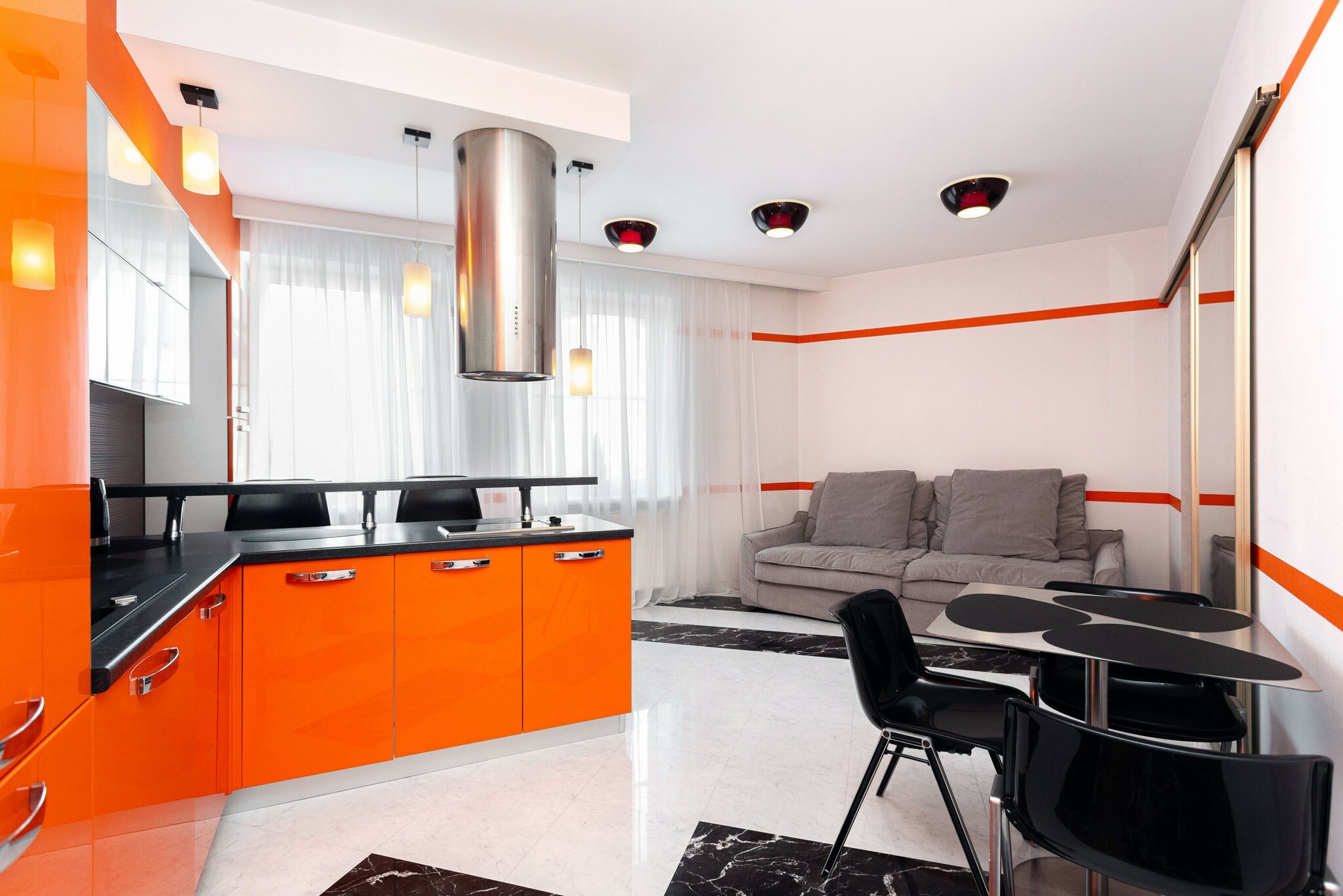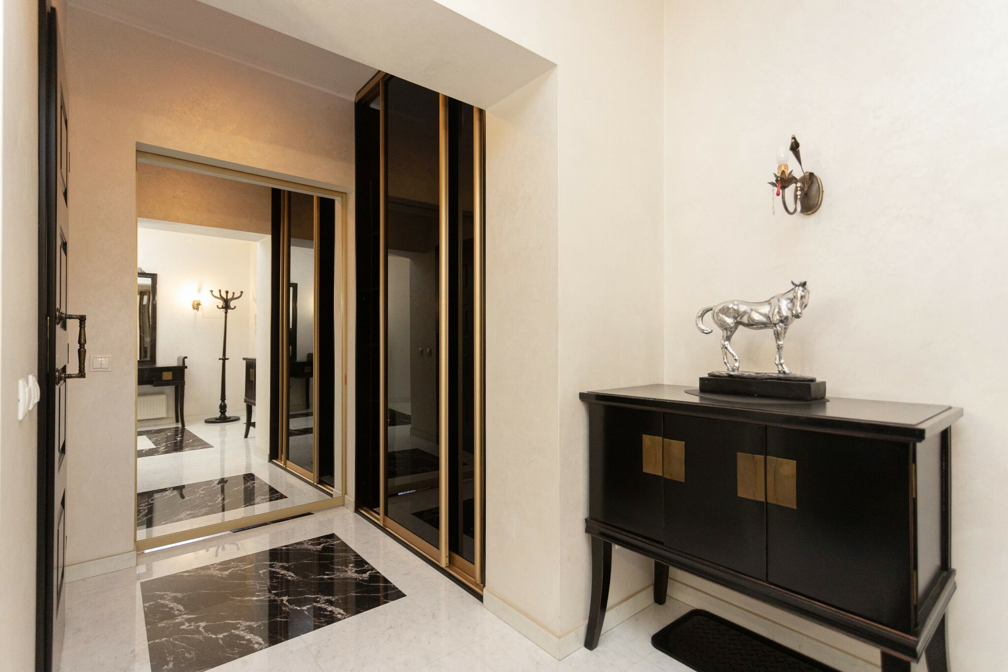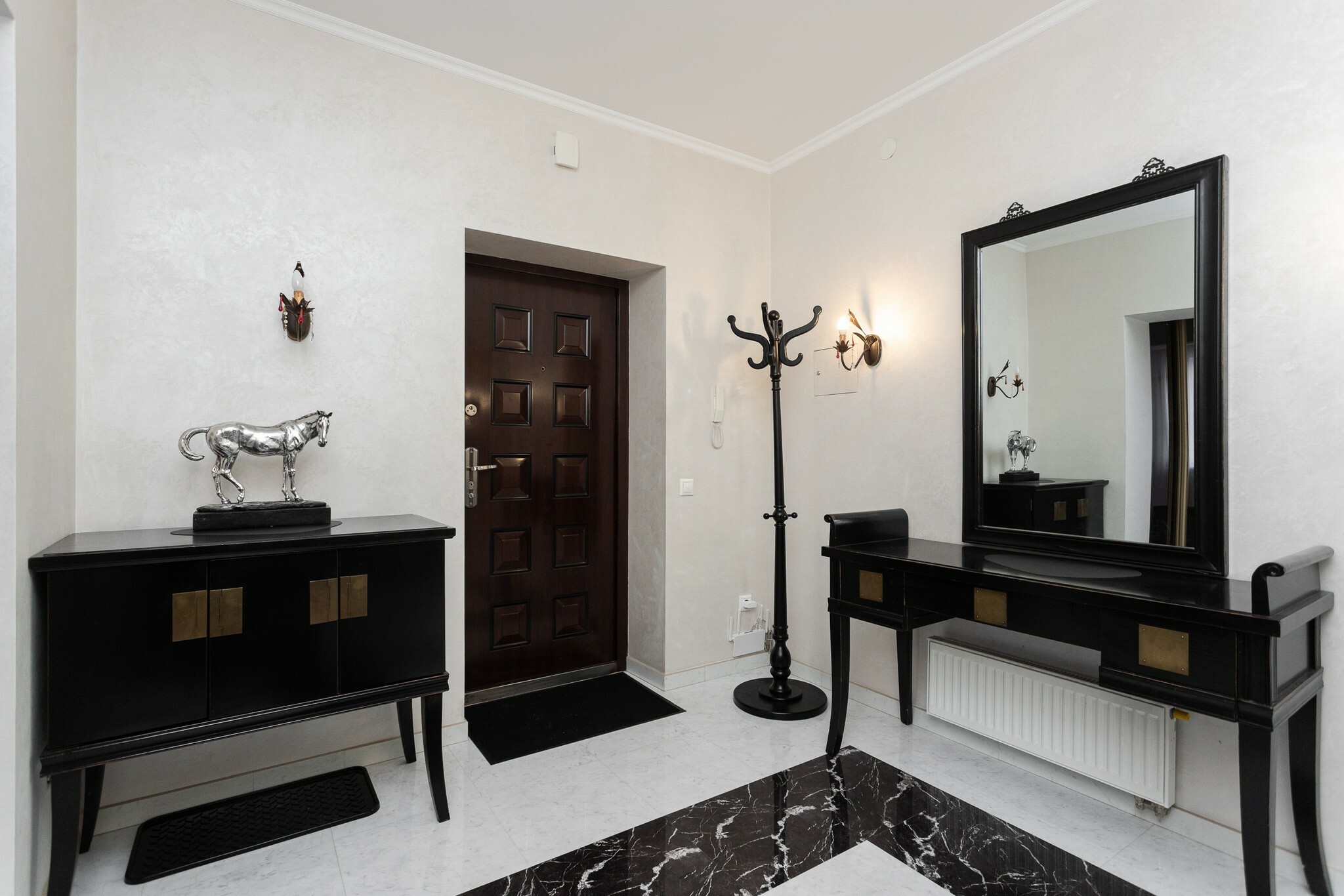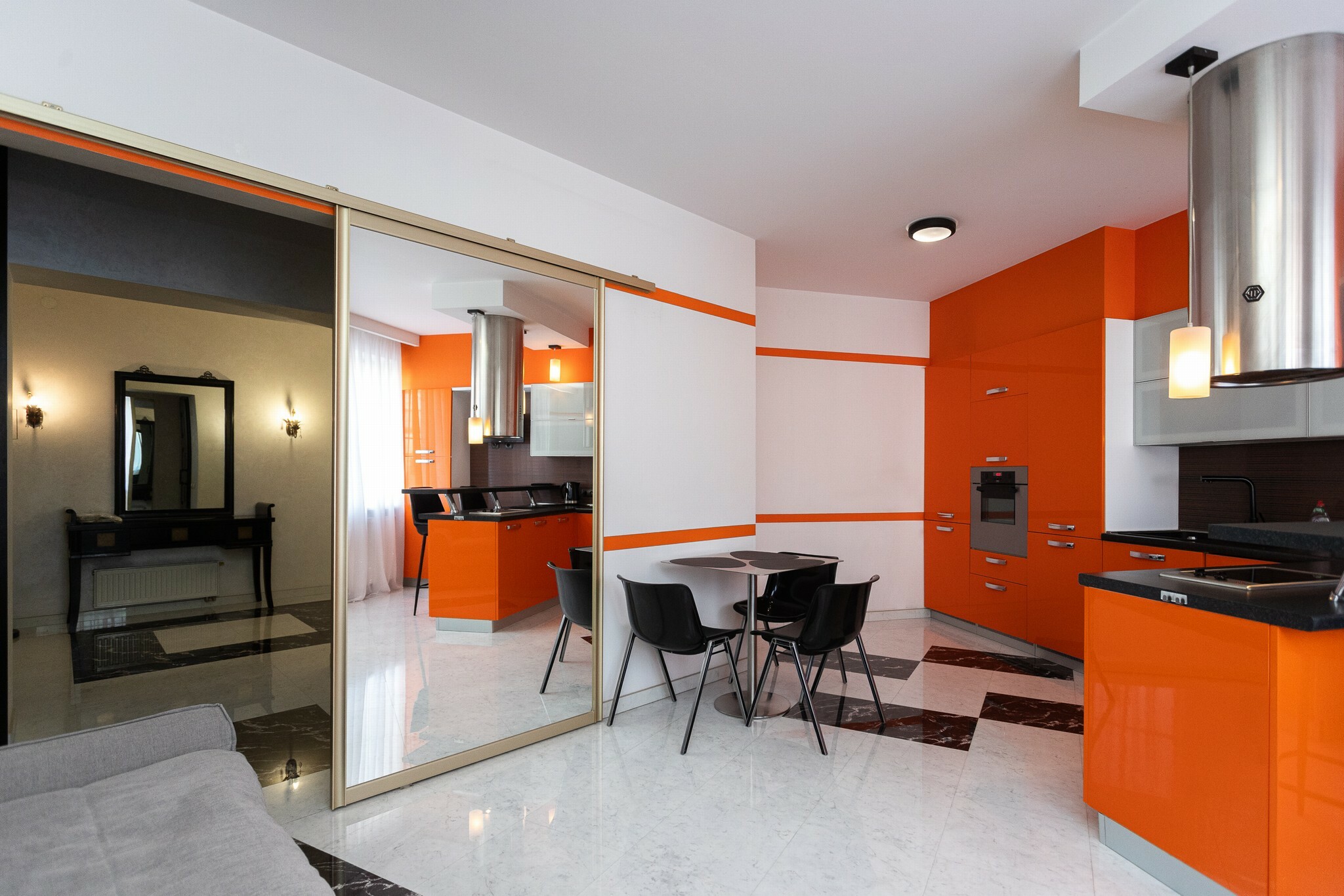 В номере: вешалка, диван, зеркало, кровать двуспальная, стол, стулья, шкаф, гладильная доска, духовой шкаф, кондиционер, микроволновая печь, набор посуды, плита электрическая, стиральная машина, сушилка для белья, телевизор ЖК, утюг, холодильник, чайный набор посуды, электрочайник