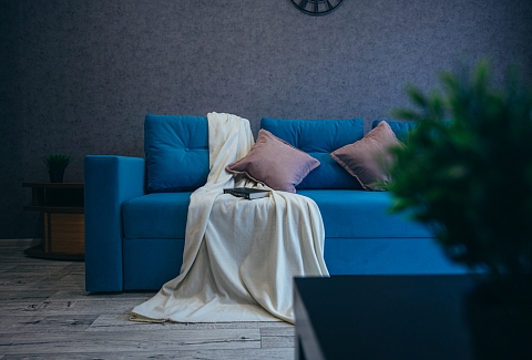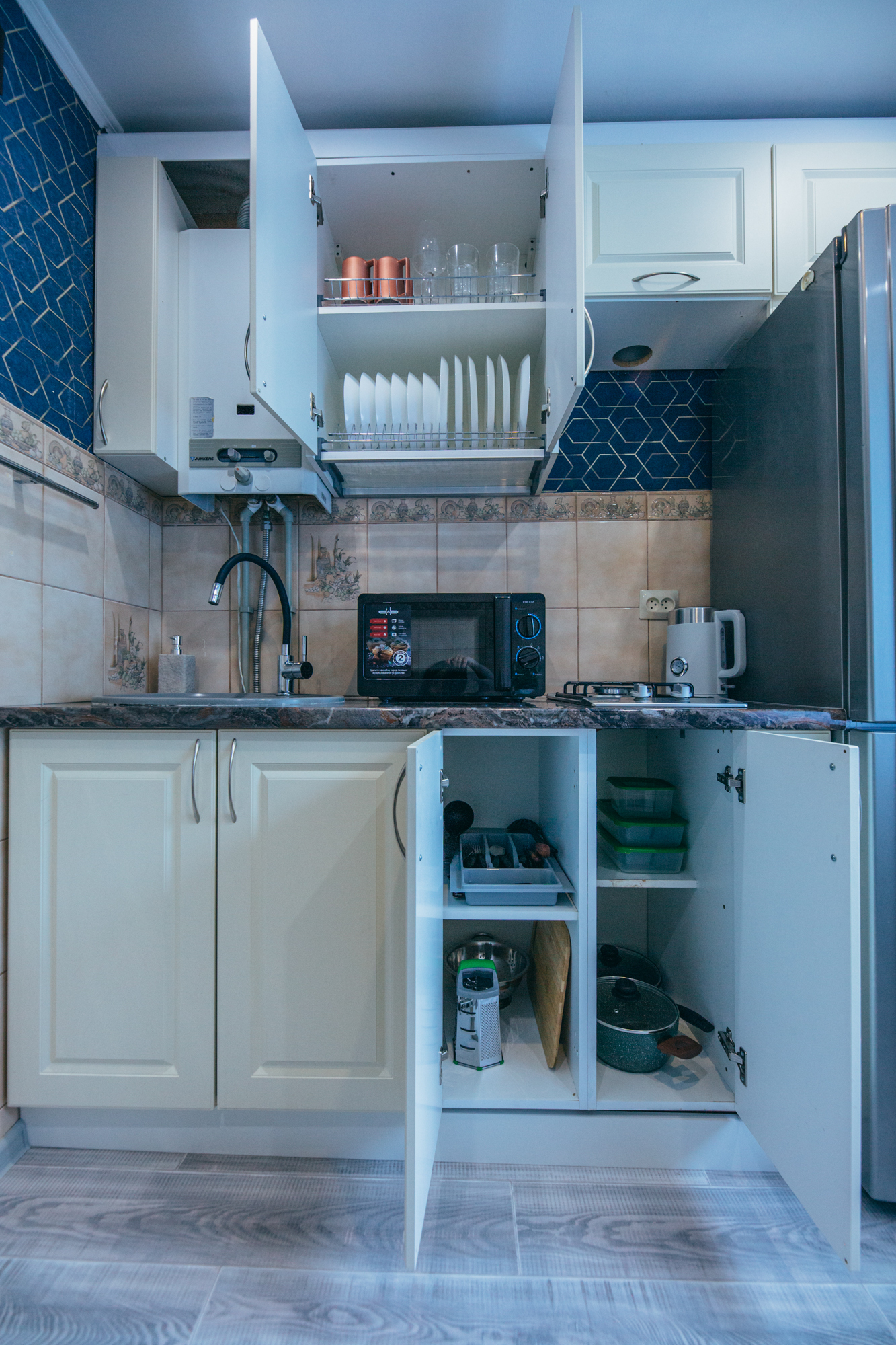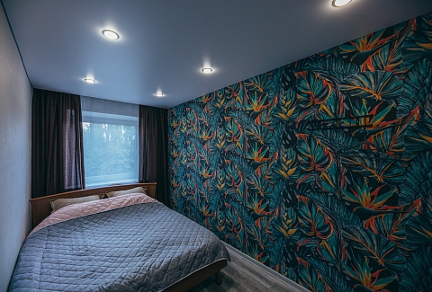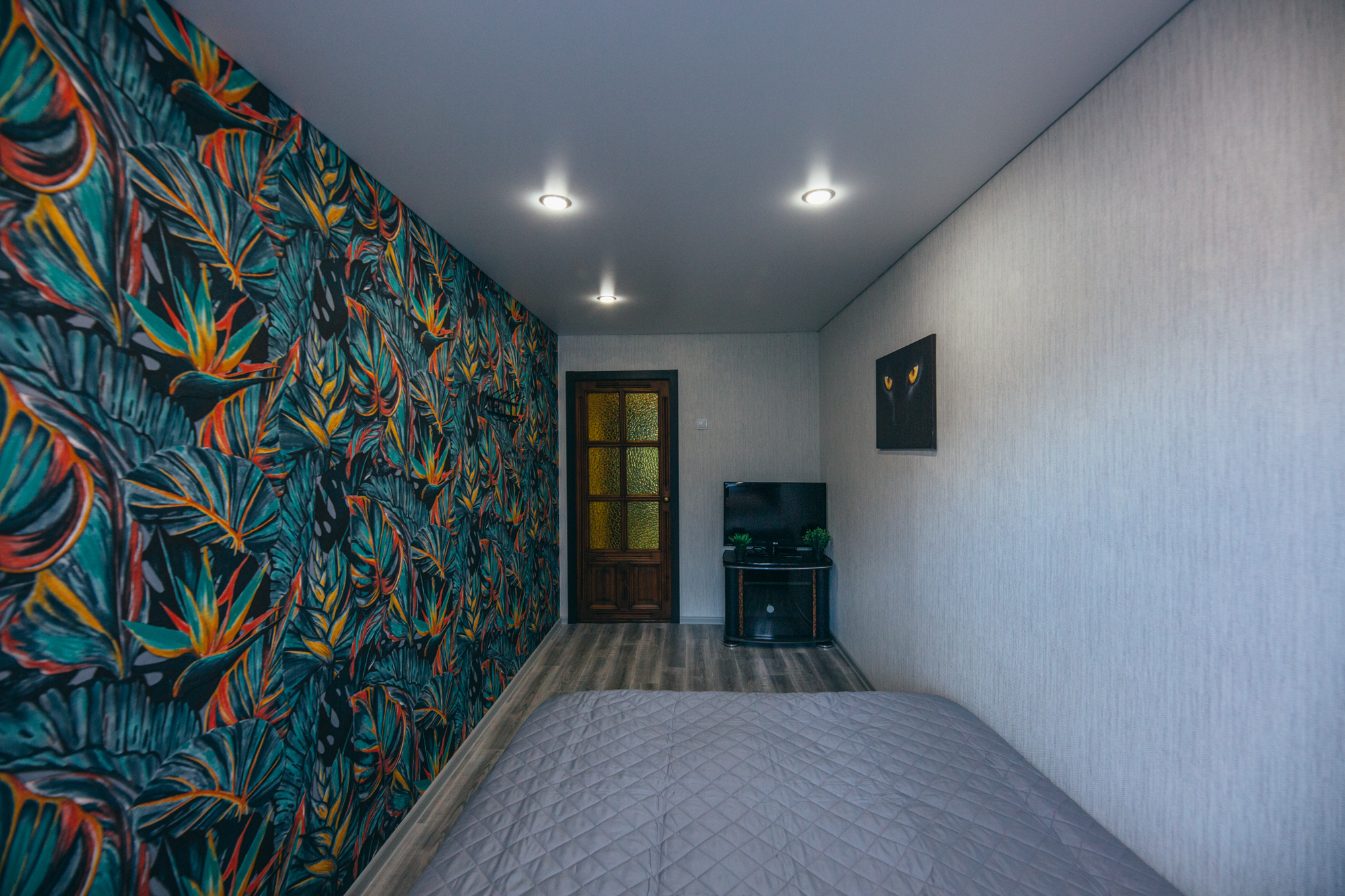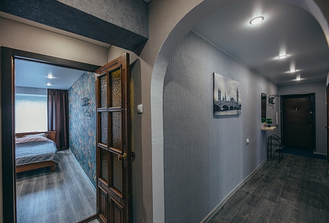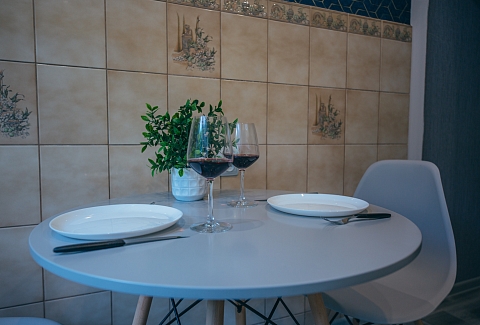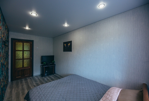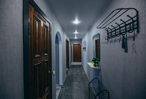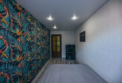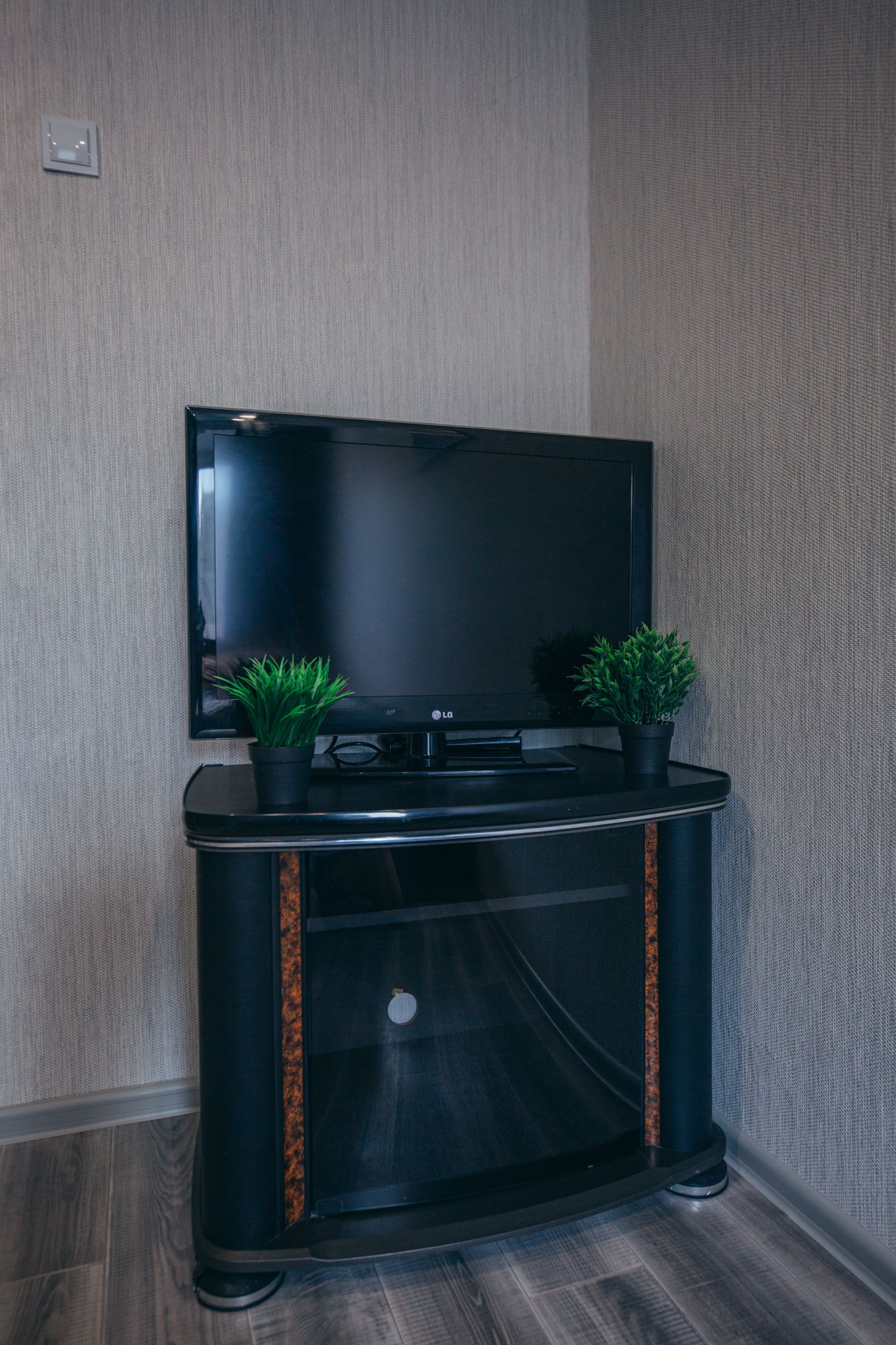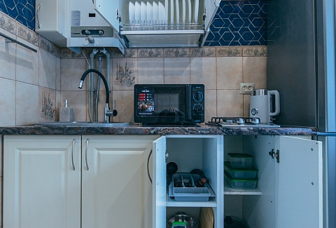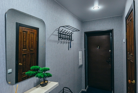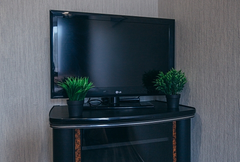 В номере: диван, зеркало, кровать двуспальная, стол, стулья, шкаф, кондиционер, микроволновая печь, набор посуды, плита электрическая, стиральная машина, сушилка для белья, телевизор ЖК, утюг, холодильник, чайный набор посуды, электрочайник