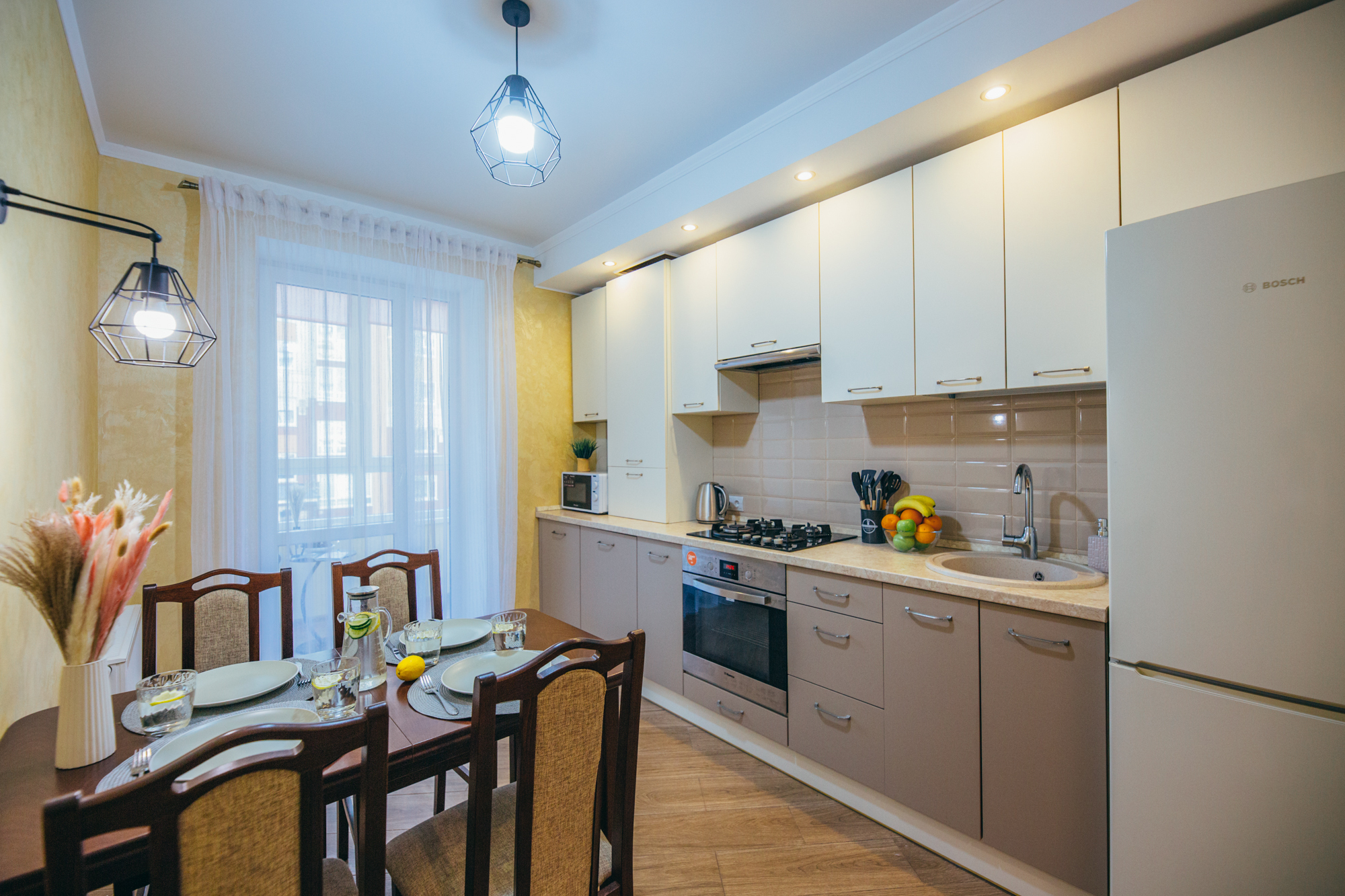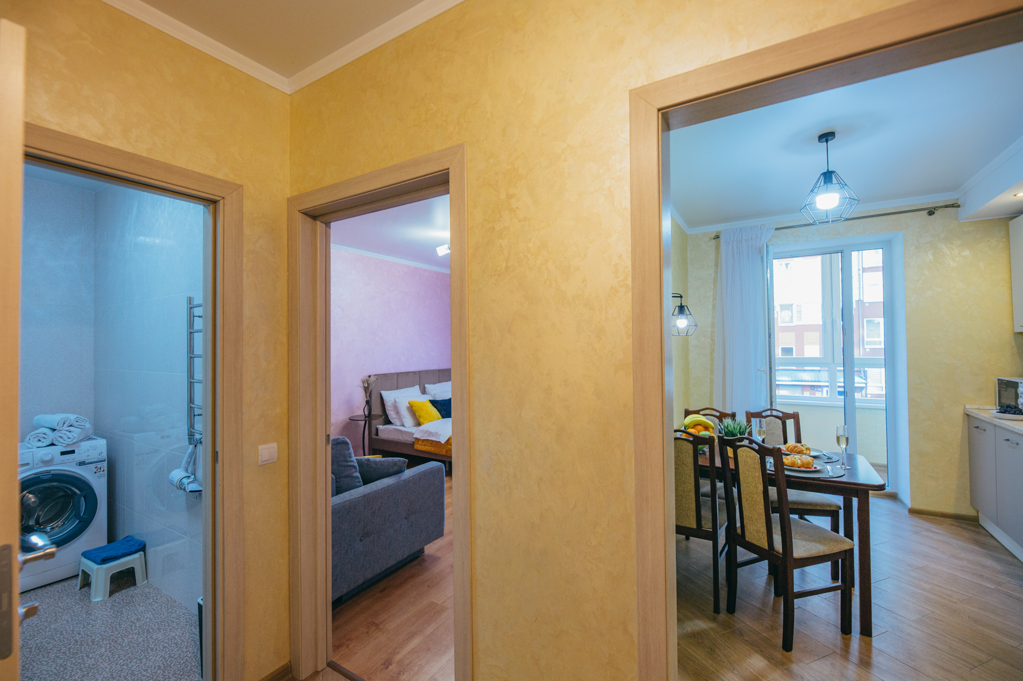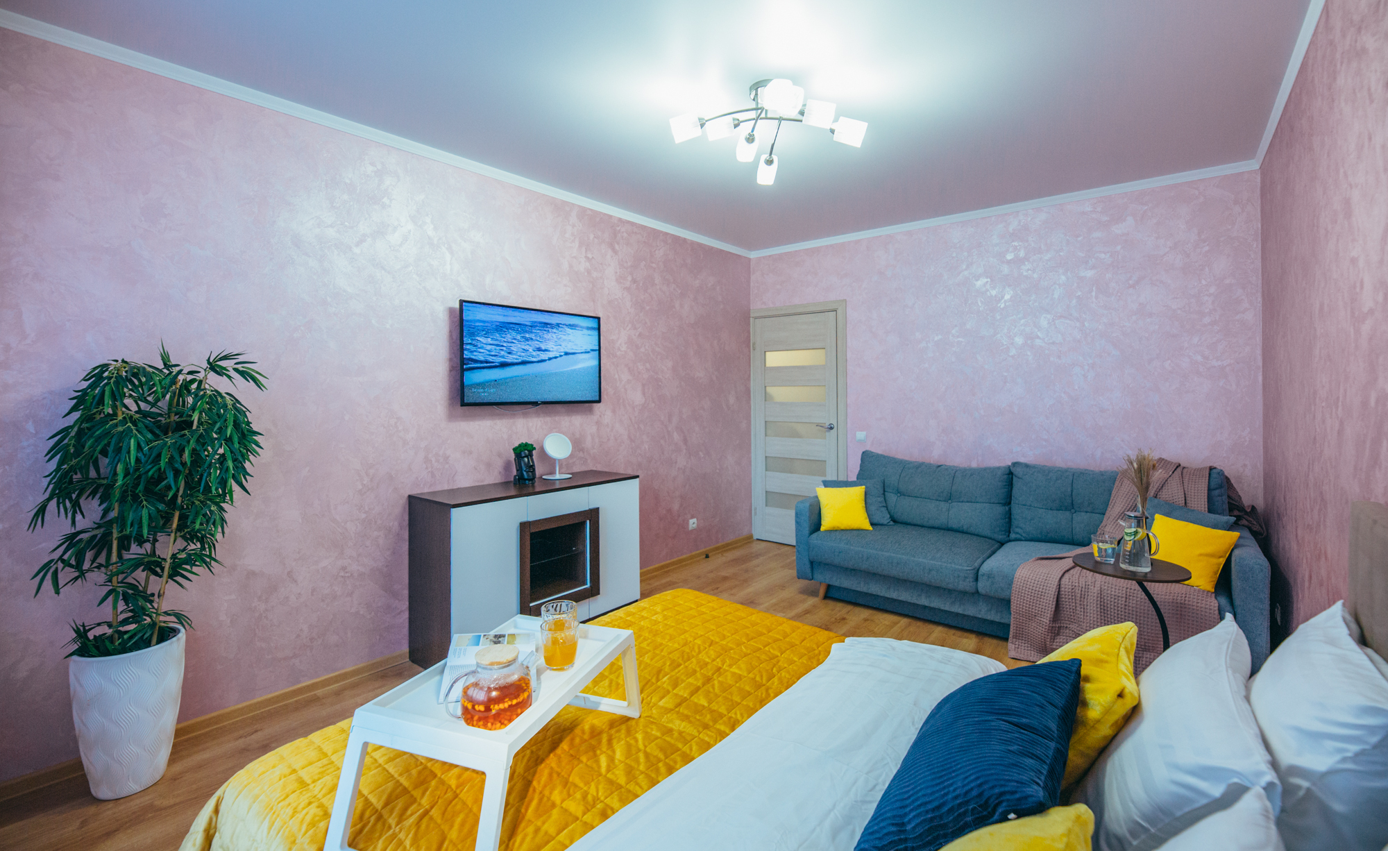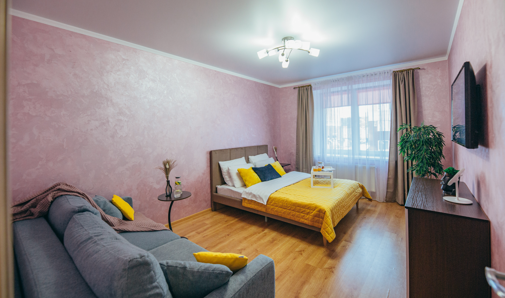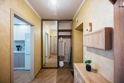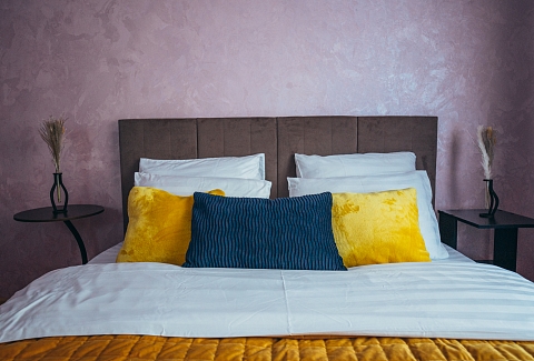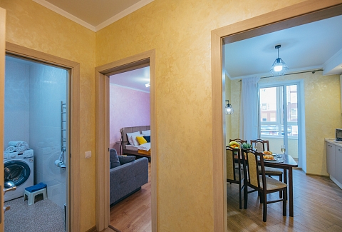 В номере: вешалка, диван, зеркало, кровать двуспальная, кухонная мебель, прикроватные тумбочки, стол, стулья, шкаф, кондиционер, микроволновая печь, стиральная машина, телевизор, утюг, холодильник