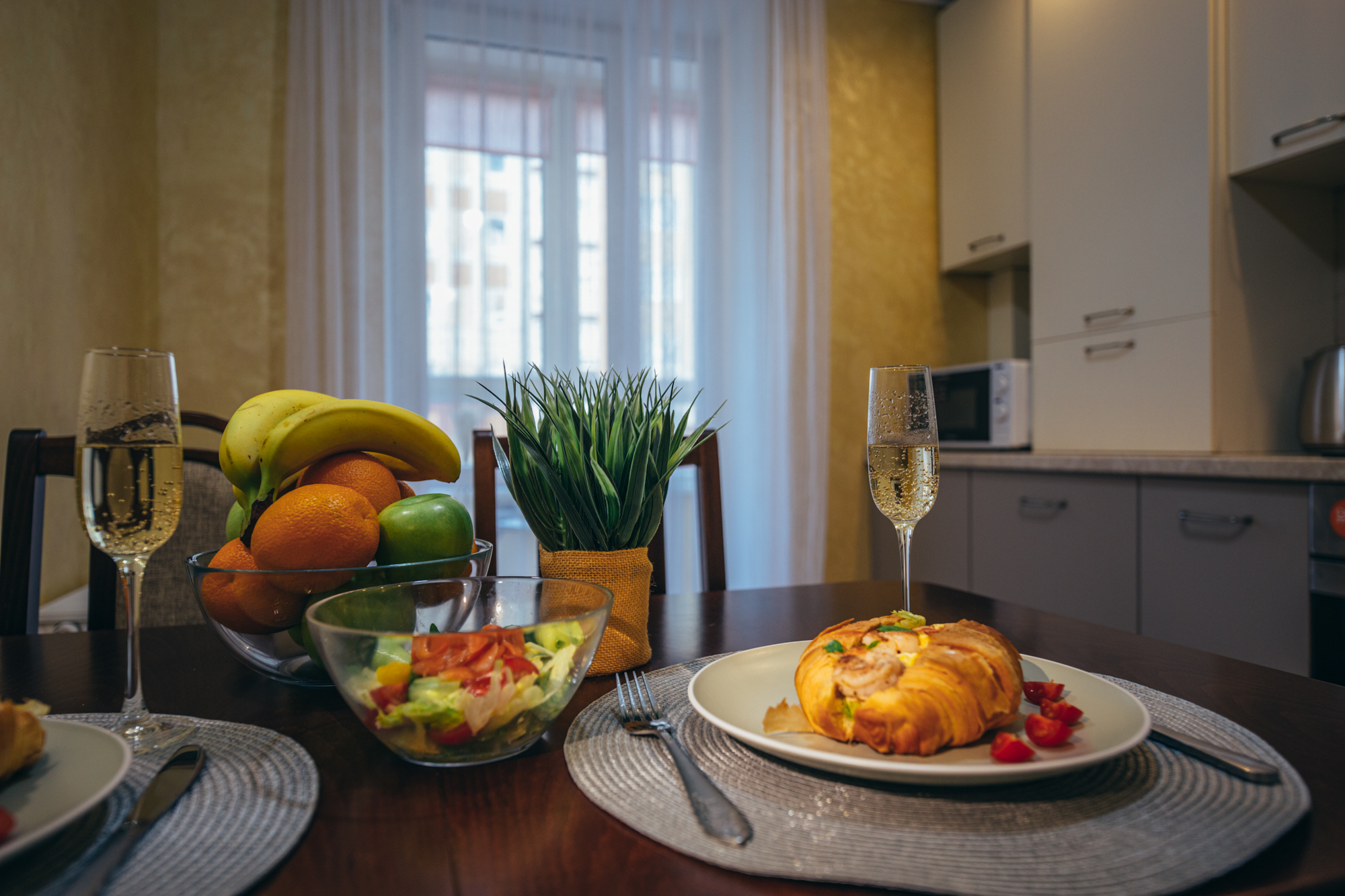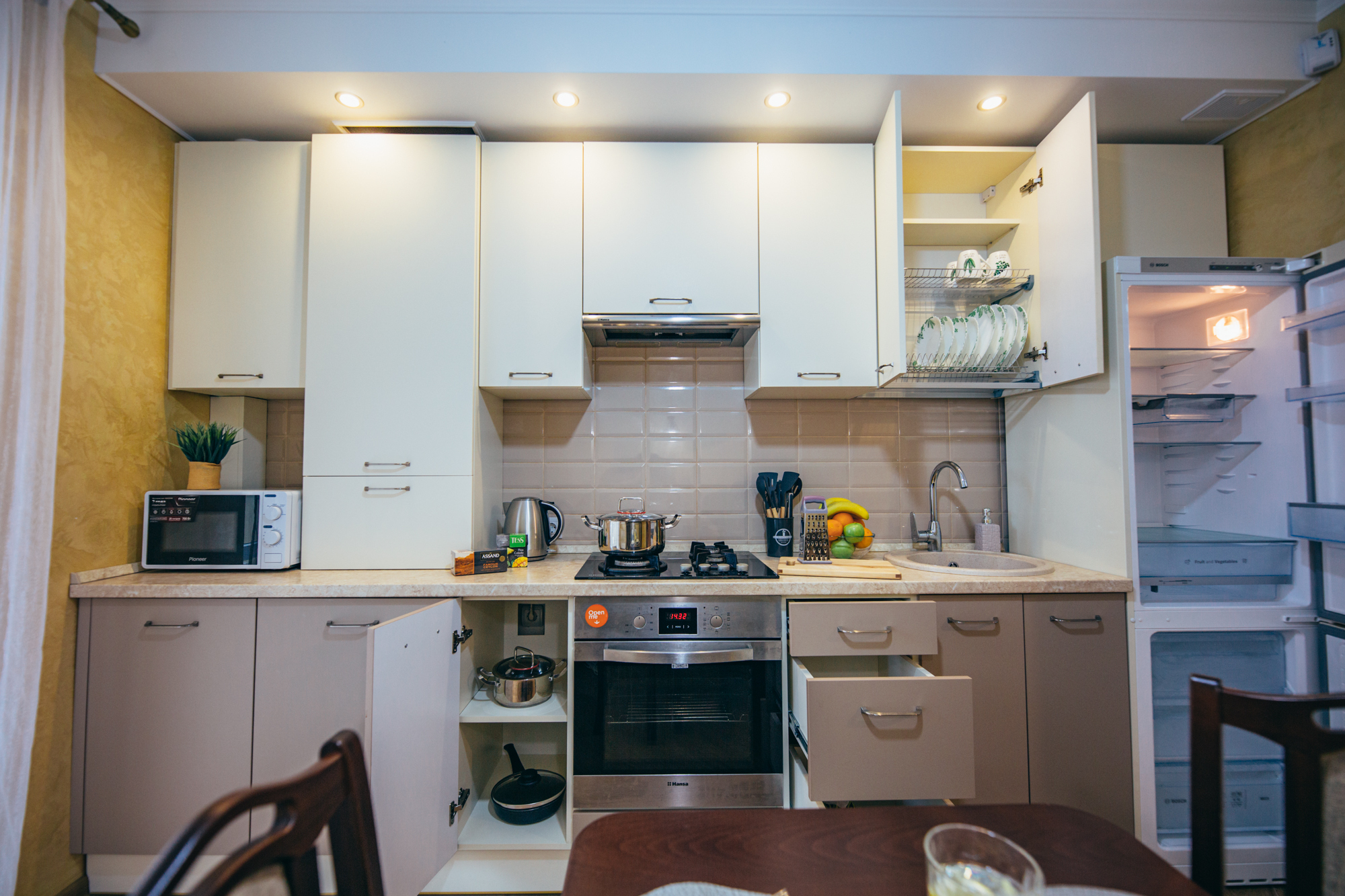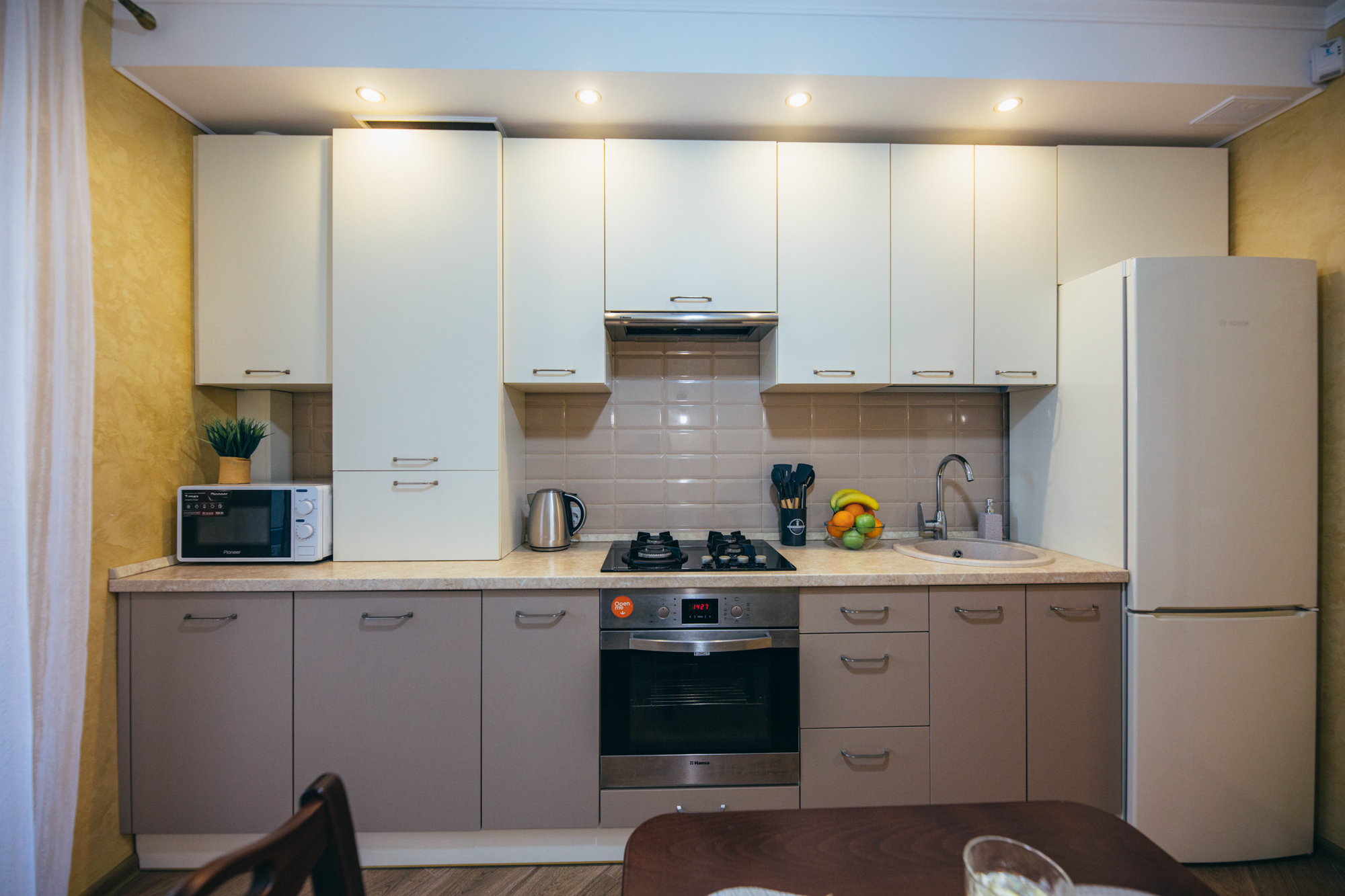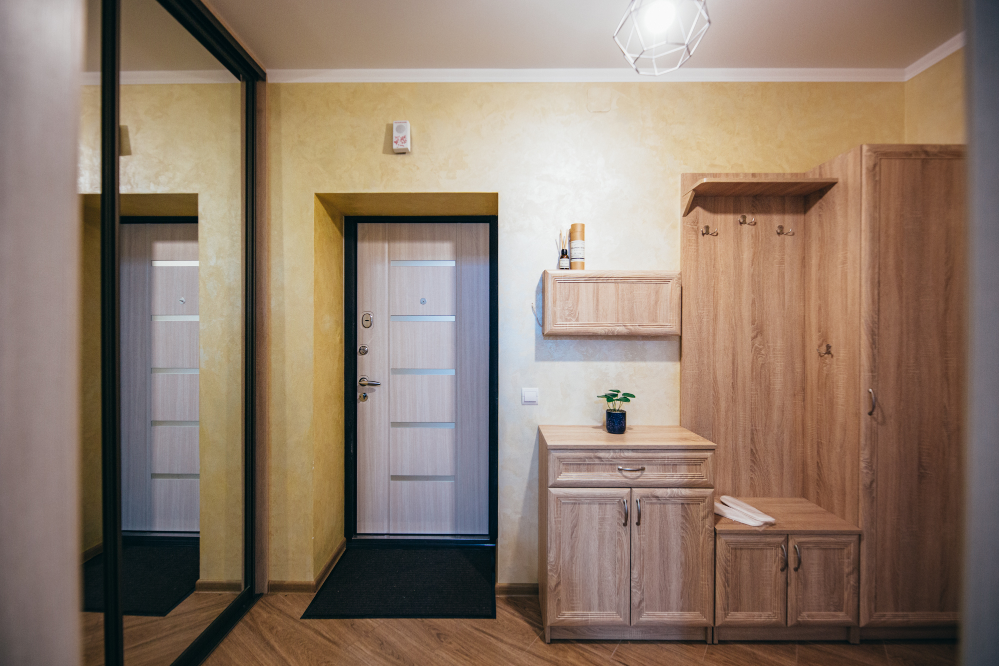 В номере: вешалка, диван, зеркало, кровать двуспальная, кухонная мебель, прикроватные тумбочки, стол, стулья, шкаф, кондиционер, микроволновая печь, стиральная машина, телевизор, утюг, холодильник