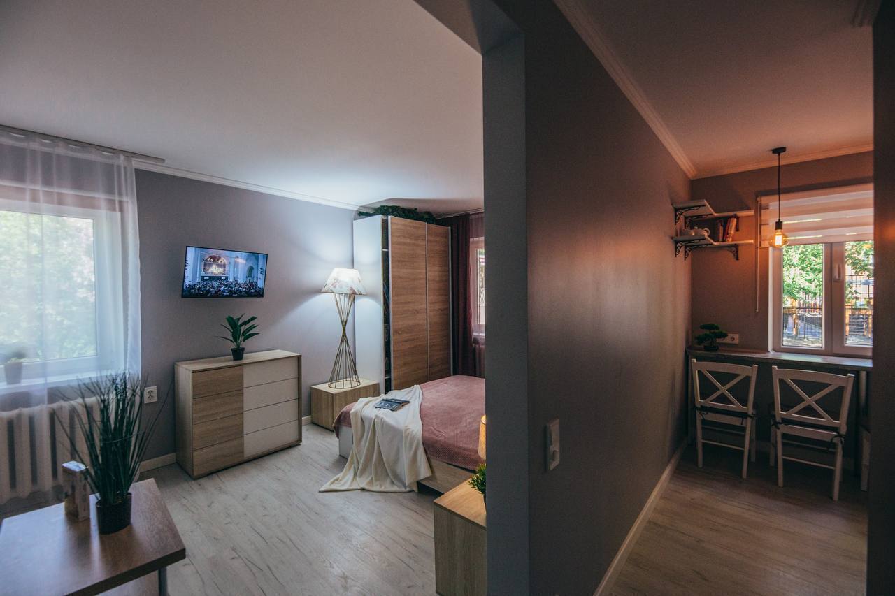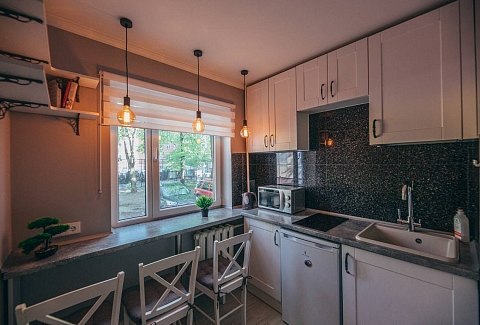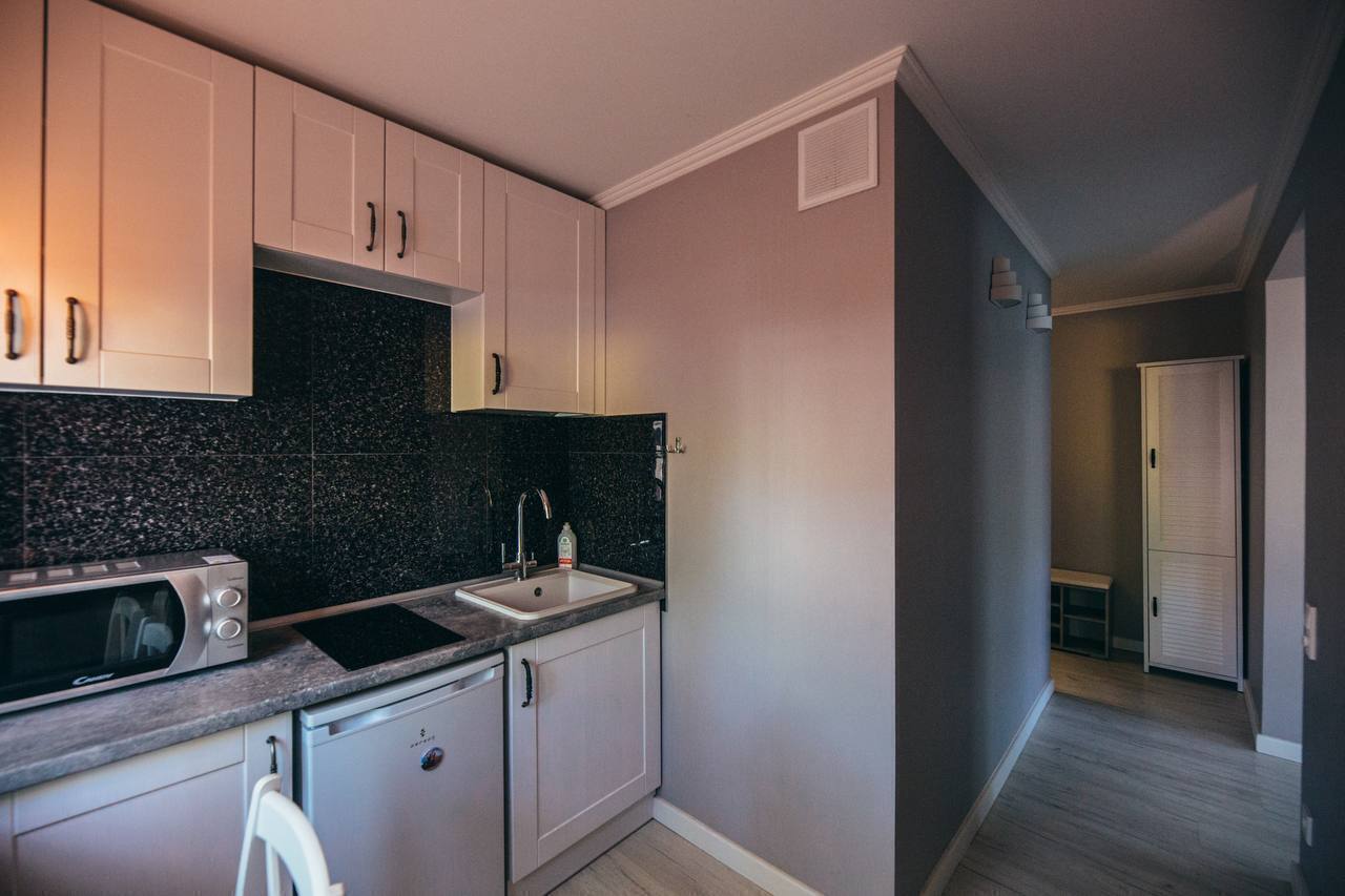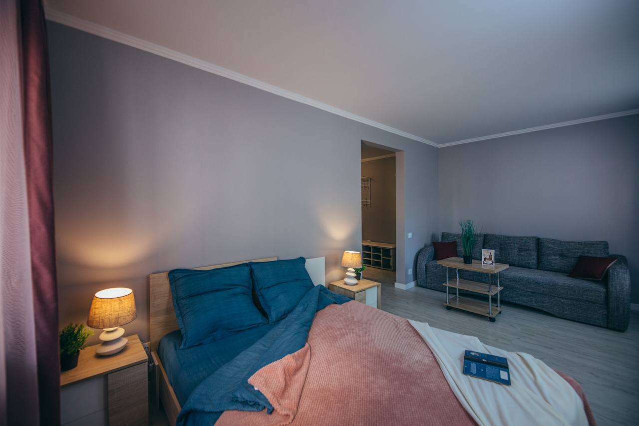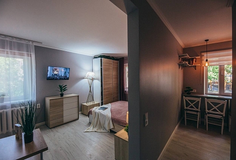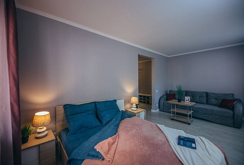 Апартаменты представляют собой полностью оборудованное жилье с продуманной планировкой. В просторной комнате есть удобная двуспальная кровать, мягкий диван, обеденный стол и телевизор. Интерьер выполнен в спокойных тонах, располагающих к отдыху.Кухня оснащена всей необходимой техникой и посудой для приготовления еды. Санузел с душевой кабиной укомплектован полотенцами и средствами гигиены. В апартаментах поддерживается идеальная чистота. В помещении есть кондиционер и хорошая шумоизоляция для спокойного отдыха. Для гостей с автомобилем предусмотрена парковка неподалеку.«Домлин на Севастьянова 22» — это комфортный вариант для временного проживания в Калининграде, где есть все необходимое для приятного пребывания.