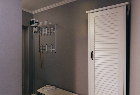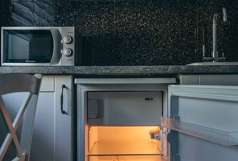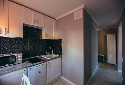 В номере: вешалка, диван, зеркало, кровать двуспальная, кухонная мебель, прикроватные тумбочки, стол, стулья, шкаф, микроволновая печь, стиральная машина, телевизор, утюг, холодильник