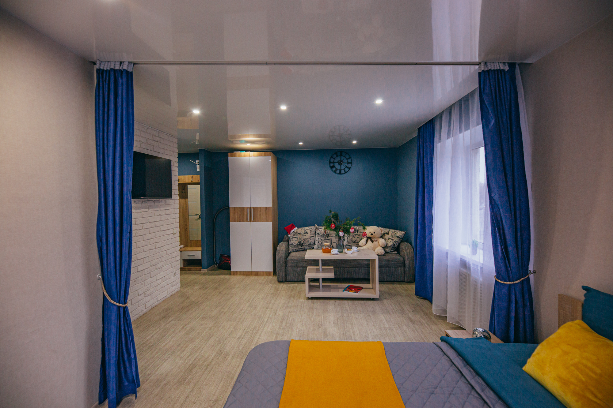 В номере: вешалка, диван, зеркало, кровать двуспальная, кухонная мебель, прикроватные тумбочки, стол, стулья, шкаф, кондиционер, микроволновая печь, стиральная машина, телевизор, утюг, холодильник