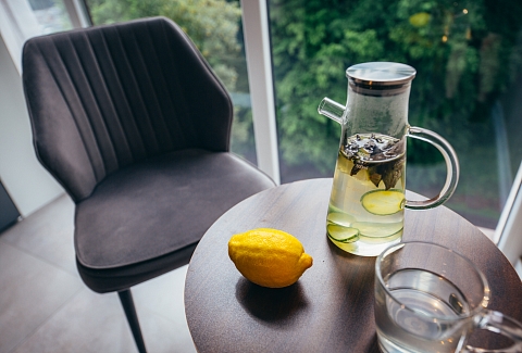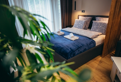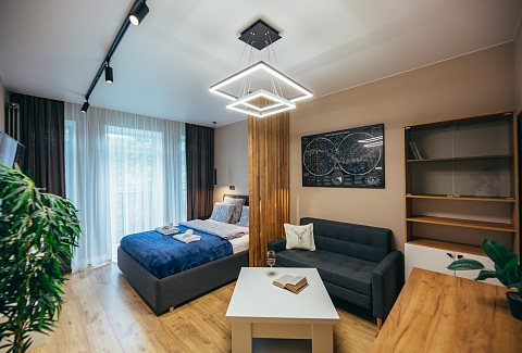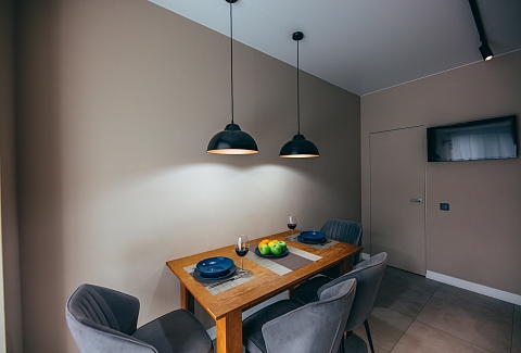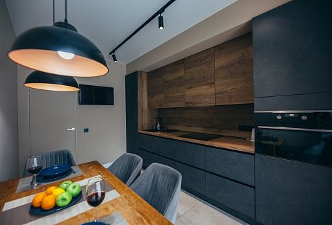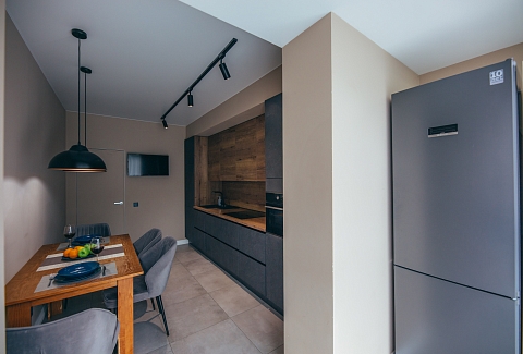 В номере: вешалка, диван, зеркало, кровать двуспальная, кухонная мебель, прикроватные тумбочки, стол, стулья, шкаф, кондиционер, микроволновая печь, посудомоечная машина, стиральная машина, телевизор, утюг, холодильник
