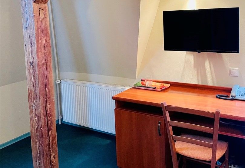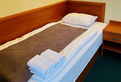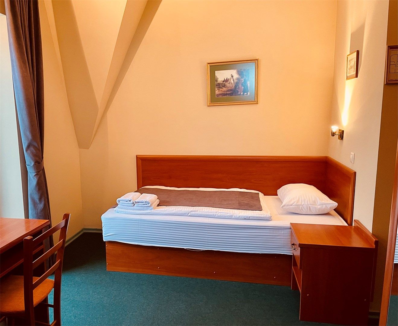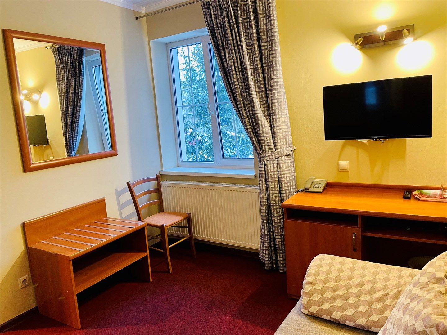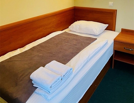 В номере: кровать односпальная, стол, стулья, шкаф, вентилятор, мини-холодильник, сейф, телевизор, телефон