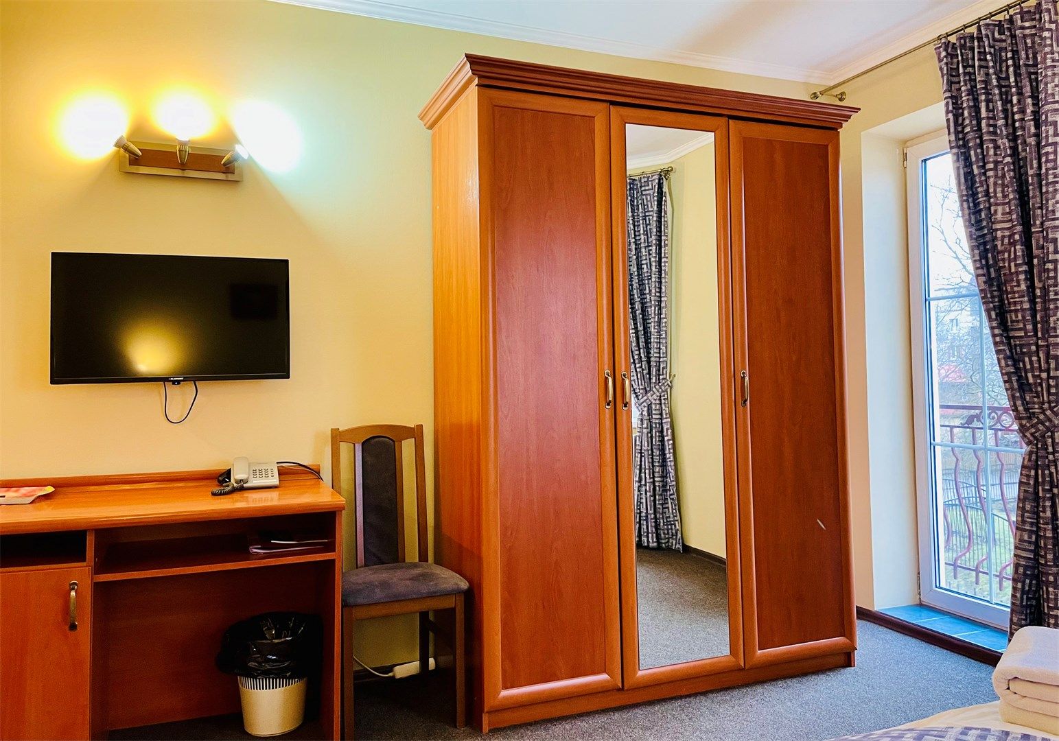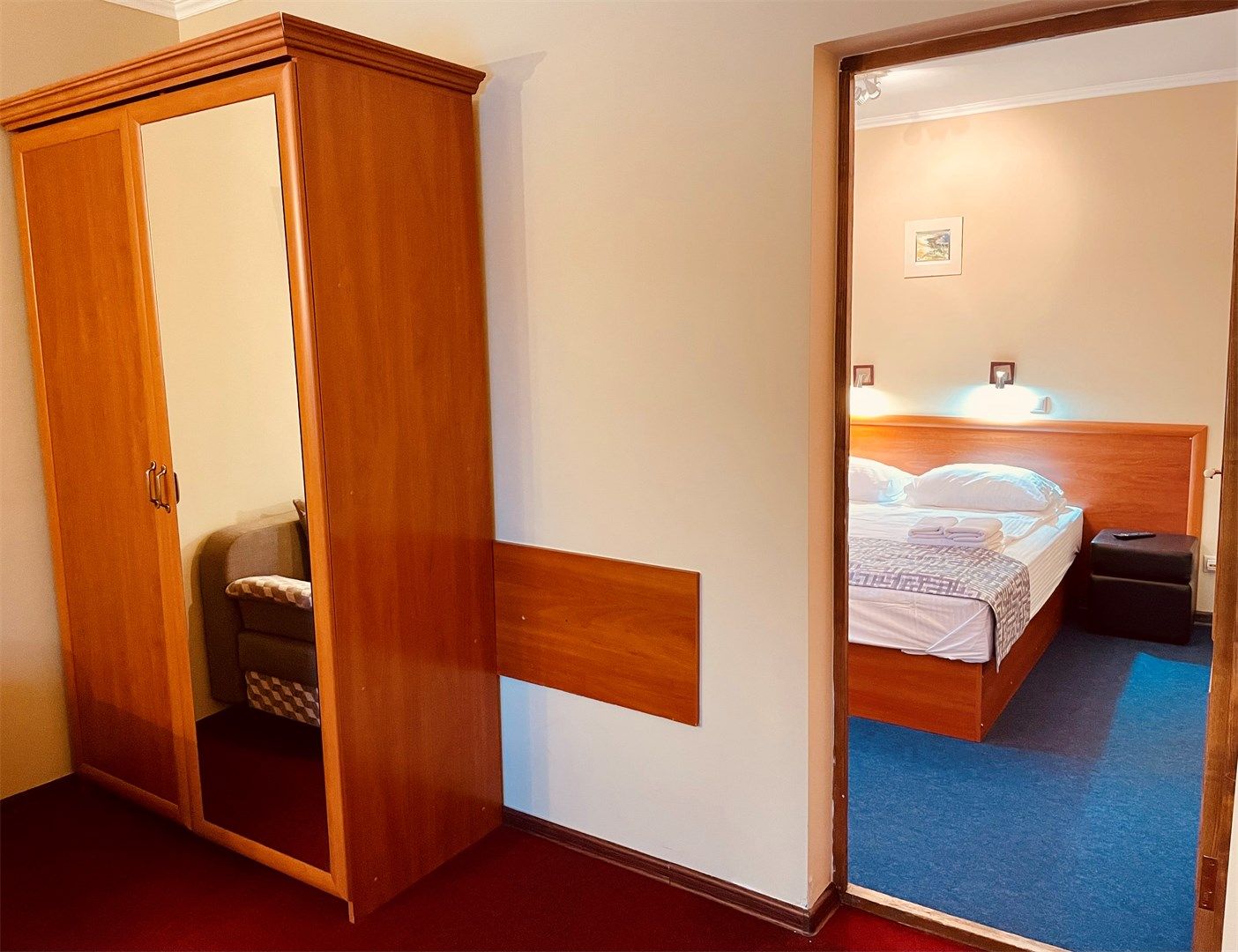 В номере: вешалка, диван, зеркало, кровать двуспальная, прикроватные тумбочки, стол, стулья, шкаф, вентилятор, мини-холодильник, сейф, телевизор, телефон