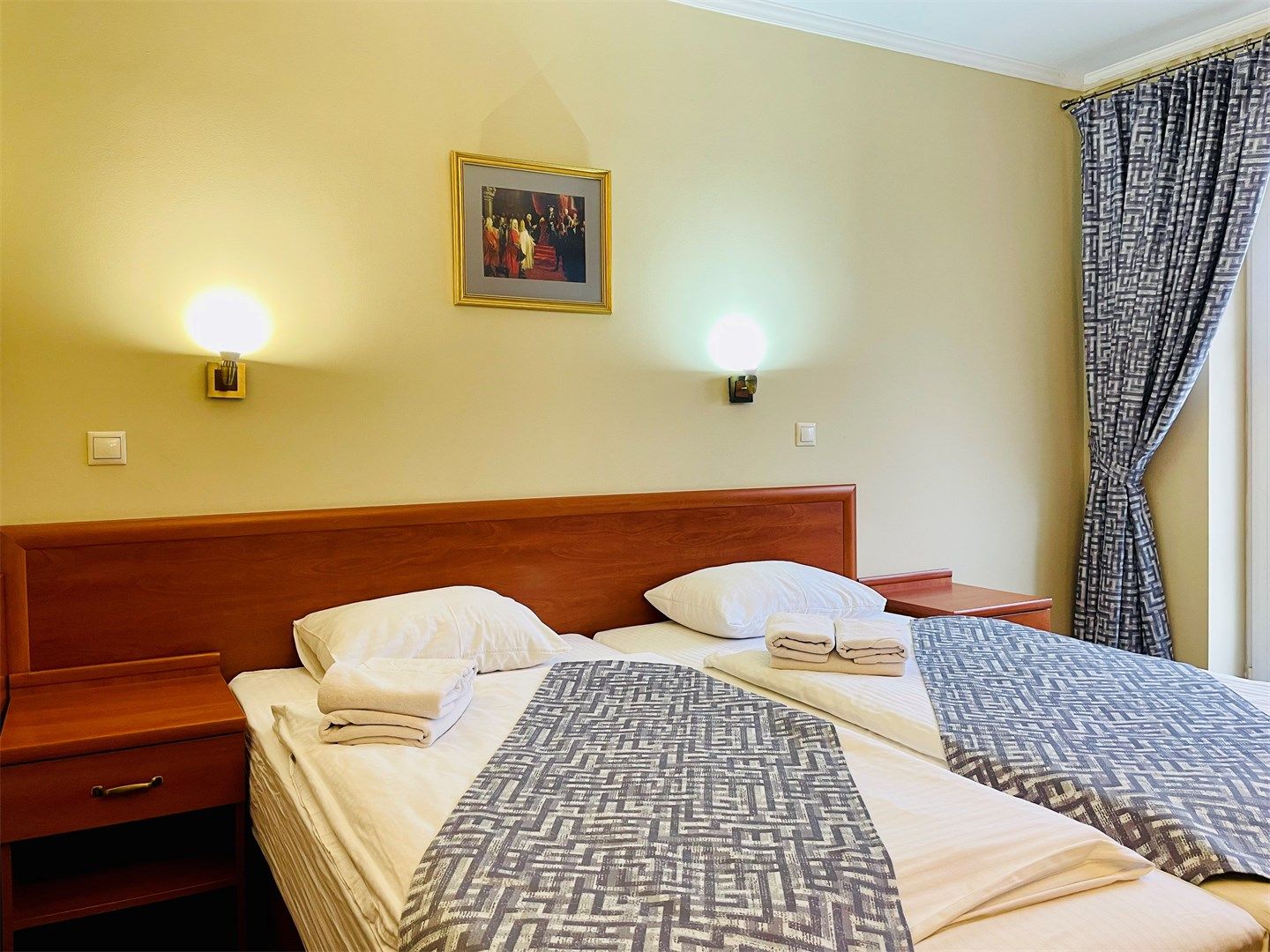 В номере: вешалка, диван, зеркало, кровати односпальные /одна двуспальная кровать, прикроватные тумбочки, стол, стулья, шкаф, вентилятор, мини-холодильник, сейф, телевизор, телефон