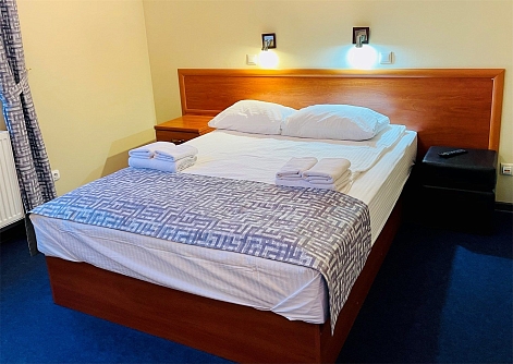 В номере: вешалка, зеркало, кровать двуспальная, прикроватные тумбочки, стол, стулья, шкаф, вентилятор, мини-холодильник, сейф, телевизор, телефон