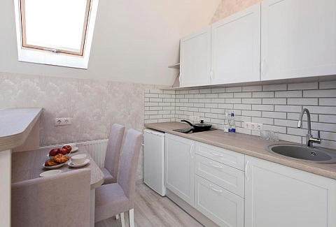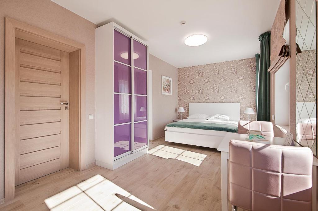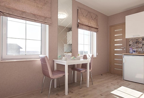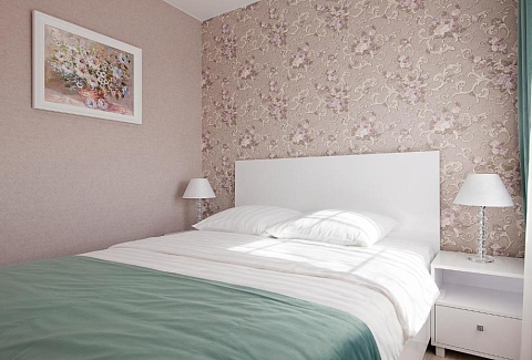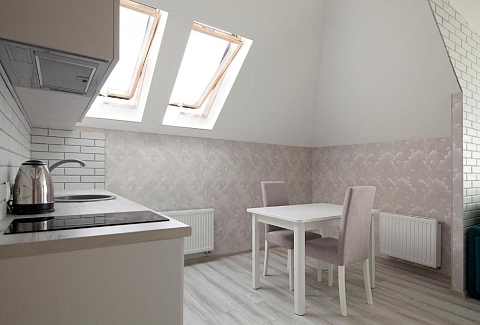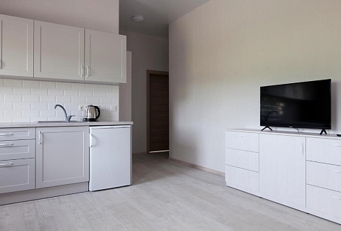 В номере: вешалка, зеркало, кровать двуспальная, прикроватные тумбочки, стол, стулья, шкаф, набор посуды, плита электрическая, сейф, стиральная машина, телевизор, телефон, холодильник, электрочайник