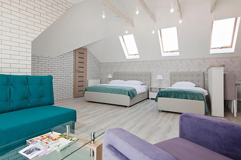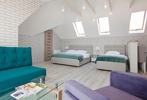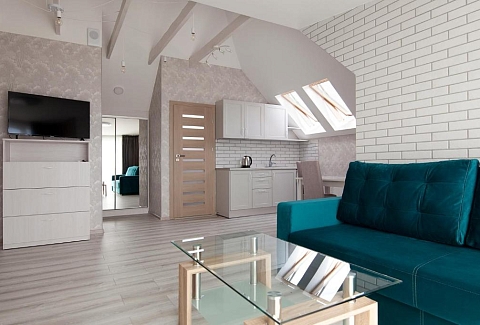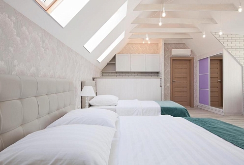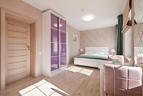 В номере: вешалка, диван раскладной, зеркало, комод, кровать двуспальная, кровать односпальная, прикроватные тумбочки, стол, стулья, шкаф, набор посуды, плита электрическая, сейф, сплит-система, стиральная машина, телевизор, телефон, холодильник, чайный набор посуды, электрочайник