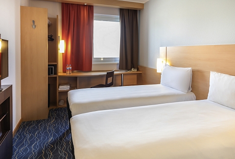 В номере: зеркало, кровати односпальные, прикроватные тумбочки, стол для компьютера, стул, тумба под телевизор, мини-холодильник, телевизор ЖК
